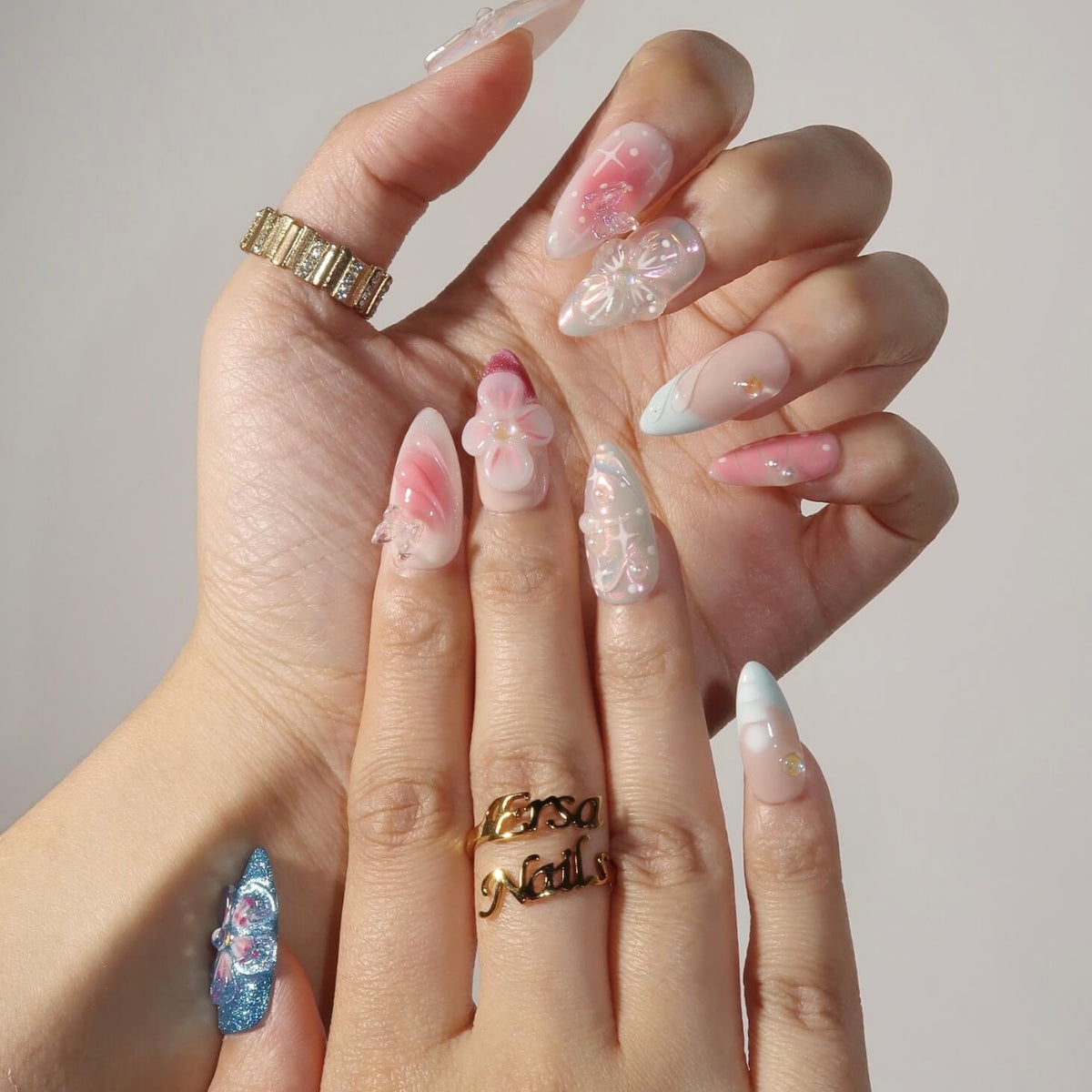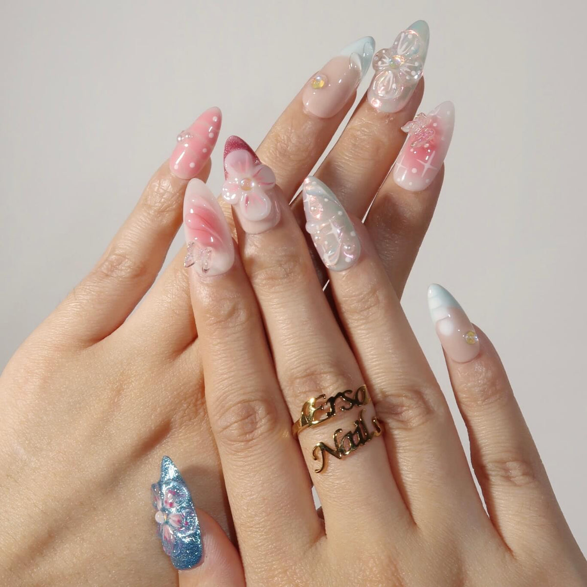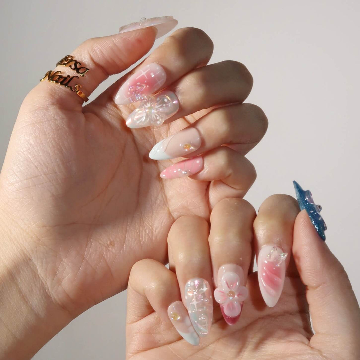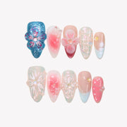 Embrace a dreamy look with the Dream Bouquet press-on nails from swara Nails. Featuring a stunning chrome finish, this design blends soft hues of blue, pink, and white for a whimsical, ethereal vibe. 3D floral accents, mermaid-inspired designs, and delicate butterflies add enchanting details to each nail. The French tip design combined with a gentle pink ombré effect creates a romantic and refined look, perfect for any occasion. Dream Bouquet is the ultimate choice for those seeking a magical and elegant touch to their nails.