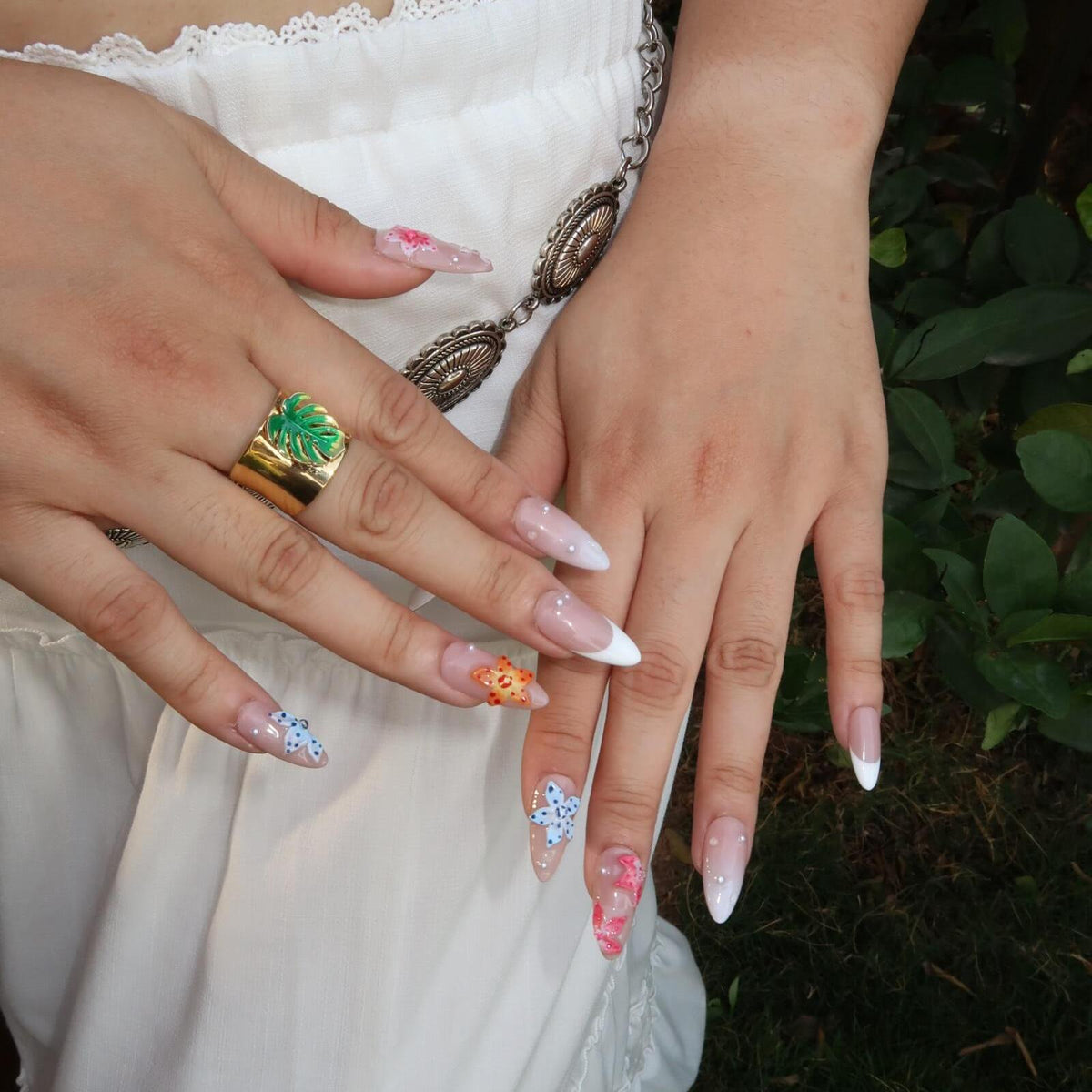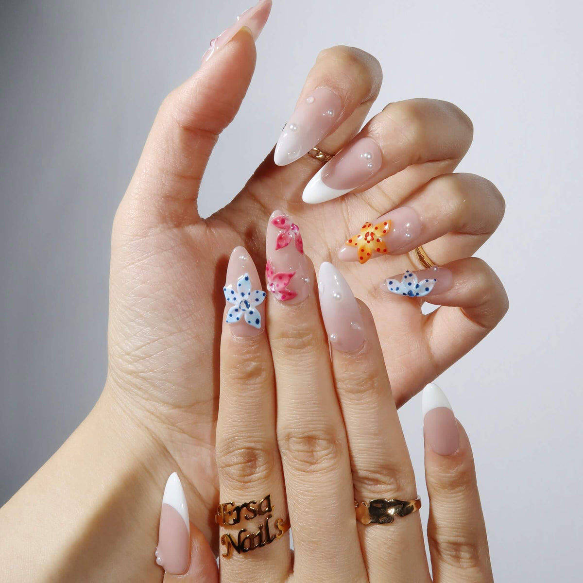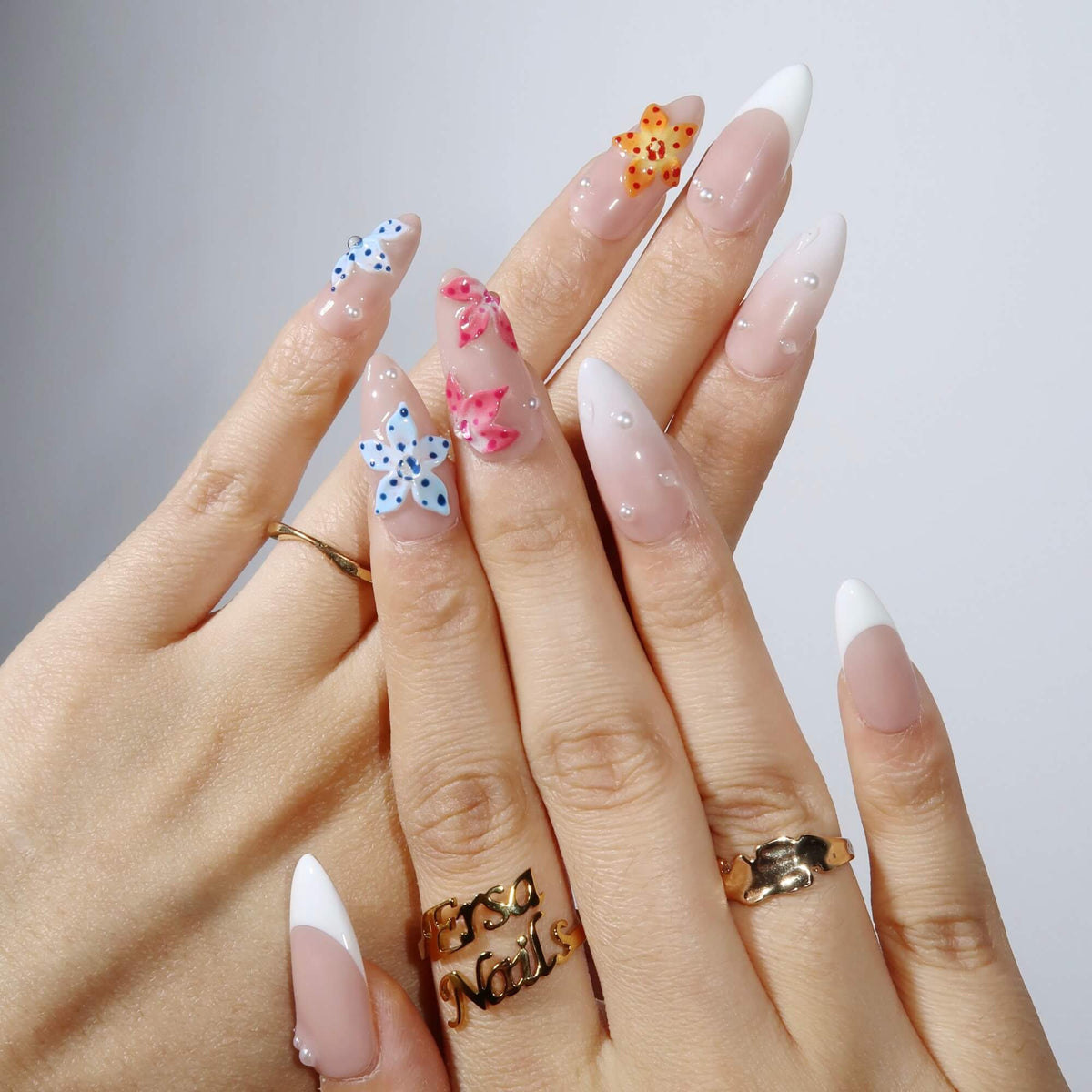 Embrace the beauty of spring with Full Bloom press-on nails from swara Nails. Featuring a nude base and a white French tip design, these nails are adorned with 3D pink, blue, and yellow flowers, creating a vibrant and fresh look. Enhance your style with delicate pearl accents that add an extra touch of elegance. Perfect for any occasion, Full Bloom brings a burst of color and femininity to your nail art collection.