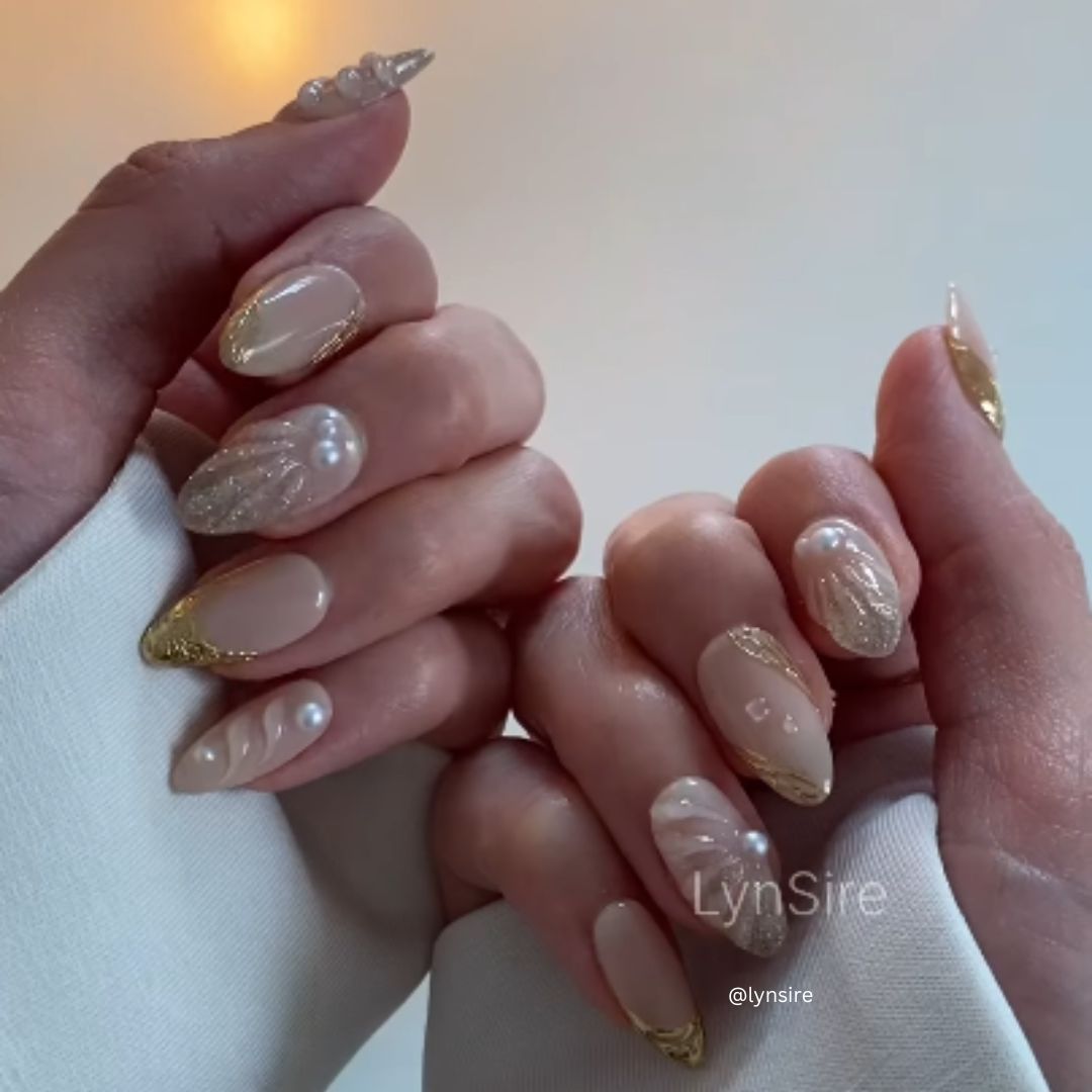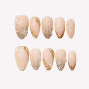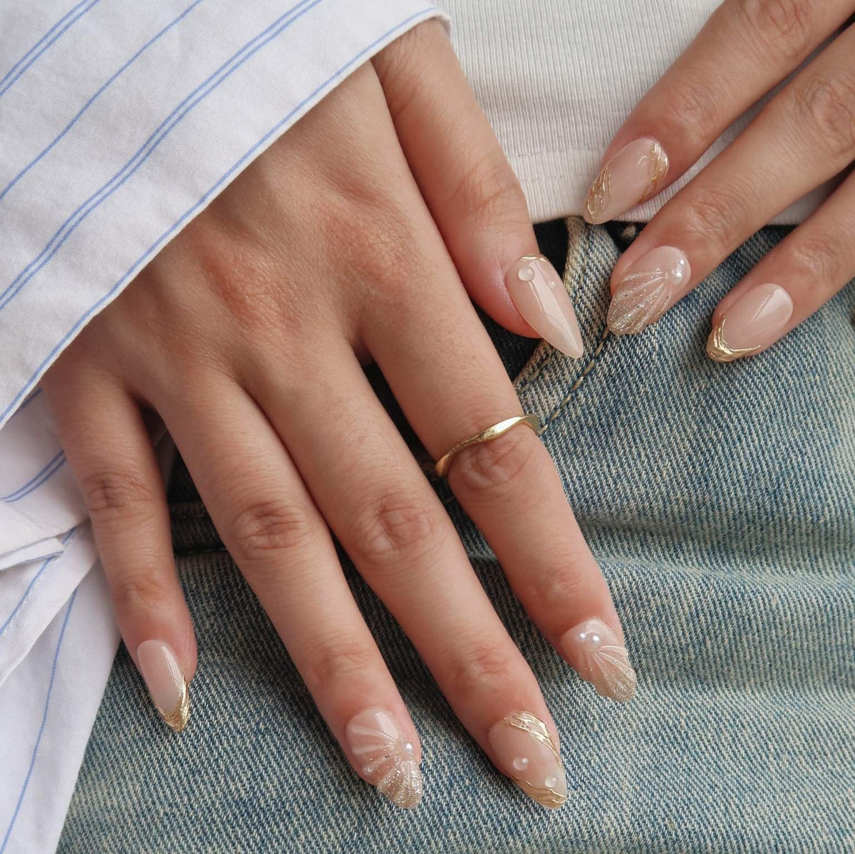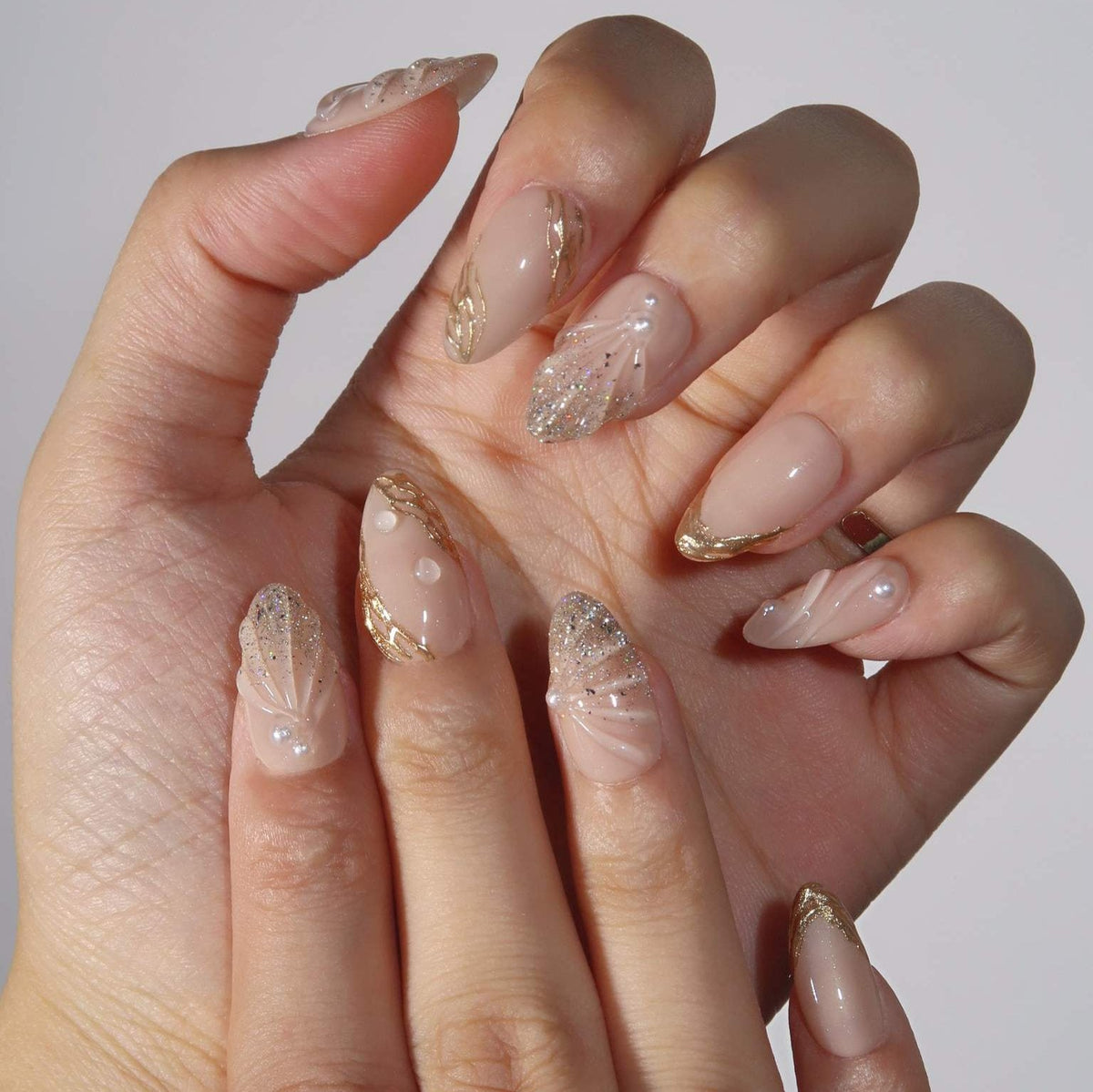Step into the golden hour with Glowing Beach Press-on Nails by Ersa Nails. This set features a chic nude base, elegantly highlighted by delicate gold lines that shimmer like sunlit waves. The tips are adorned with a stunning silver glitter gradient, adding a touch of sparkling allure to your look. Accentuated with pearl embellishments and a 3D mermaid design, Glowing Beach captures the essence of a sun-kissed beach at twilight, blending sophistication with a hint of ocean magic. Perfect for those who want to radiate elegance and capture the glow of a seaside escape.