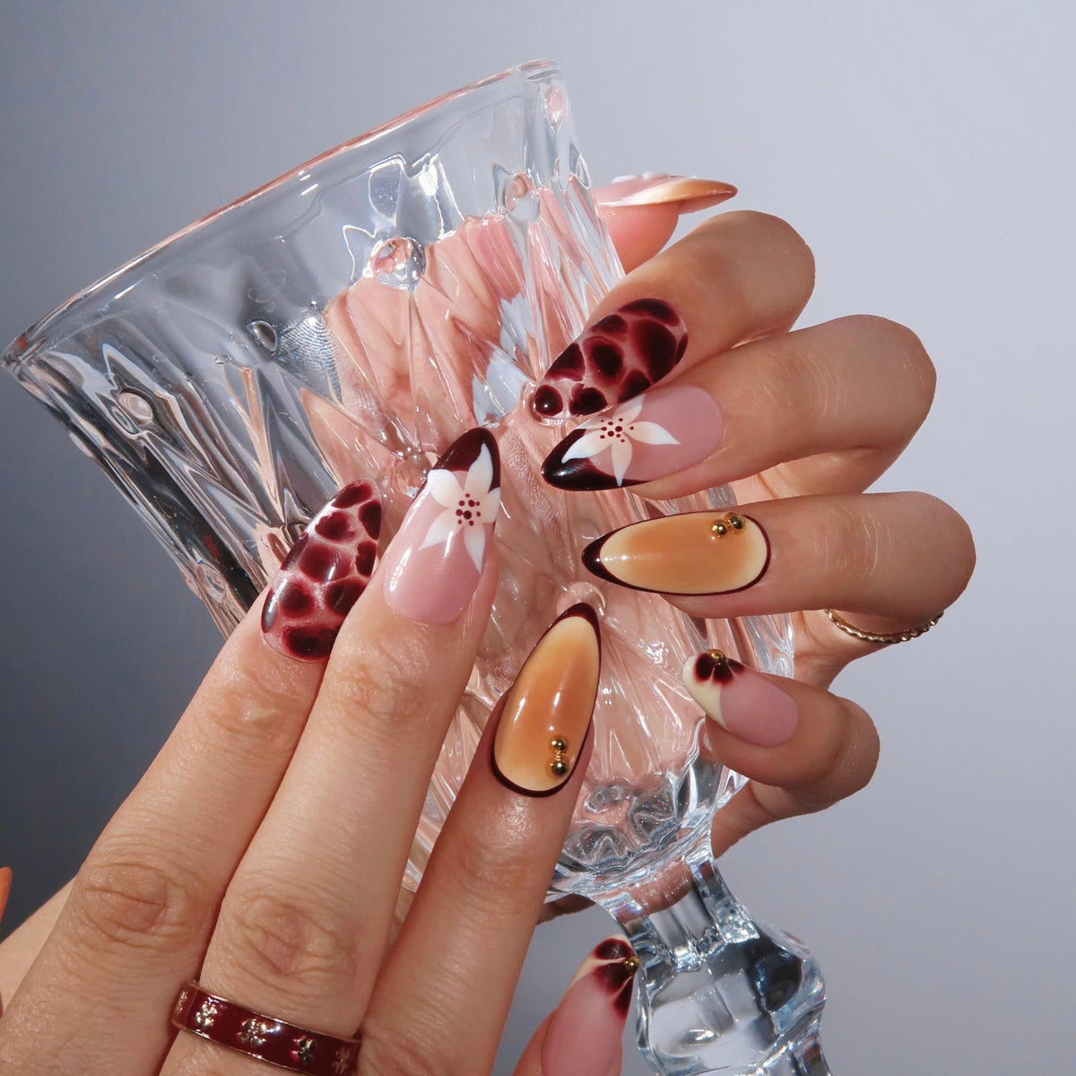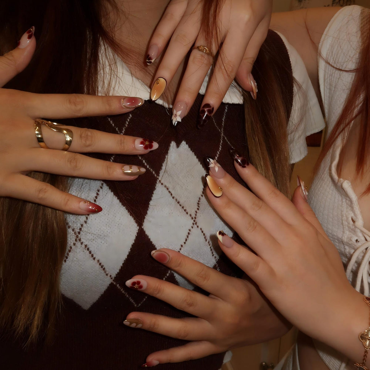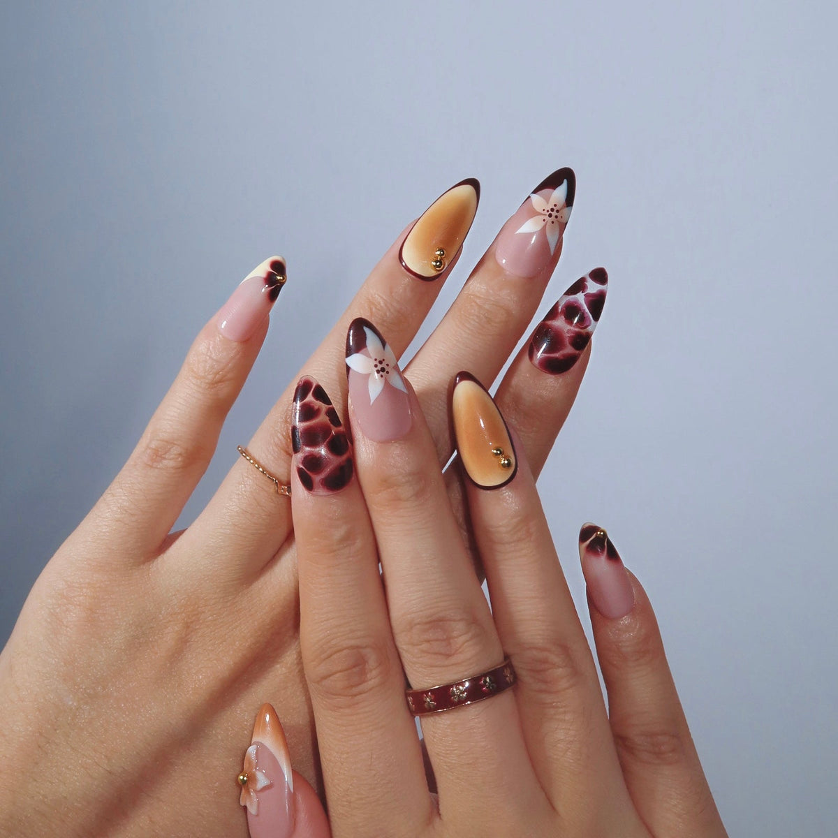 Swara Nails' Honeyed Bloom brings a warm, sunset-inspired vibe to your fingertips. This medium almond set features a soft gradient of honey and amber hues, accentuated with delicate floral designs and rich maroon tones that evoke the romance of a golden hour. Embellished with gold beads and detailed 3D flowers, each nail captures the beauty of blooming petals in the evening light. Perfect for those who want to add a touch of elegance and warmth to their look, Honeyed Bloom is your ideal choice for cozy, stylish moments.