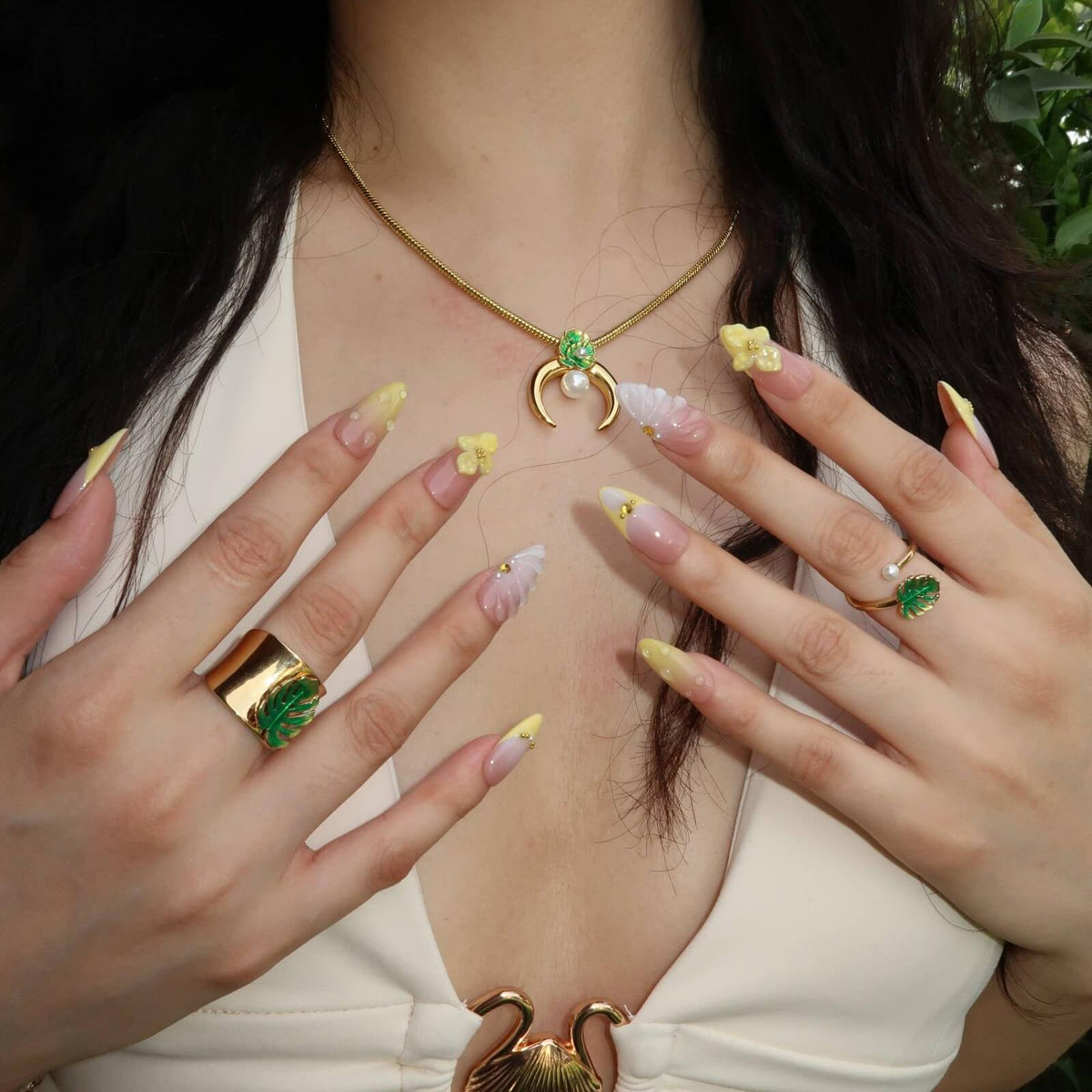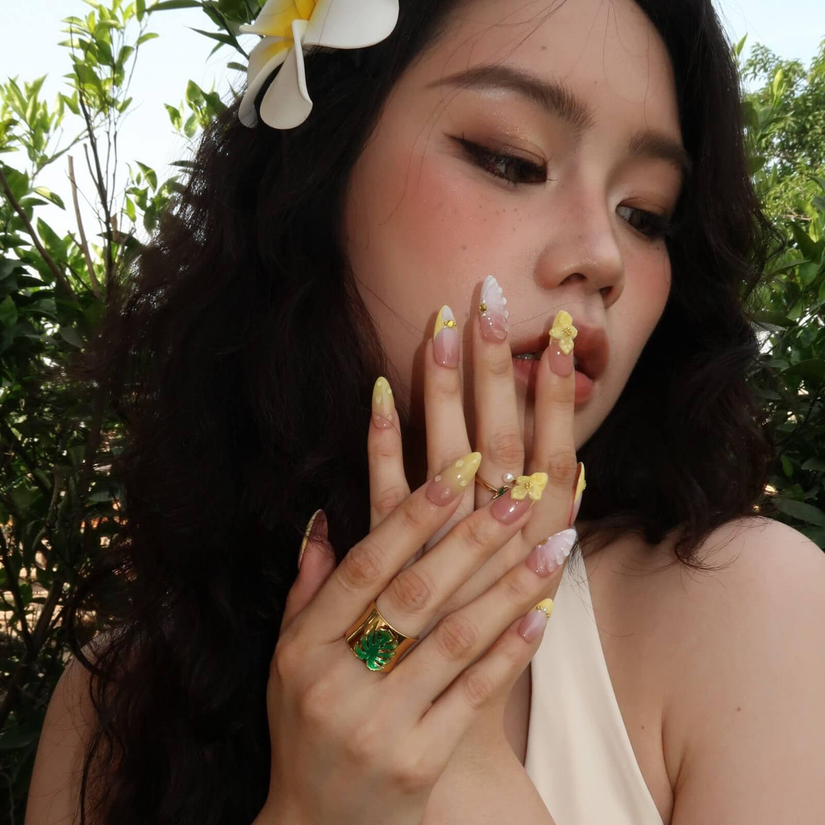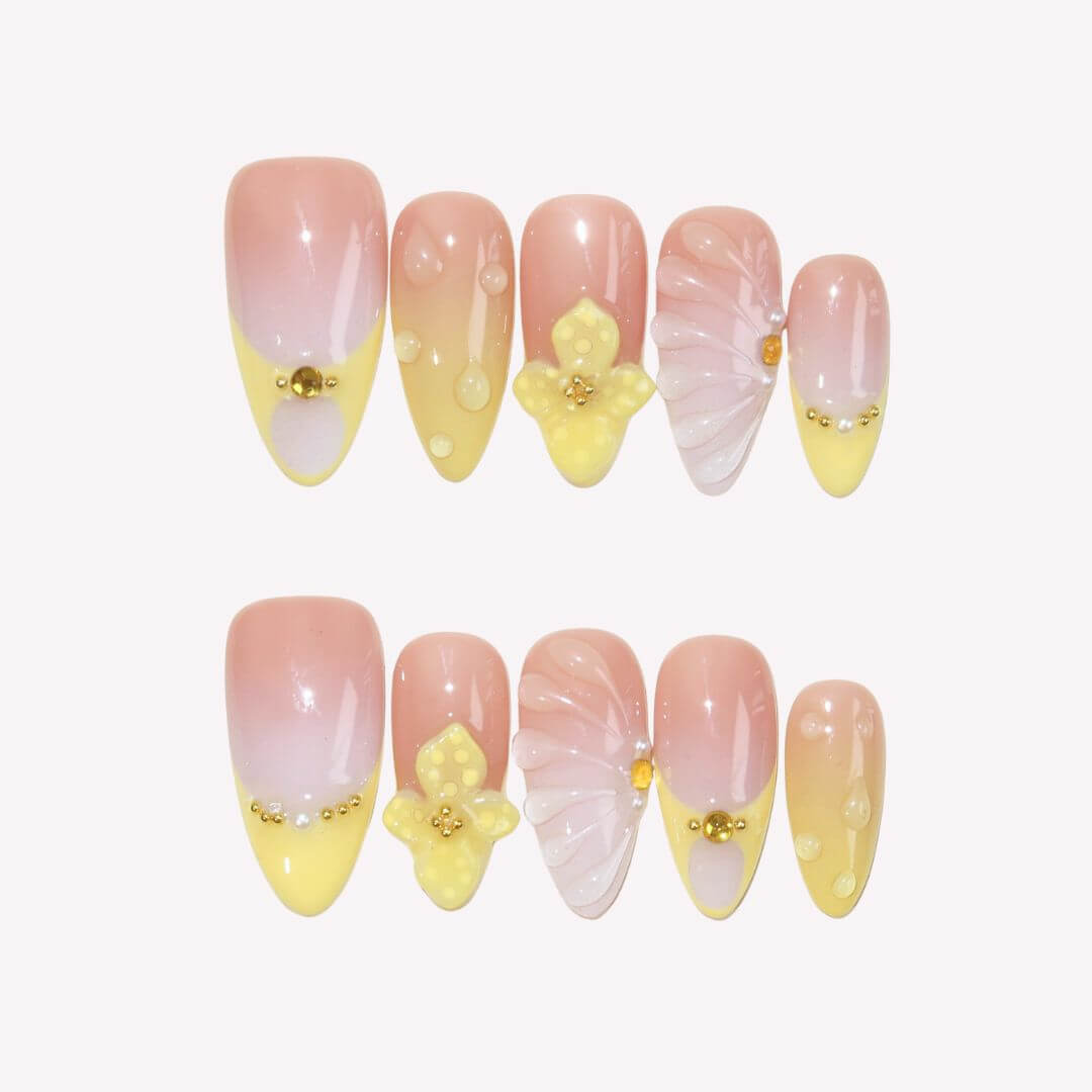 Refresh your look with the Lemon Soda press-on nails from swara Nails. Featuring a nude base with a vibrant yellow hue, these nails capture the essence of summer. The French tip design is enhanced with soft white ombré and accented with delicate 3D flowers, mermaid details, and water droplets. Perfect for adding a fresh, playful touch to any occasion, Lemon Soda is your go-to for a fun, sparkling look.