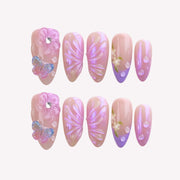Step into a whimsical world with Lilac Elfland Press-on Nails by Swara Nails. This enchanting design features a dreamy lilac color, evoking a sense of ethereal beauty and magic. Adorned with intricate 3D floral details and delicate butterfly accents, these nails capture the essence of a fairy-tale garden. Sparkling water drop embellishments add a touch of mystique, creating a captivating and elegant look. Lilac Elfland brings a mystical charm to your fingertips, making every moment feel magical.