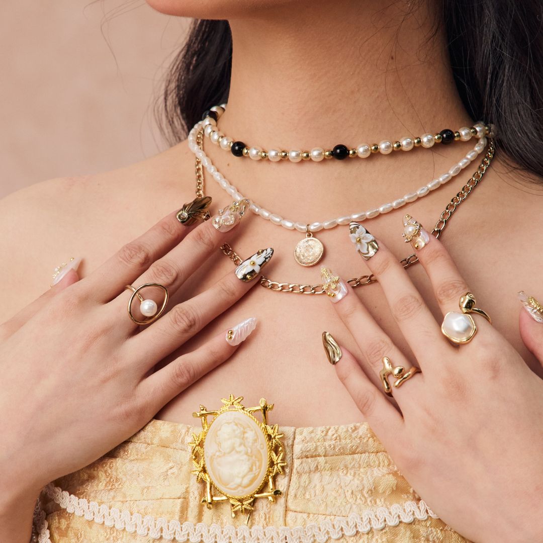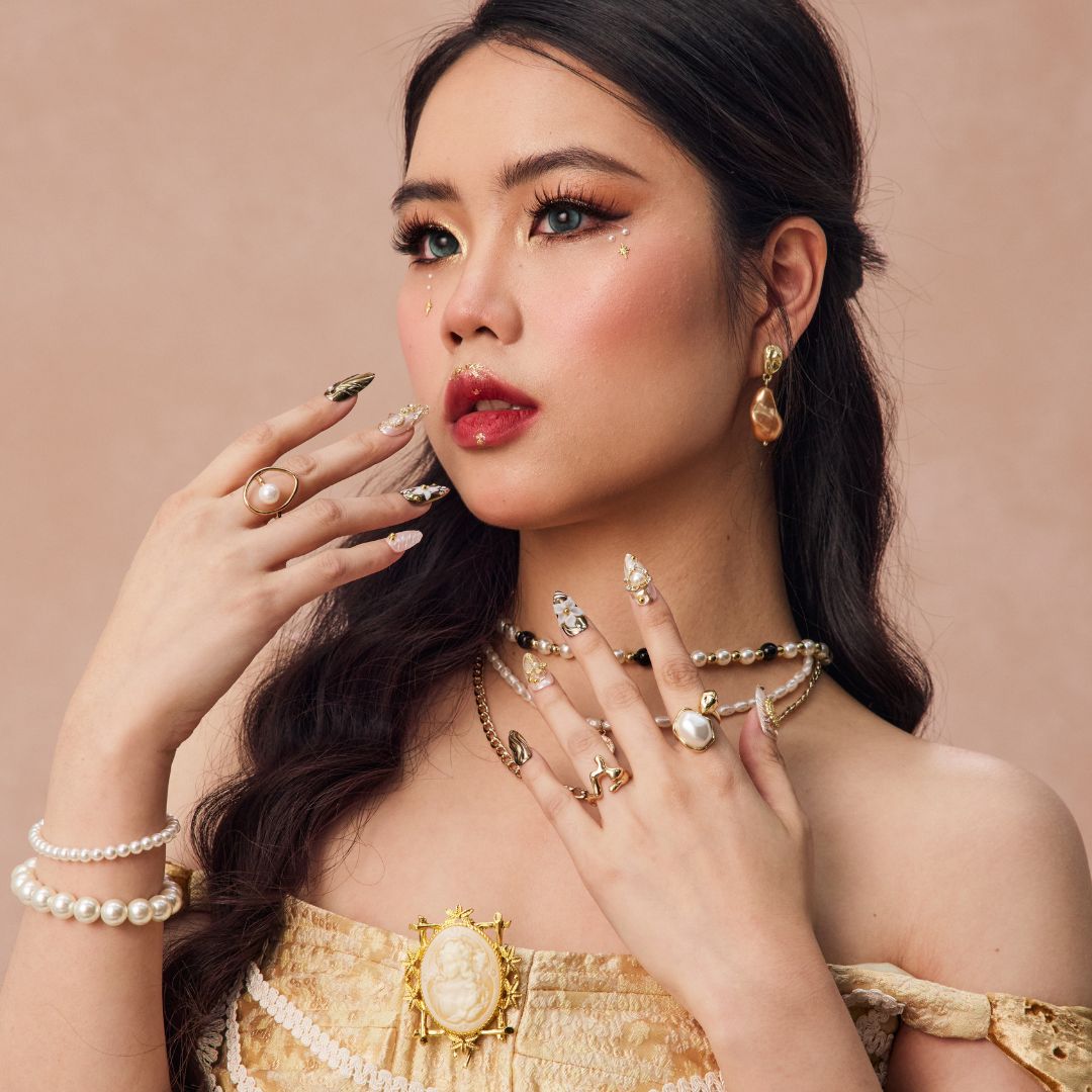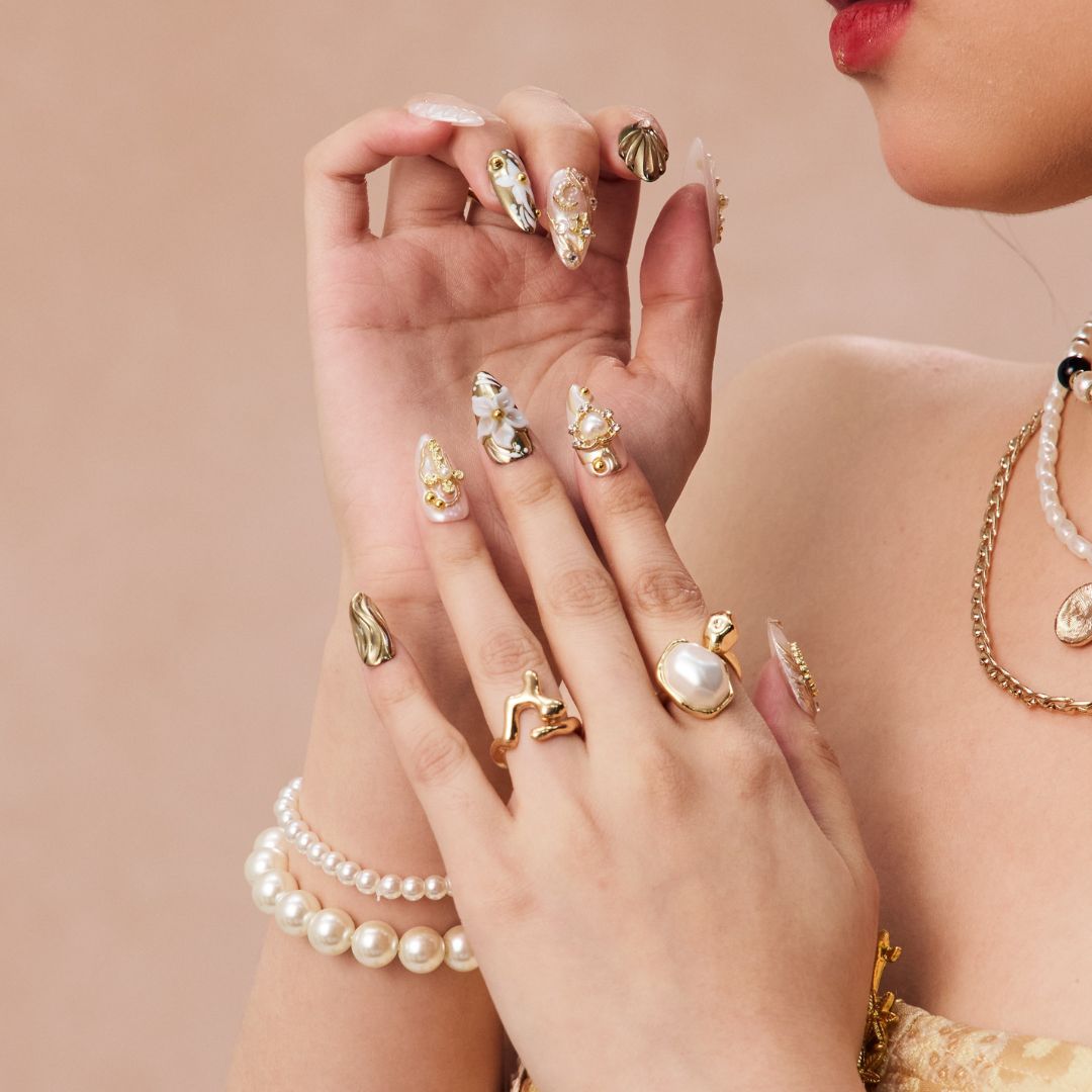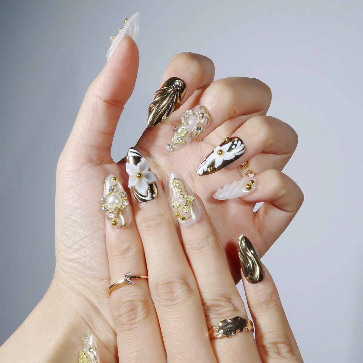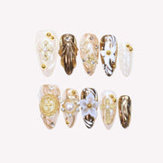 Exude elegance and luxury with Ornament of Grace, a lavishly designed press-on nail set that embodies timeless beauty. The white base gleams with a pearl-like sheen, creating a sophisticated backdrop for stunning gold accents. Intricate golden crosses, hearts, and star embellishments, combined with sparkling diamond details, elevate the design to a new level of opulence. With a 3D mermaid finish adding depth and dimension, this set is perfect for anyone looking to make a statement of grace and grandeur. Whether for a special occasion or a luxurious touch to your everyday look, Ornament of Grace is the epitome of refinement.