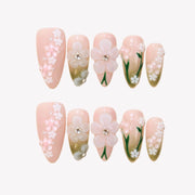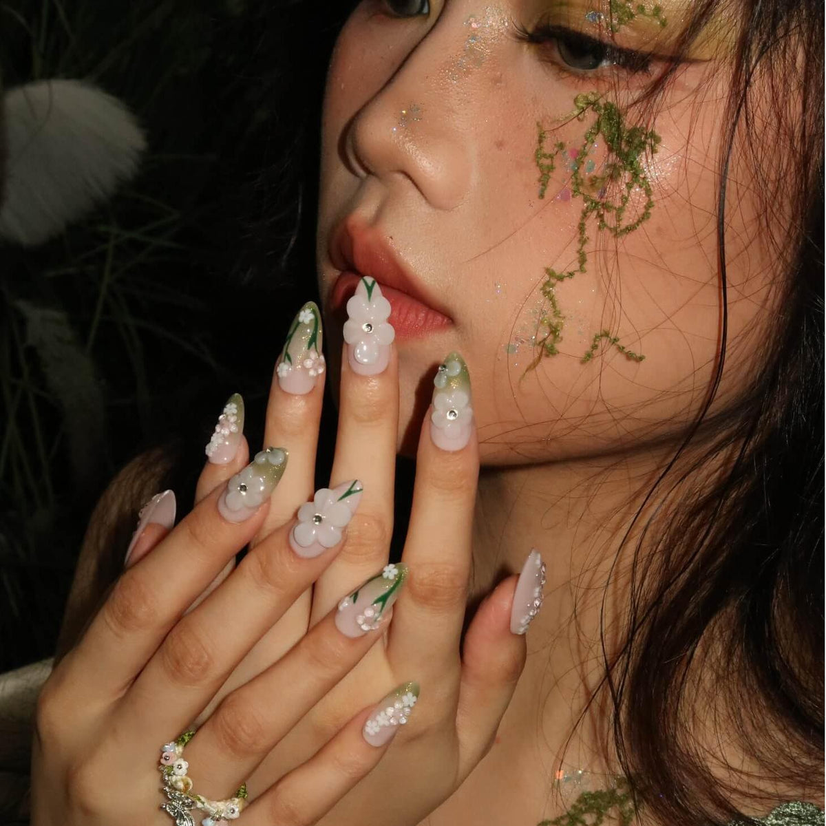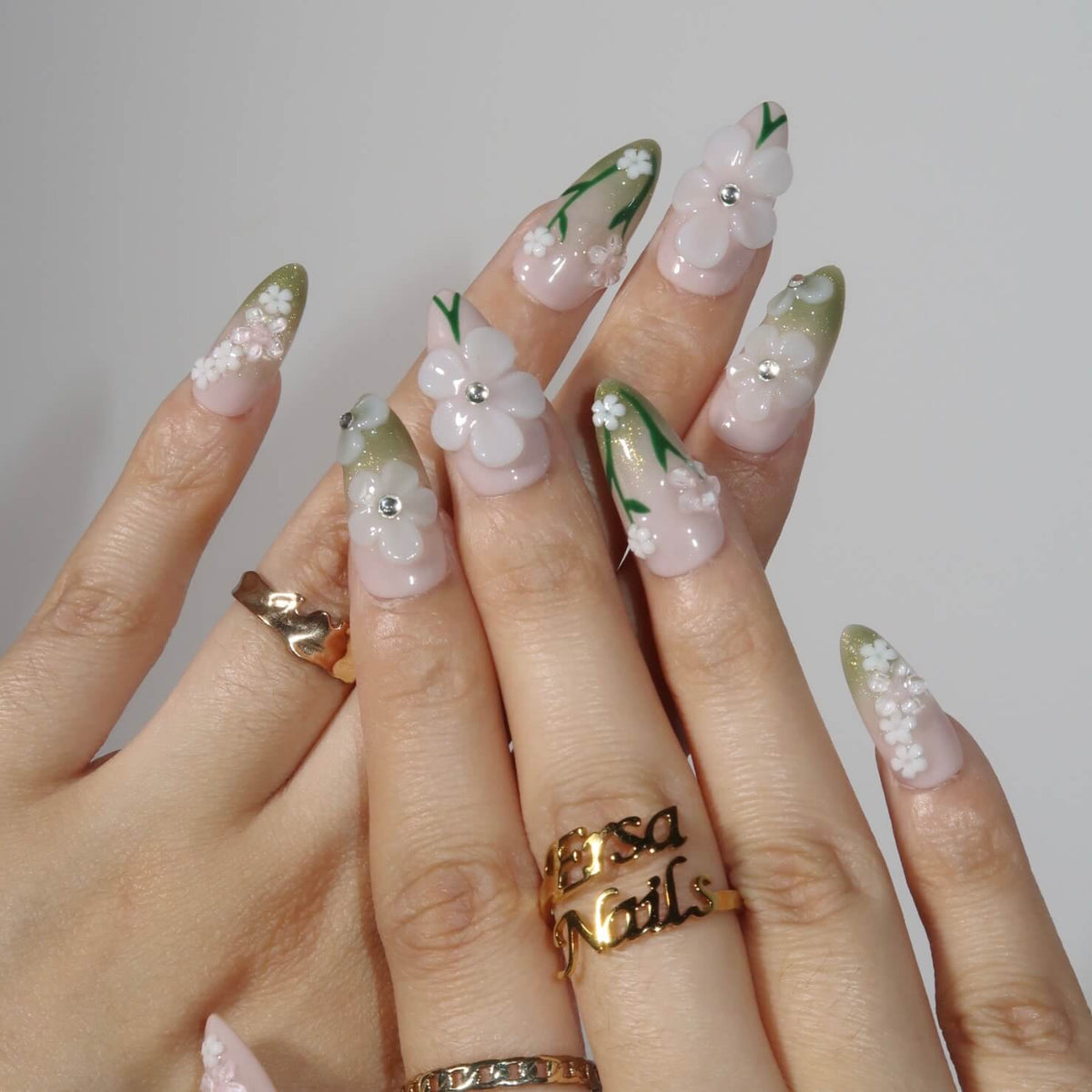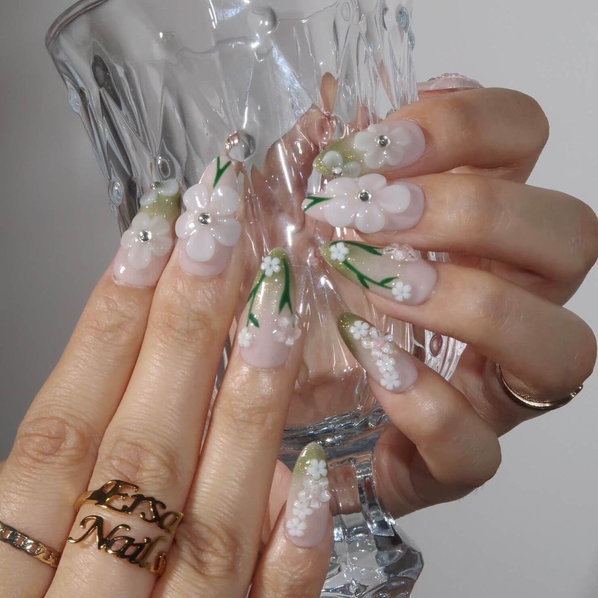 Dance into elegance with swara Nails’ Petal Waltz press-on nails, featuring a soft nude base and a dreamy green shimmer gradient at the tips. Delicate floral patterns, 3D blossoms, and accents of pearls and rhinestones create a harmonious blend of nature and sophistication. Lightweight, durable, and effortlessly stunning, these press-on nails bring instant grace to your fingertips—perfect for any occasion. With Ersa Nails, let your style bloom with every step.