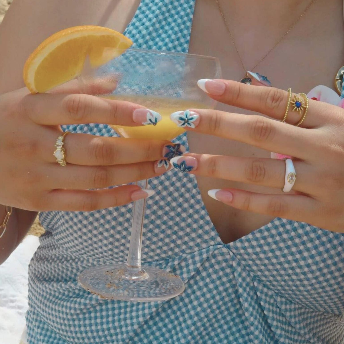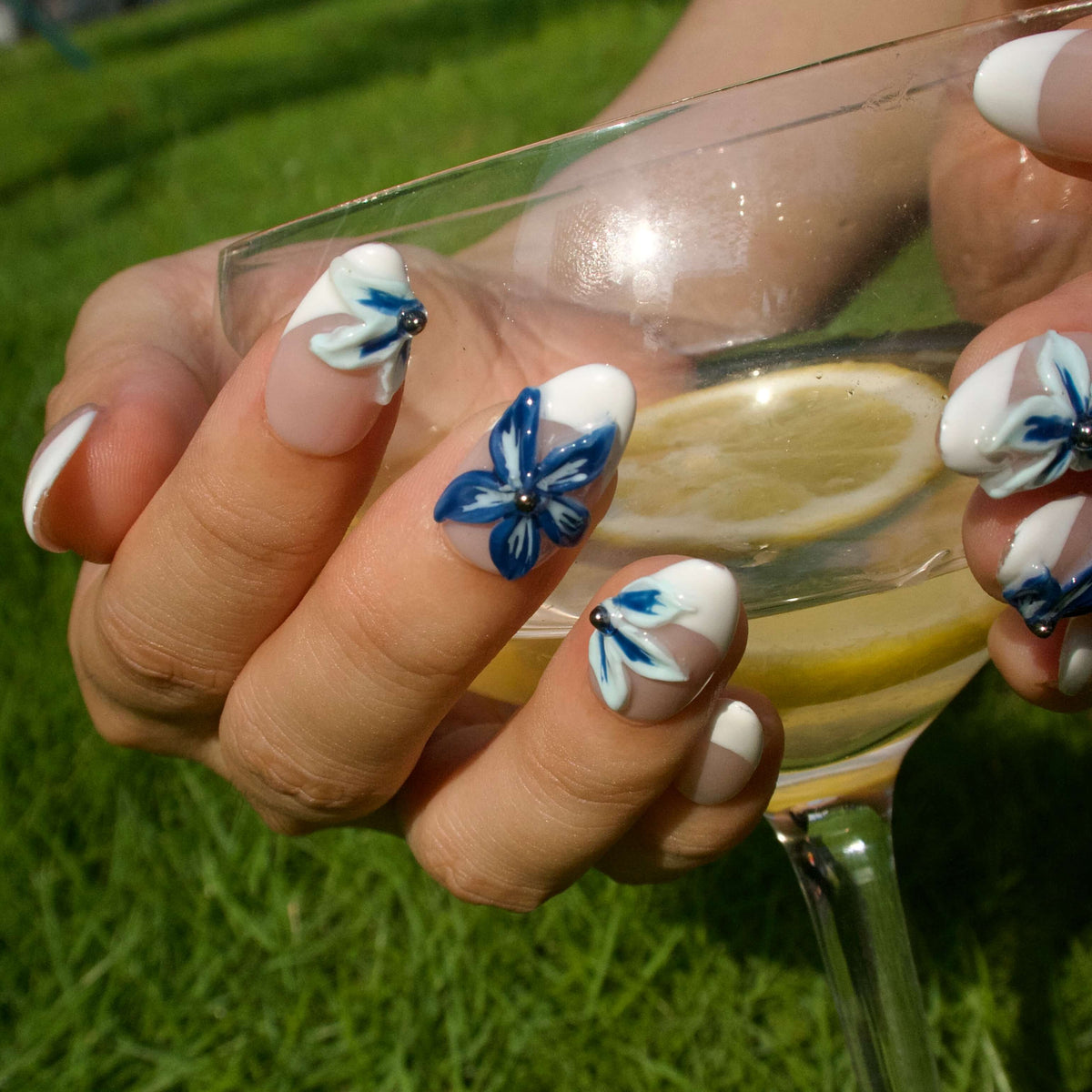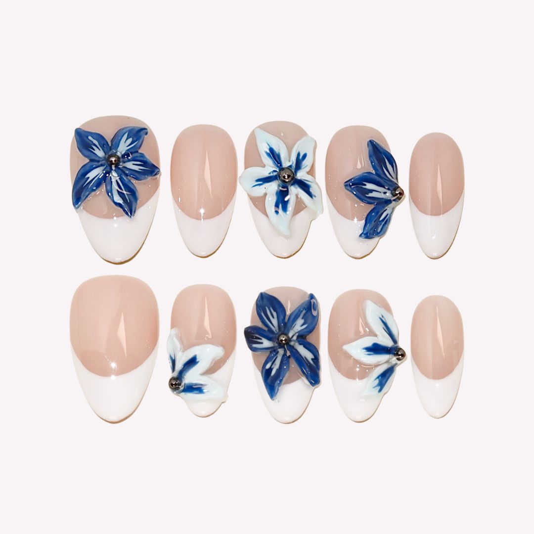 Ride the waves of style with Surf’s Up Press-on Nails by Swara Nails. These nails feature a clean white French tip design, offering a minimalist and elegant look. The addition of 3D blue floral accents adds a touch of oceanic charm, perfect for summer days by the sea. Simple yet stunning, Surf’s Up nails are easy to apply and comfortable to wear, making them the ideal accessory for a fresh and breezy summer vibe.