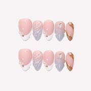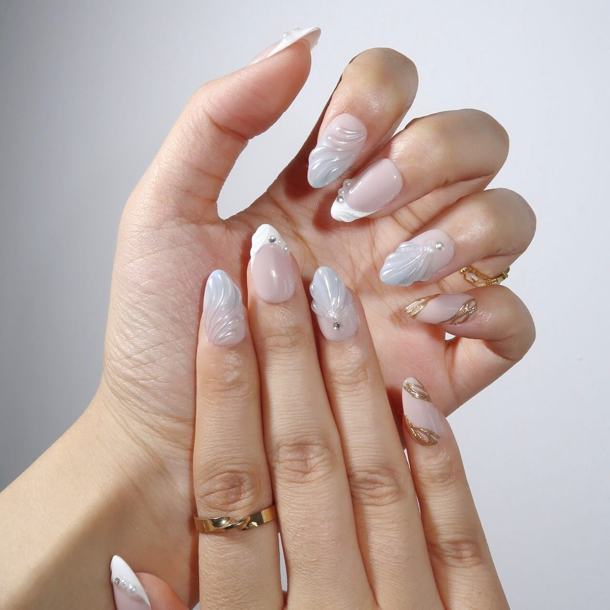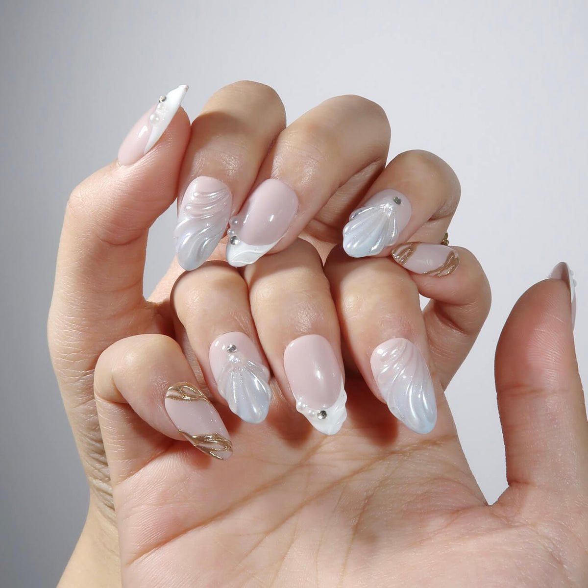 Dive into the ethereal charm of Undine, a design inspired by the beauty of water spirits. With a soft nude-pink base, this set features white French tips on the thumb and middle fingers, while the index and ring fingers showcase a dreamy blue gradient at the tips. 3D mermaid accents, delicate pearls, and sparkling gemstones complete the look, adding an exquisite touch of elegance. Perfect for those who love a graceful and aquatic-inspired aesthetic.