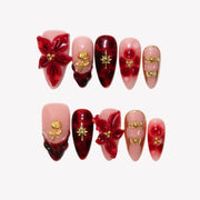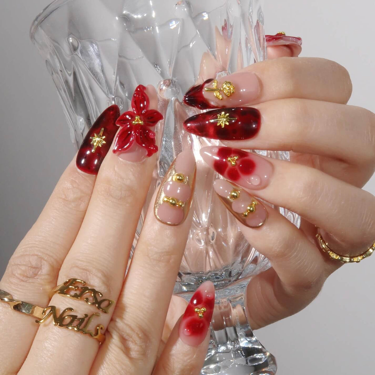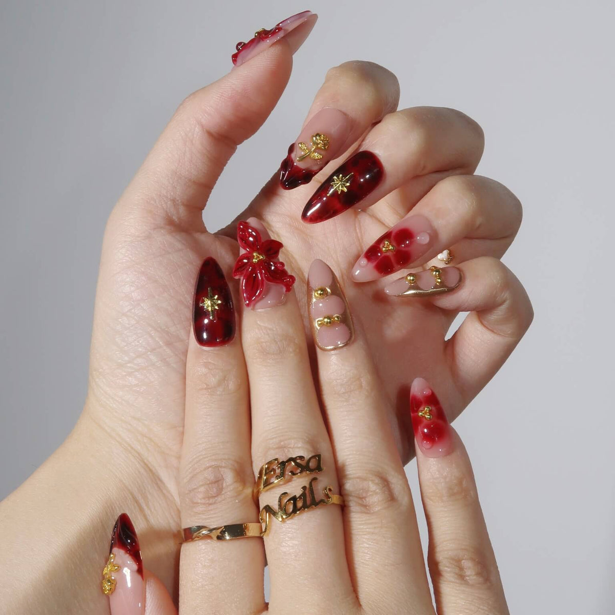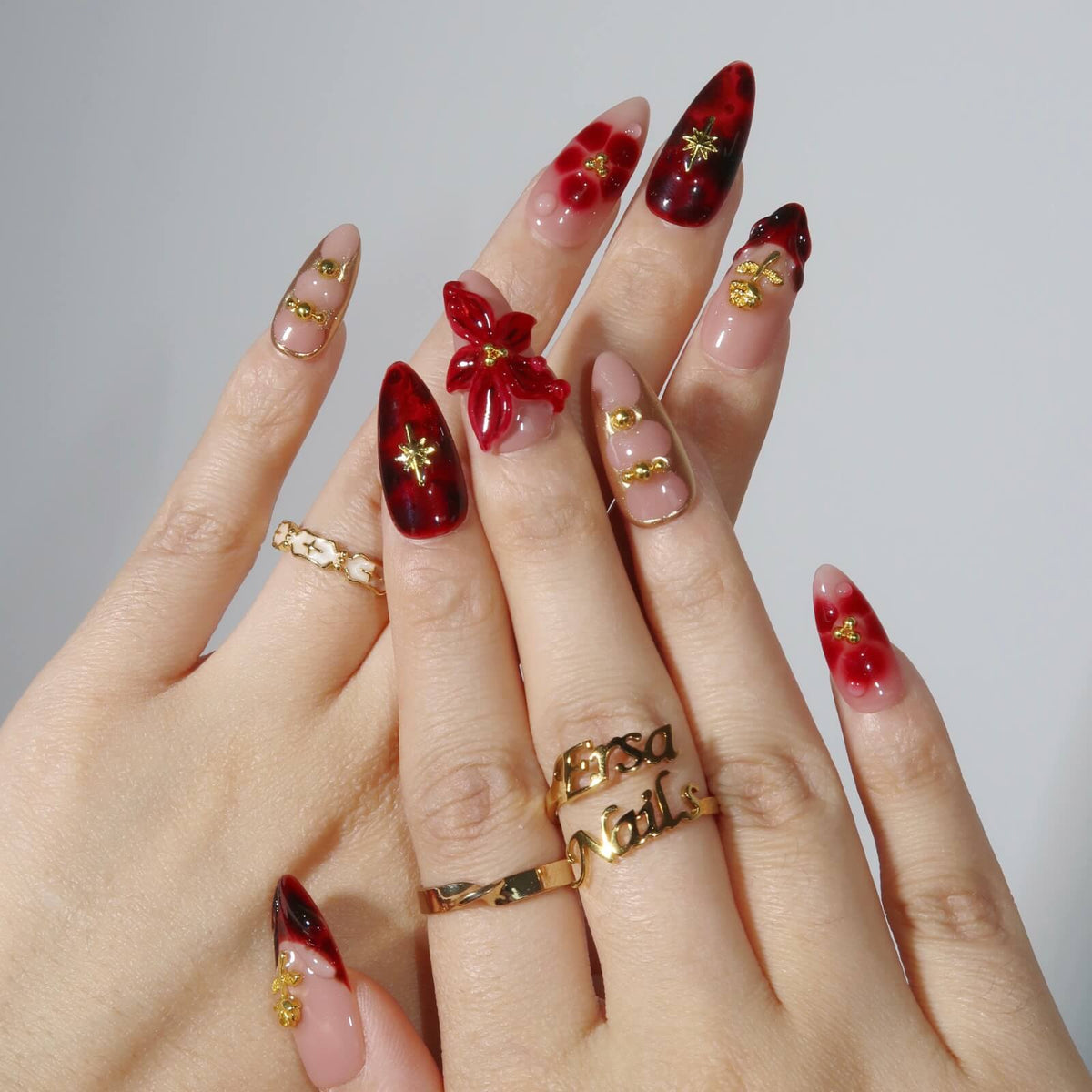 Embrace timeless elegance with Velvet Rouge, a stunning press-on nails set from Swara Nails. Featuring a nude base with a rich deep red tone, this design exudes a luxurious, sophisticated vibe. The ombre effect gently blends the colors, while 3D floral accents add depth and texture. Golden elements delicately dot the design, bringing a touch of opulence to your nails. Perfect for any occasion, Velvet Rouge offers effortless glamour and an impeccable finish.
