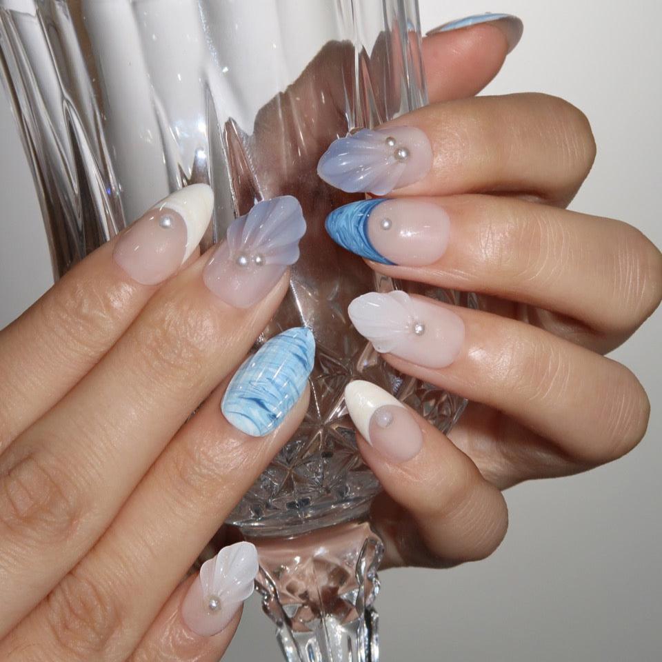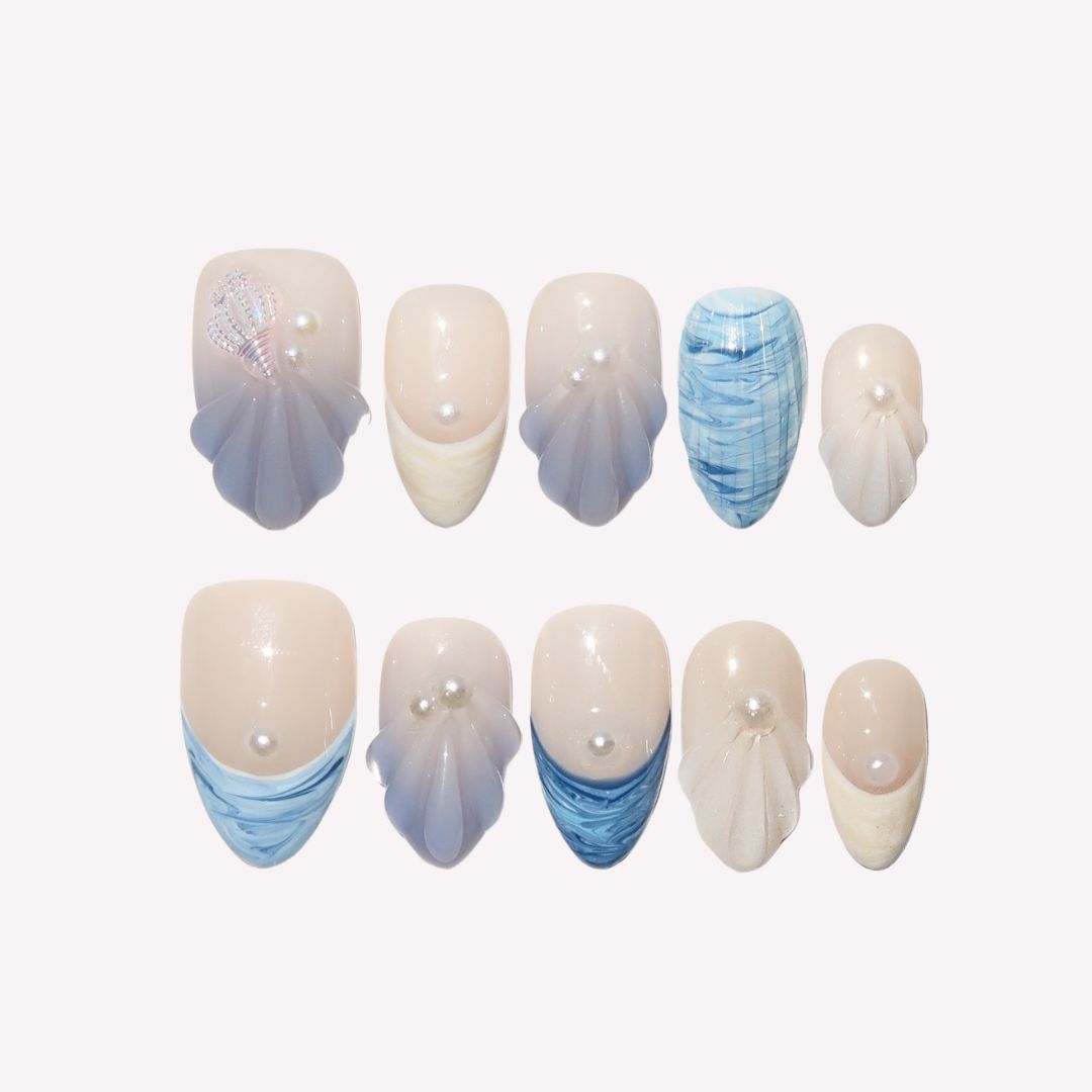 Dive into the serene elegance of Whispering Tide by Ersa Nails. This enchanting press-on nail set features a harmonious blend of nude and soft blue hues, adorned with delicate seashell designs and pearl accents. The 3D seashell patterns bring a touch of the ocean to your fingertips, evoking the tranquil beauty of the beach. Perfect for those who love to capture the essence of seaside serenity, Whispering Tide offers a sophisticated and dreamy look that’s ideal for any occasion. Embrace the whispering tide and let your nails tell a story of coastal charm and elegance.