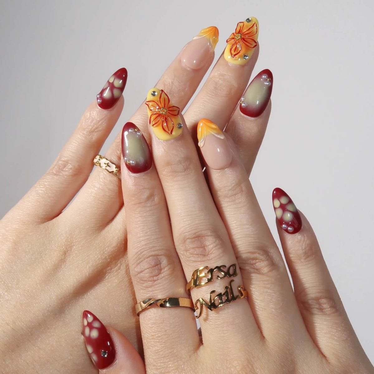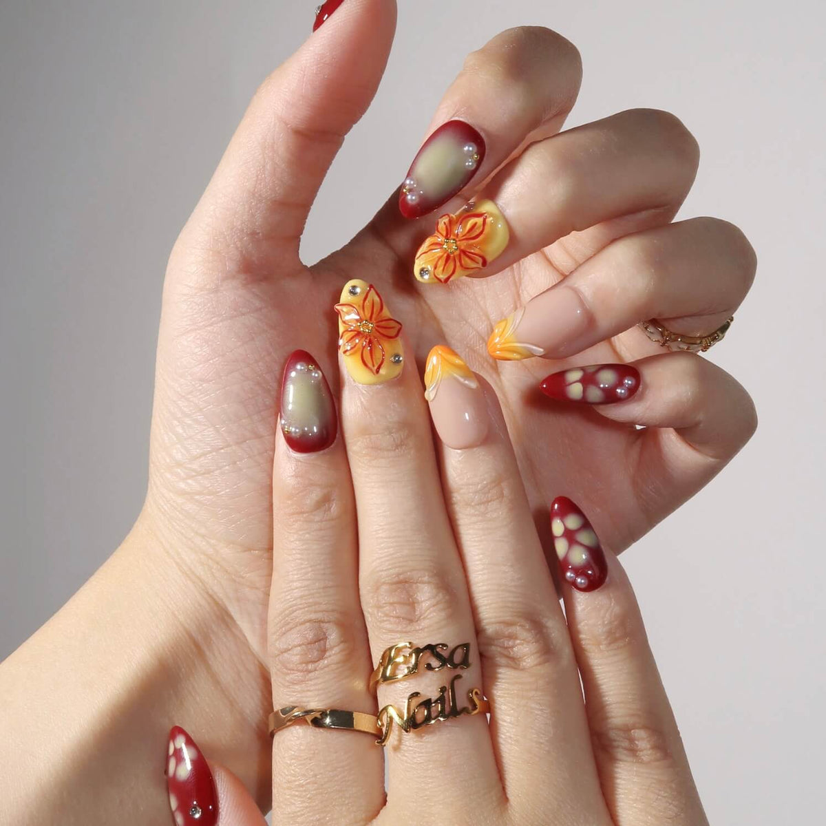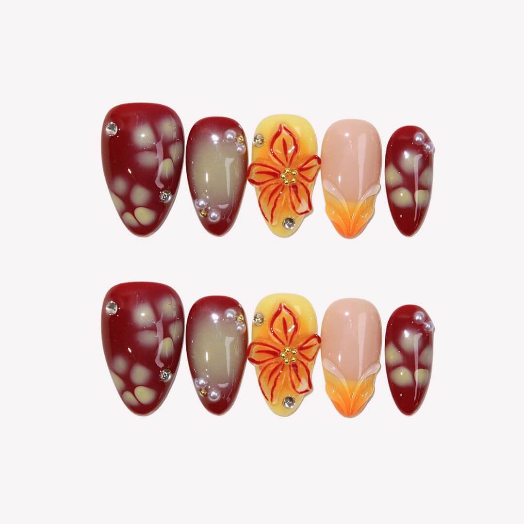 Make a bold statement with Wild Venus, a stunning set of press-on nails from swara Nails. Featuring a vibrant mix of red and orange-yellow tones with an ombre design, these nails also feature French tips and intricate 3D floral accents. With pearls and gemstone embellishments, this set brings a touch of elegance and sparkle, perfect for those who love to stand out with fiery, sophisticated style.