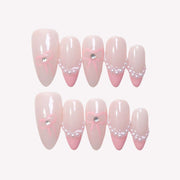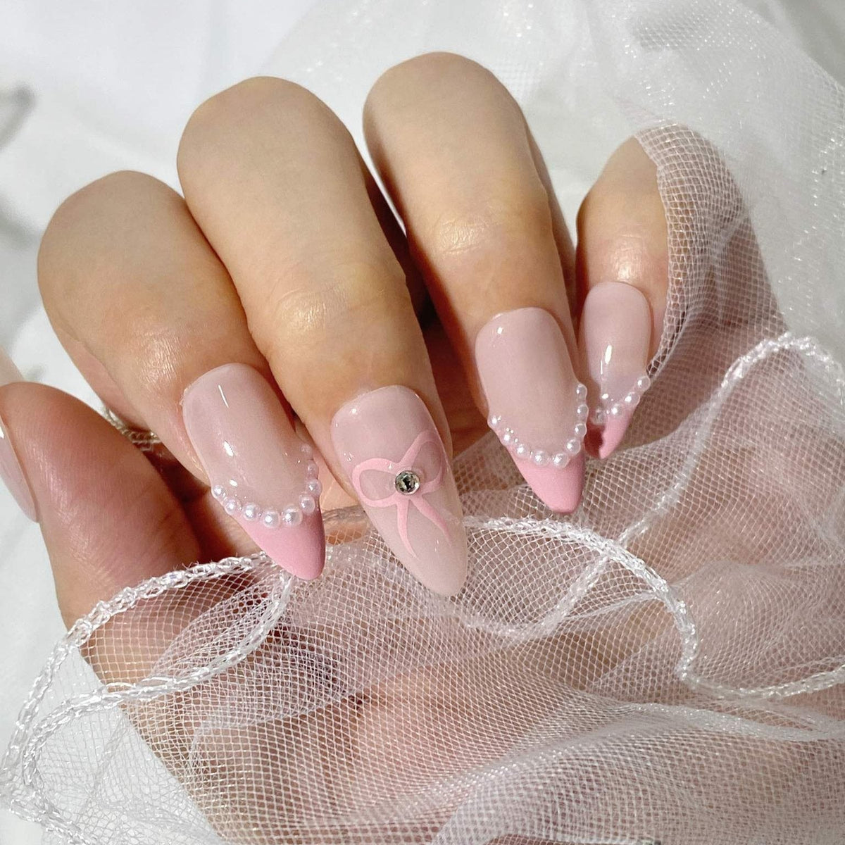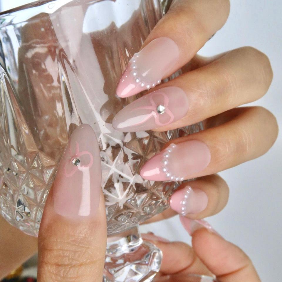 Embrace elegance and sophistication with swara Nails' Girl in Pearl set. Featuring a soft nude base, these nails exude timeless beauty and refinement. Delicate pink bows add a touch of femininity, while shimmering gemstones and lustrous pearls lend a touch of glamour and allure. Each nail is adorned with intricate pearl accents, creating a captivating look that catches the light with every movement. Finished with blush pink French tips, these nails are the epitome of understated chic. Let Ersa's Girl in Pearl elevate your style and add a touch of luxury to your fingertips.