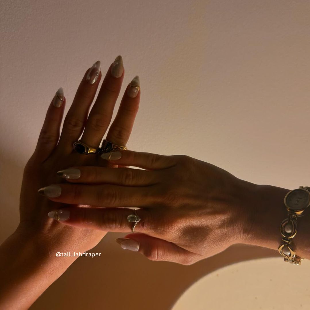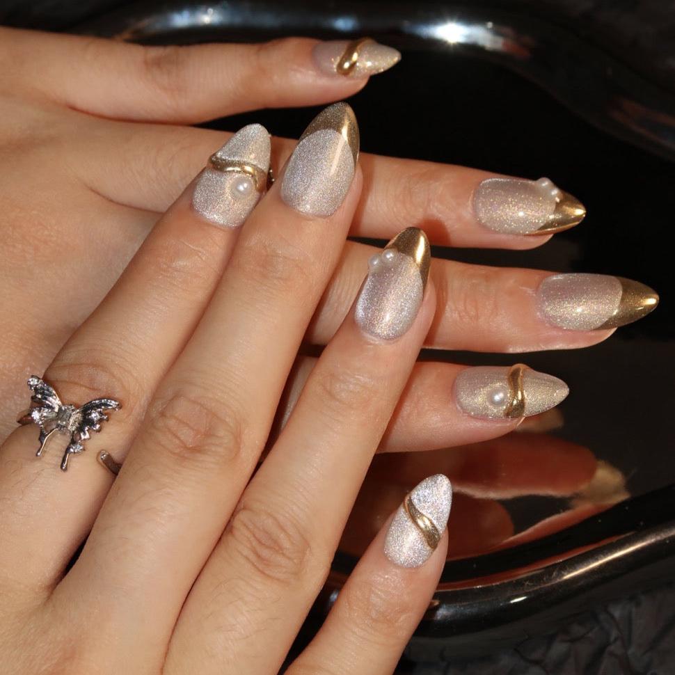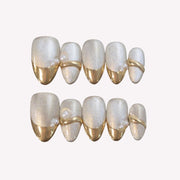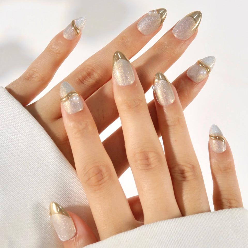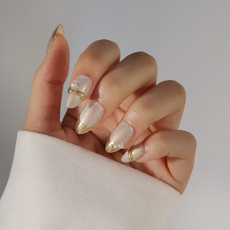 Step into a world where luxury and charm meet with swara Nails' Material Girl press-on set. These nails are a tribute to the lavish and the exquisite, drawing inspiration from the opulent sheen of golden fabric and the timeless elegance of pearls. Each nail is a statement piece, showcasing a shimmering, frosted background adorned with a rich gold dip at the tip and a singular, lustrous pearl placed with precision. Material Girl is more than a set of nails; it’s an experience of indulgence, perfect for the fashionista with a penchant for grandeur. Flaunt these at a glamorous evening event or a sophisticated gathering and watch as they become a conversation starter, a stunning accessory that complements your impeccable taste.