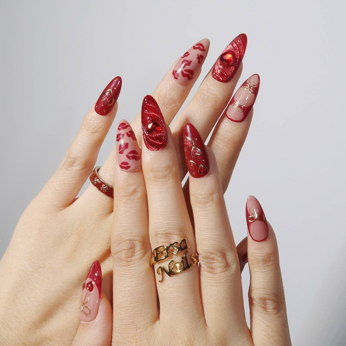 Make this Valentine’s Day unforgettable with A Kiss to Remember press-on nails from Ersa Nails. Featuring a rich deep red as the base color, these nails showcase a striking red cat-eye design that captures the essence of romance. 3D heart accents and playful red lip patterns add a bold and passionate touch, while gold bow motifs offer a touch of elegance. Perfect for Valentine nails, A Kiss to Remember is sure to leave a lasting impression on your special day.