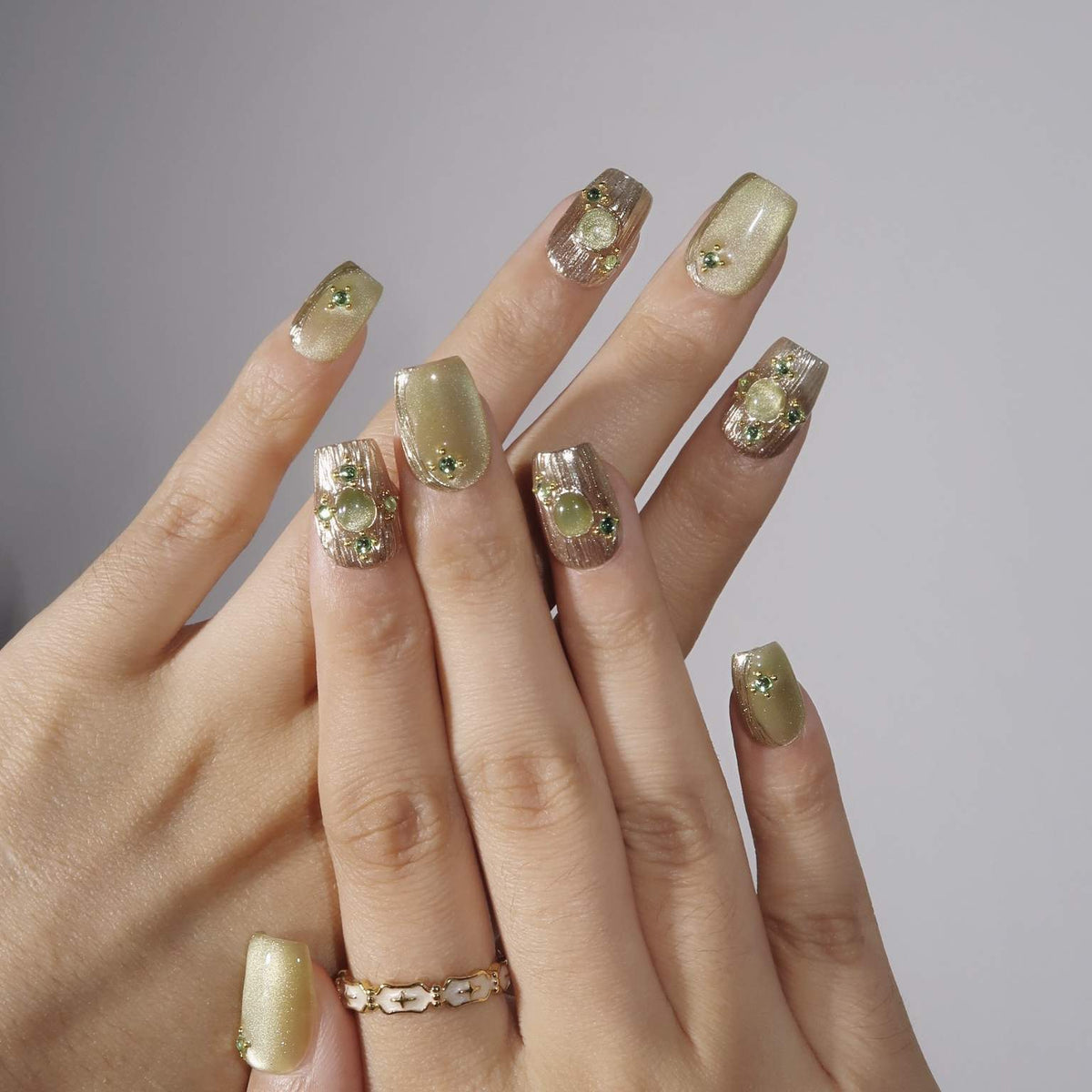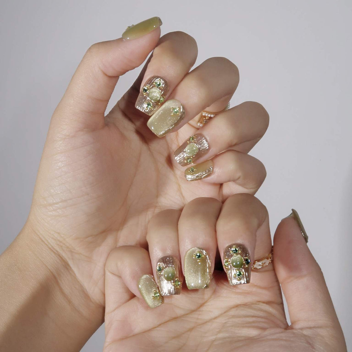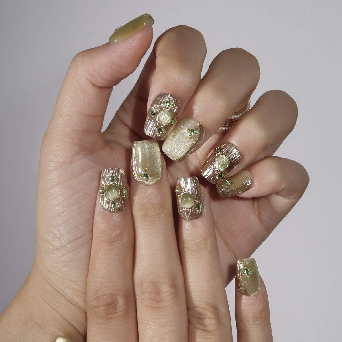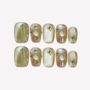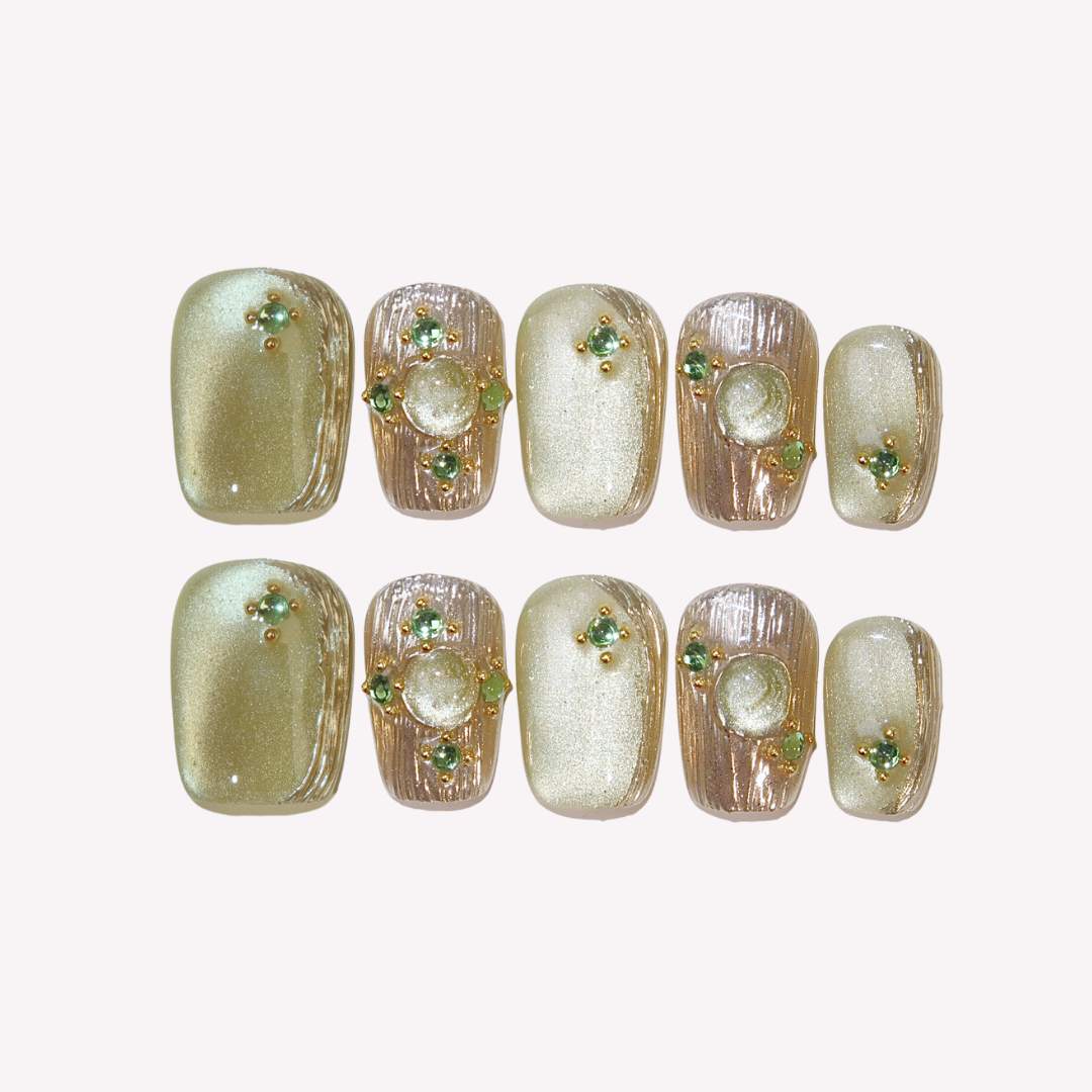 Forest Fairy from Swara Nails is a mystical and elegant press-on nails set that captures the magic of the forest. Featuring a rich green cat-eye design, this set is enhanced with shimmering gold elements and intricate gold textures that evoke a sense of enchantment. Sparkling gems add a touch of luxury, making these nails perfect for those who want to bring a little magic to their everyday look. Embrace the charm of the forest with Forest Fairy and let your nails shine with natural beauty.