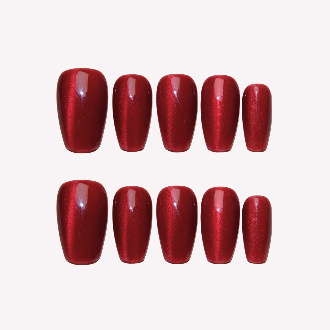 Reveal understated elegance with swara Nails' Hidden Gem press-on nails. Featuring a minimalist design with a deep red cat-eye effect, this set exudes sophistication and allure. Perfect for those who appreciate a bold yet refined look that adds a touch of mystery and glamour to any style.