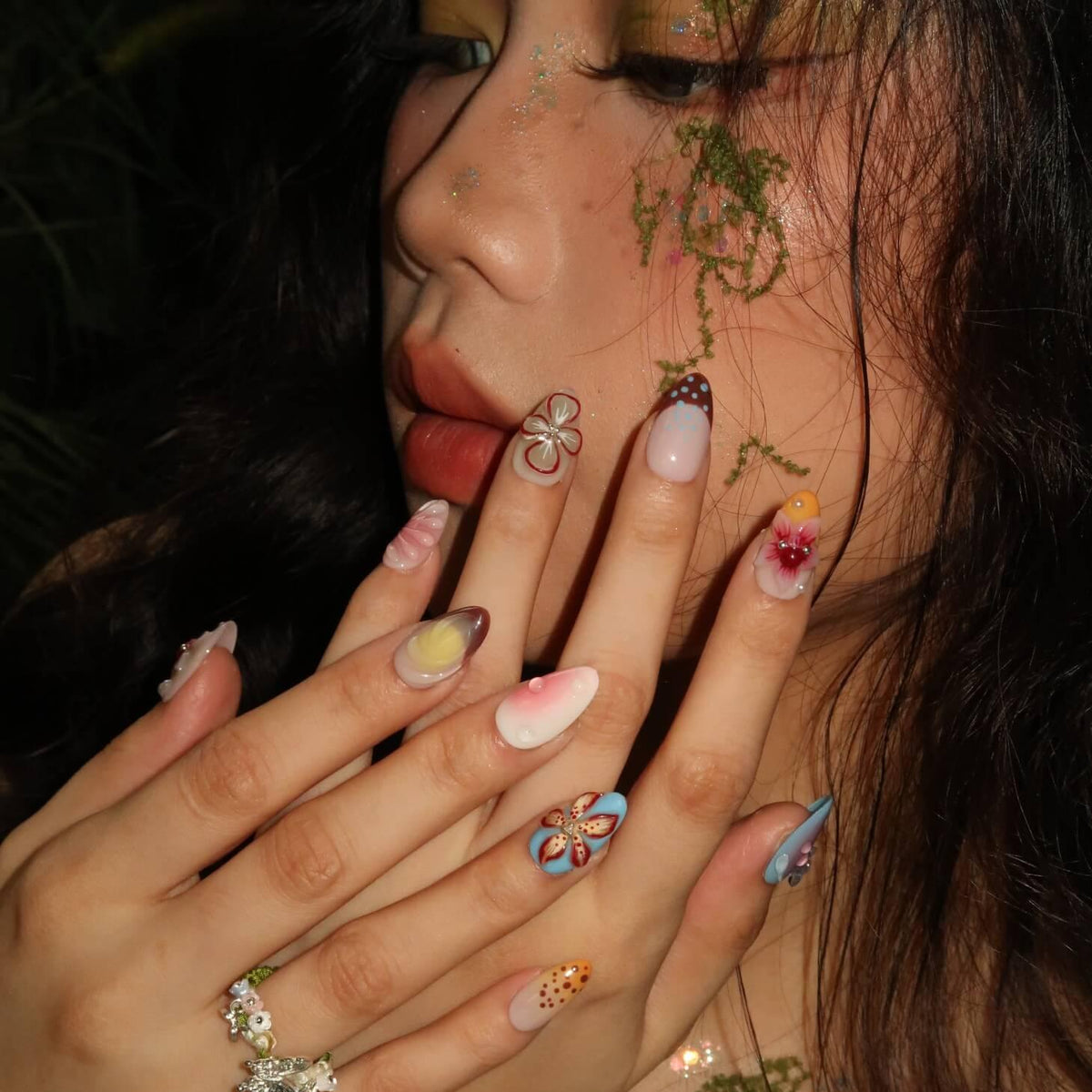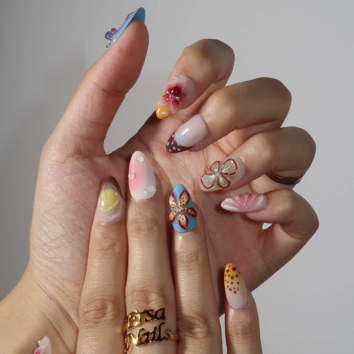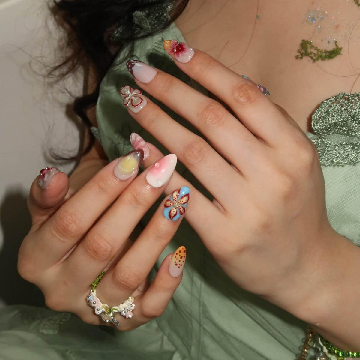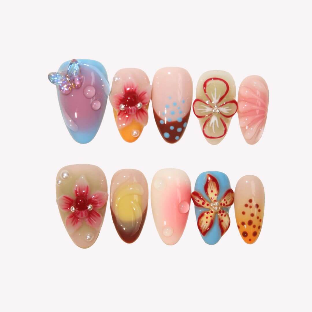 Unleash vibrant artistry with Kaleidoscope press-on nails from Swara Nails, blending bold blues, reds, yellows, and oranges with 3D florals, fluttering butterflies, and rippling water textures. Pearls add elegant contrast to the dynamic design, while the lightweight, durable fit ensures instant glamour—perfect for turning heads day or night. Effortless, eye-catching, and endlessly creative.