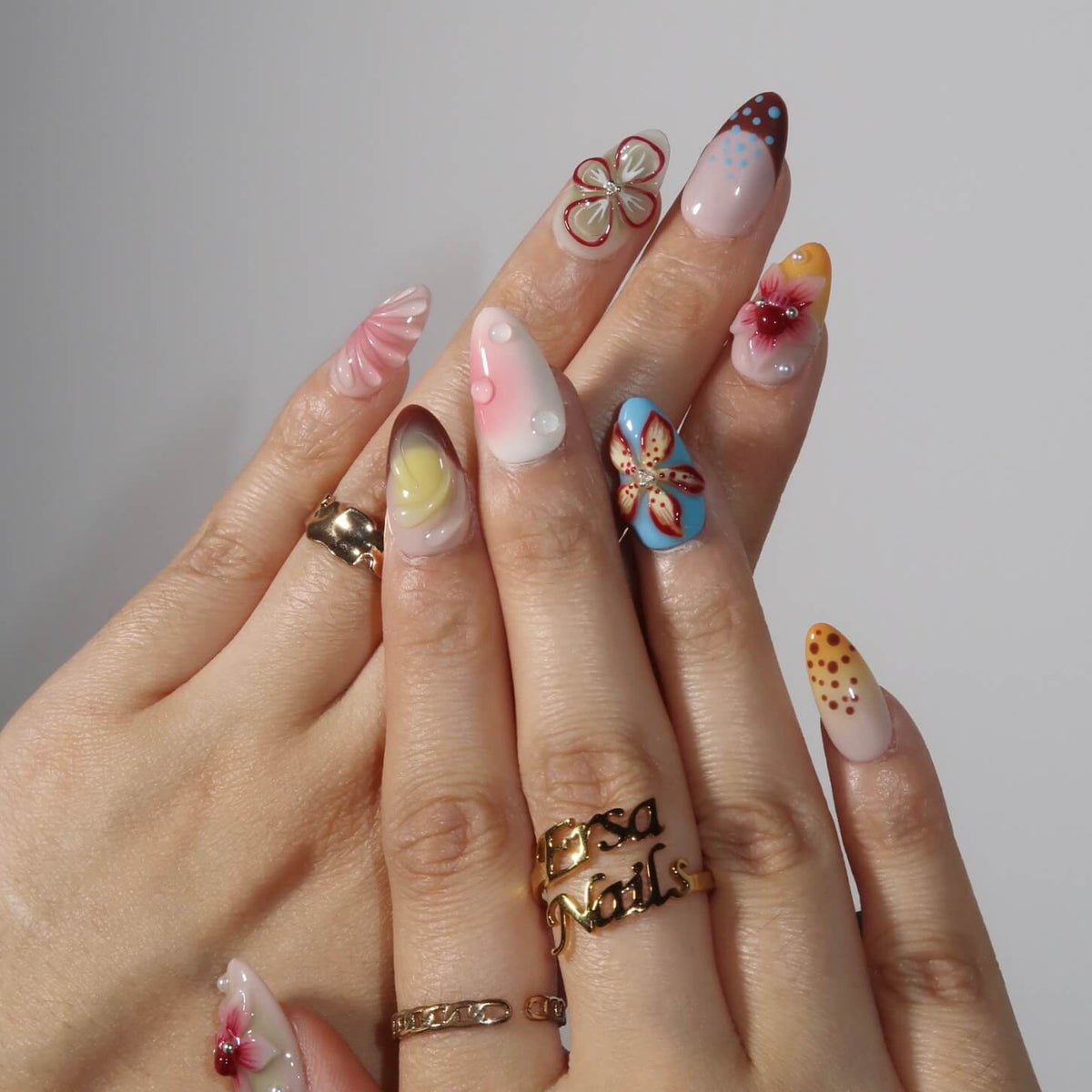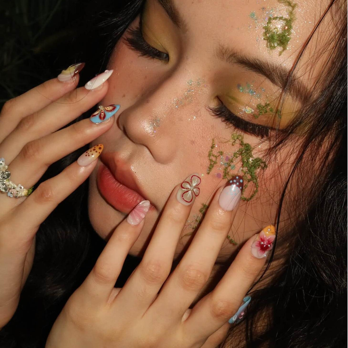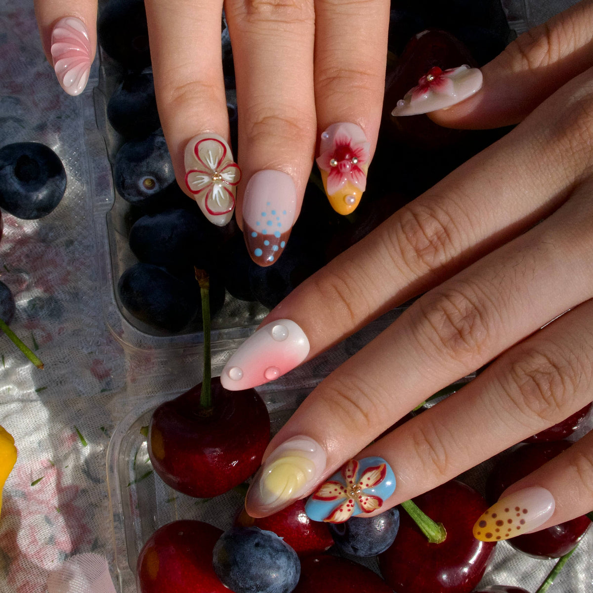 Unleash vibrant artistry with Kaleidoscope press-on nails from Swara Nails, blending bold blues, reds, yellows, and oranges with 3D florals, fluttering butterflies, and rippling water textures. Pearls add elegant contrast to the dynamic design, while the lightweight, durable fit ensures instant glamour—perfect for turning heads day or night. Effortless, eye-catching, and endlessly creative.