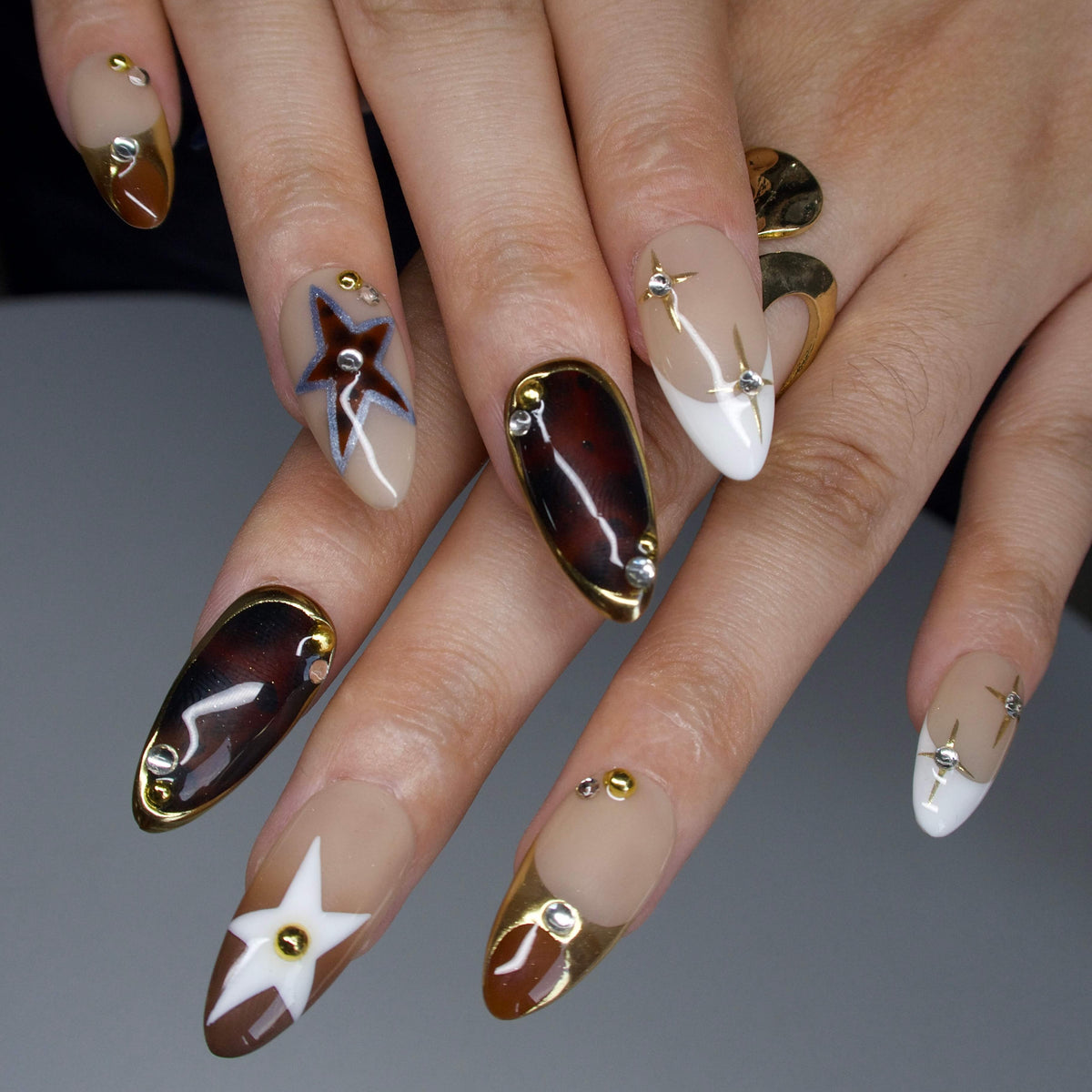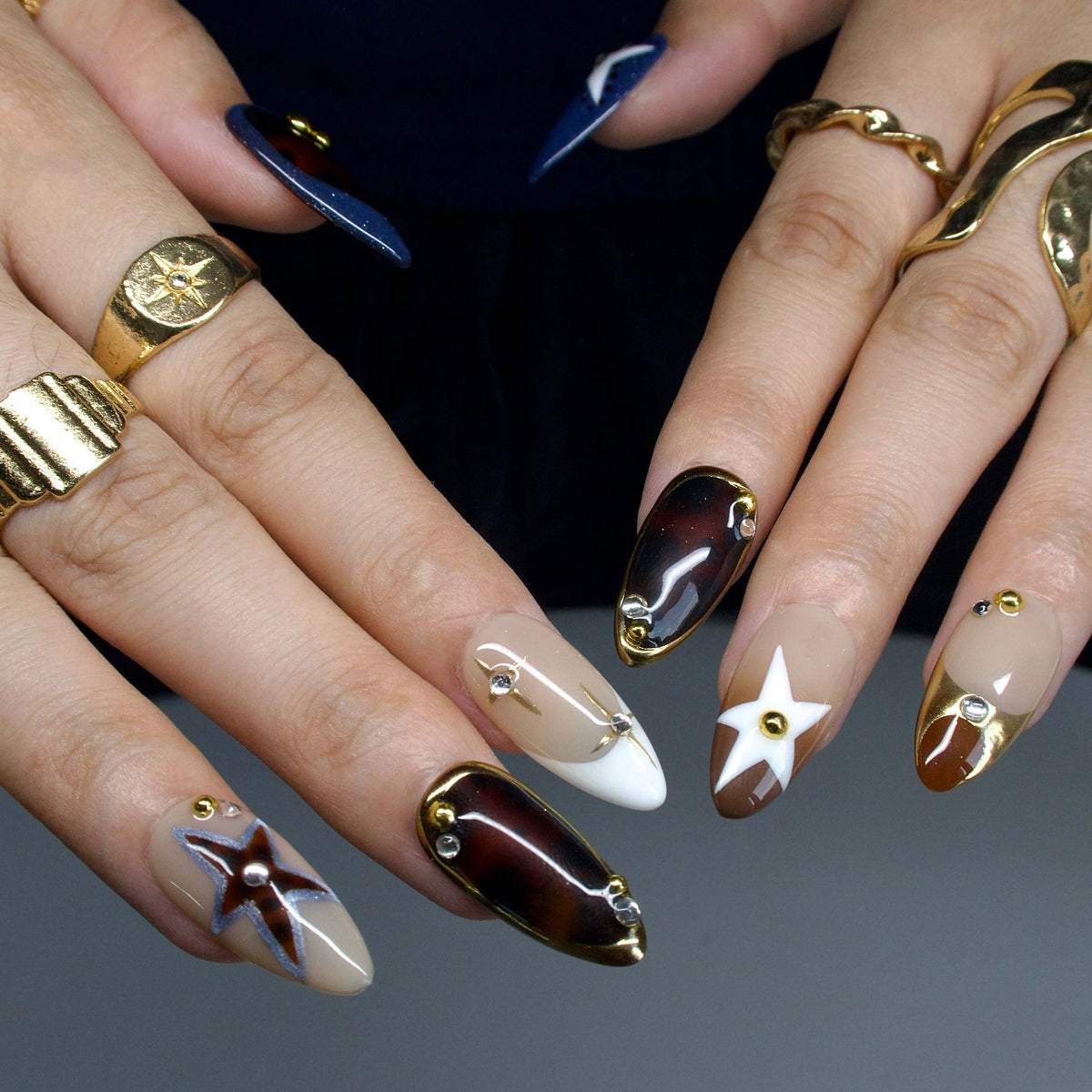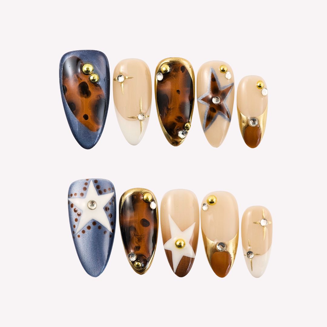 Supernova by tonails is a vibrant press - on nails design that fuses retro - chic and trendy flair. With a palette of soft beige, deep blue, and warm tortoiseshell brown as the base tones, it’s adorned with eye - catching star motifs, gleaming gold accents, and sparkling rhinestones. These elements create a playful yet stylish look, perfect for infusing a dose of fun, fashion - forward charm into your daily ensembles, special gatherings, or music festivals where you want to stand out with nail art that’s as lively and unique as the festival vibes. NAIL SHAPE: Medium Almond