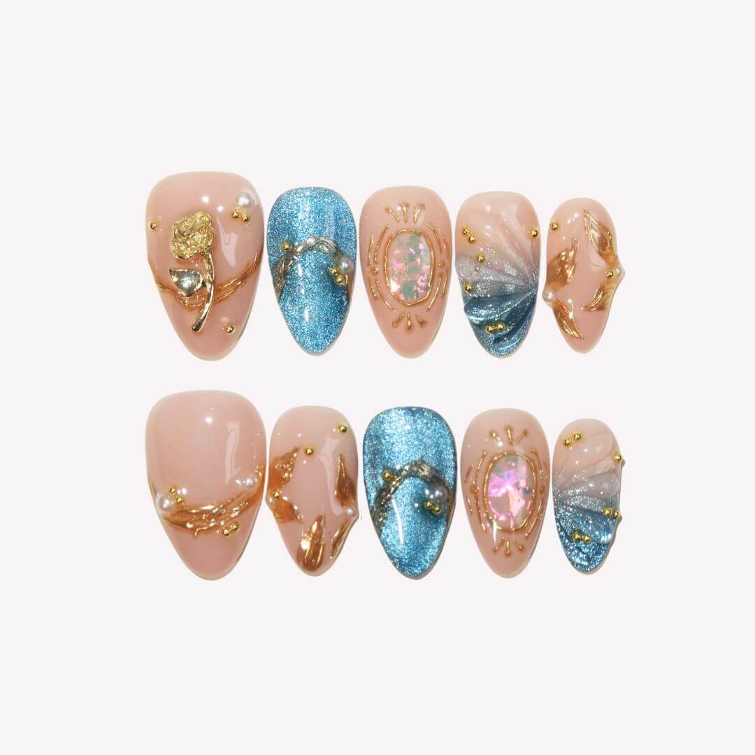 Unveil a sophisticated, yet bold look with True Blue press-on nails from swara Nails. Featuring a nude base with striking blue and gold accents, these nails combine the mesmerizing cat-eye effect with unique gold abstract patterns. A golden rose embellishment on the thumb, along with pearl and gold bead details, adds a touch of luxury and elegance. True Blue is the perfect choice for those seeking an eye-catching yet refined nail art design.