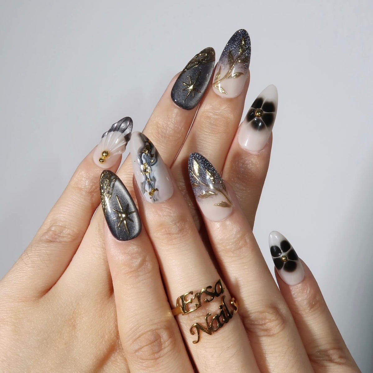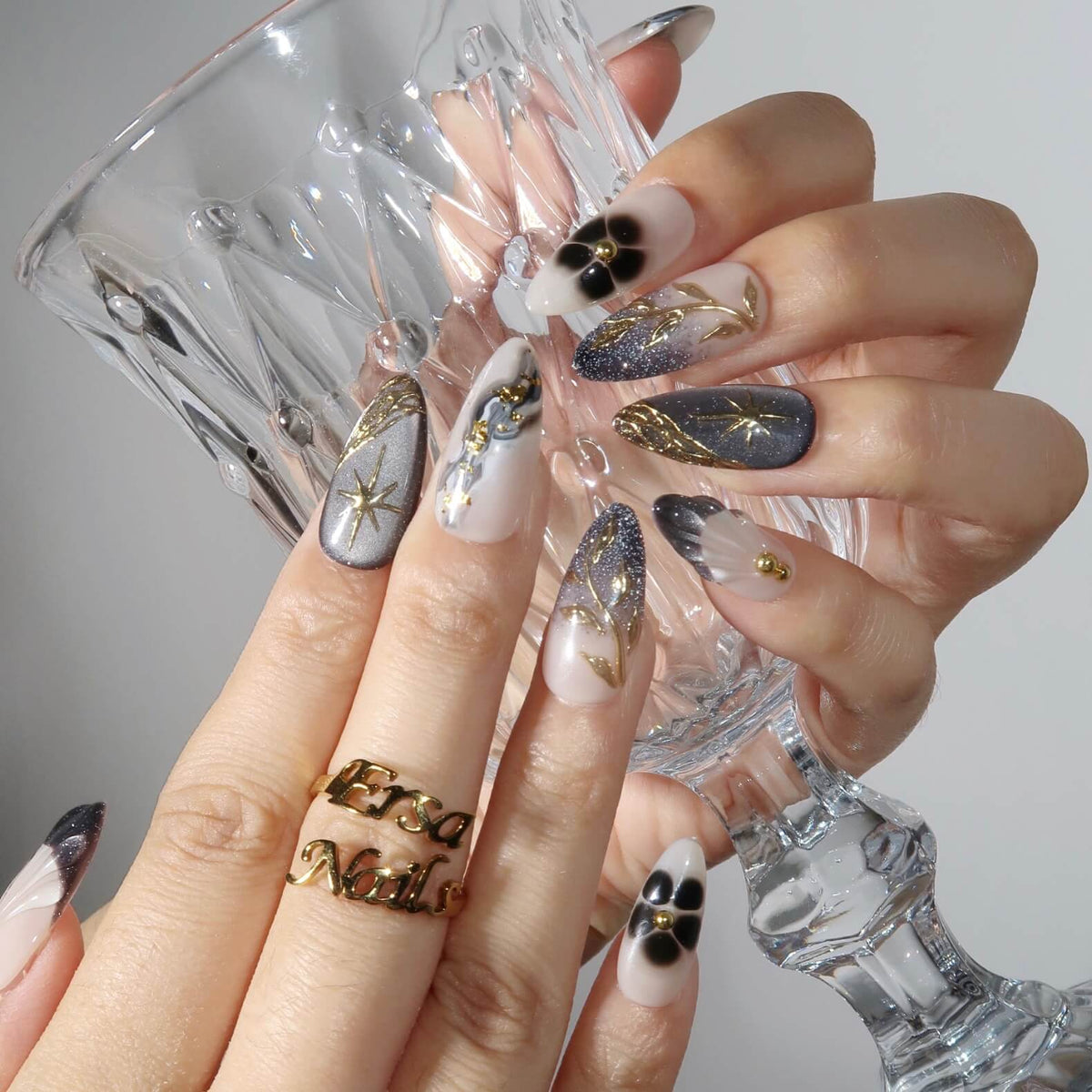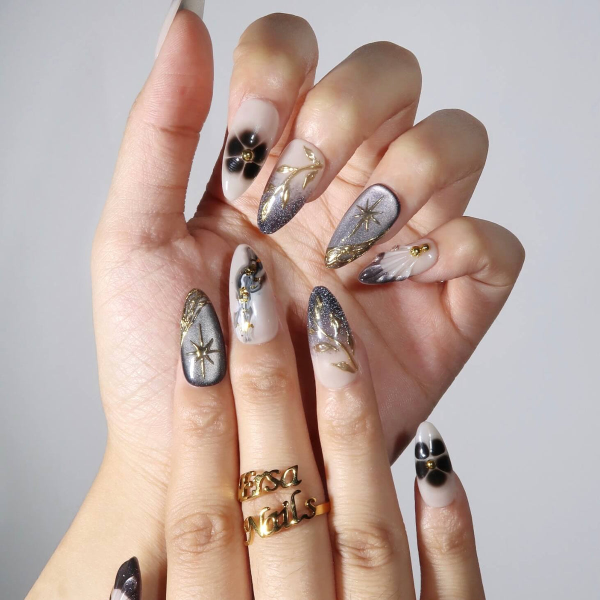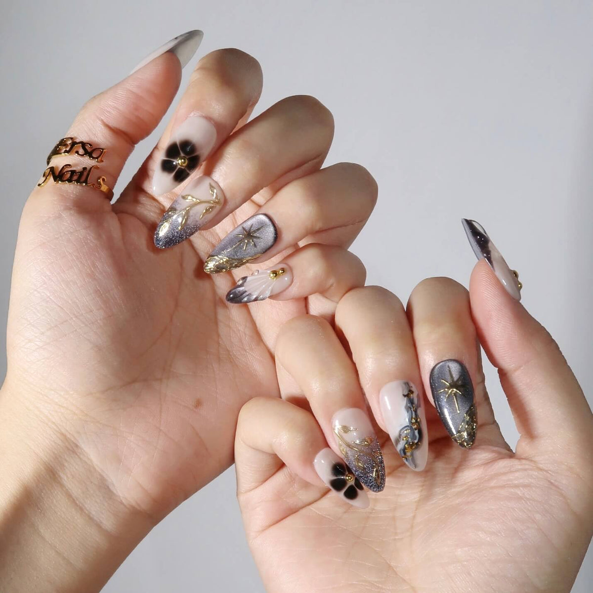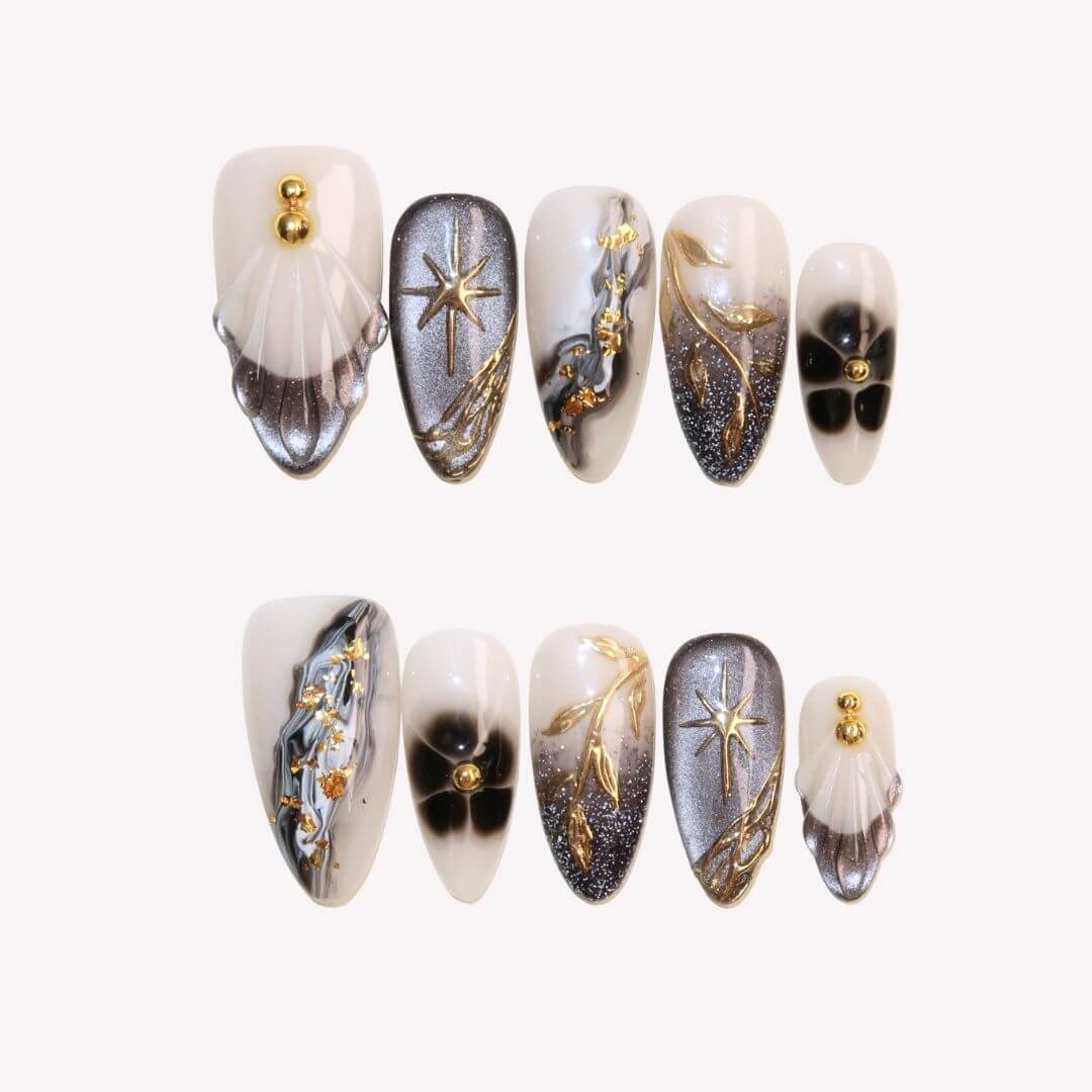 Swara Nails presents Yinyang, a striking set of press-on nails that beautifully blend elegance and edge. With a nude base and bold black as the dominant shade, these nails feature a mesmerizing cat-eye effect and an alluring ombre design. Gold patterns and sparkling flakes add a touch of luxury, making Yinyang the perfect choice for those seeking a sophisticated yet daring look.