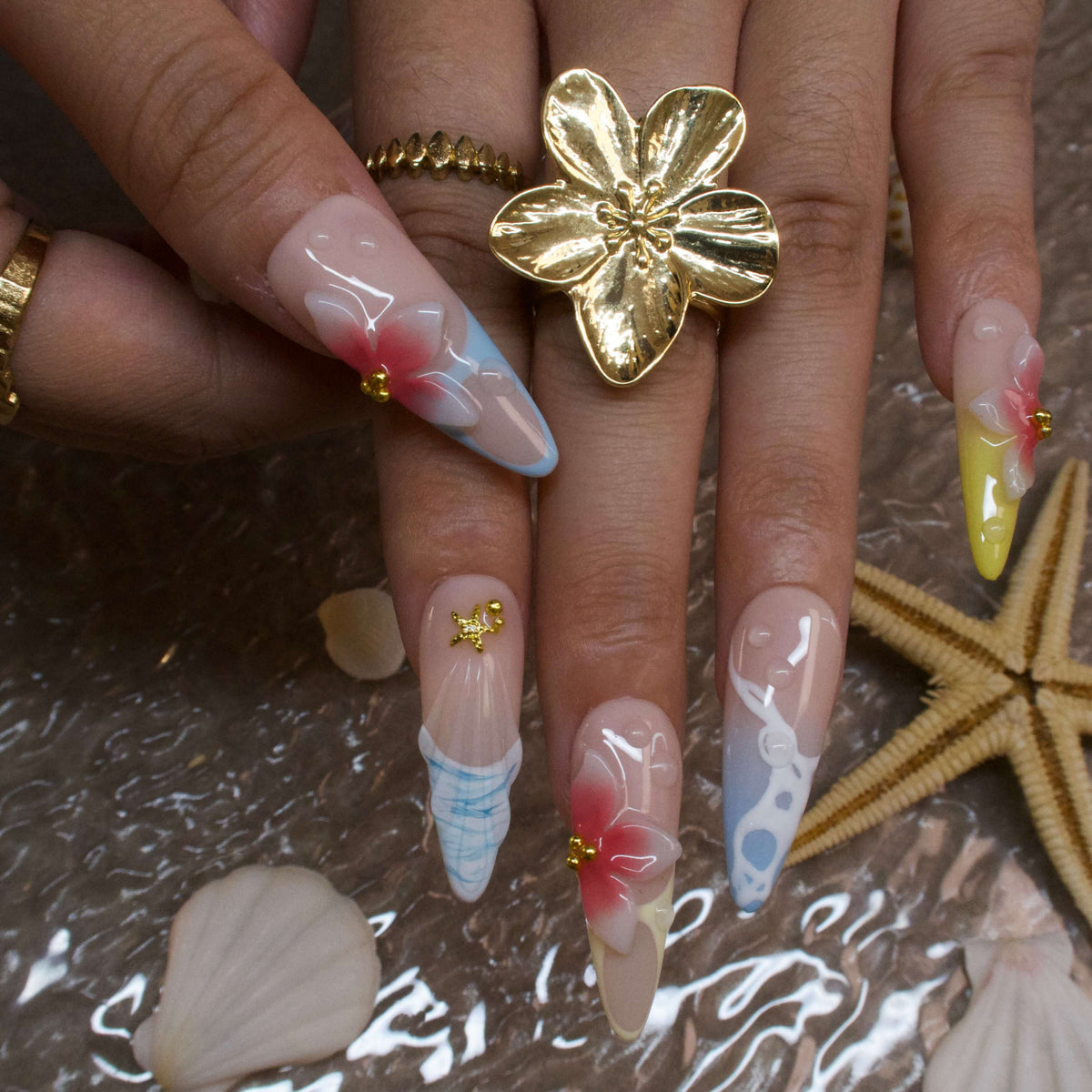 Bloomwave by Swara Nails transports you to a whimsical coastal escape. On a soft, peachy - pink base, delicate 3D flowers in blush pink bloom alongside tiny gold seahorses and starfish. Subtle gradients of sky blue and sunny yellow, plus dainty butterfly accents, mimic the carefree charm of a beachside stroll. Perfect for infusing festival looks or summer days with a touch of breezy, floral - filled seaside magic.