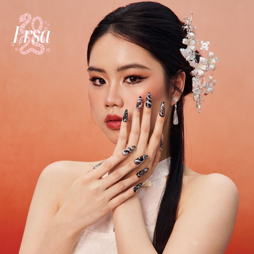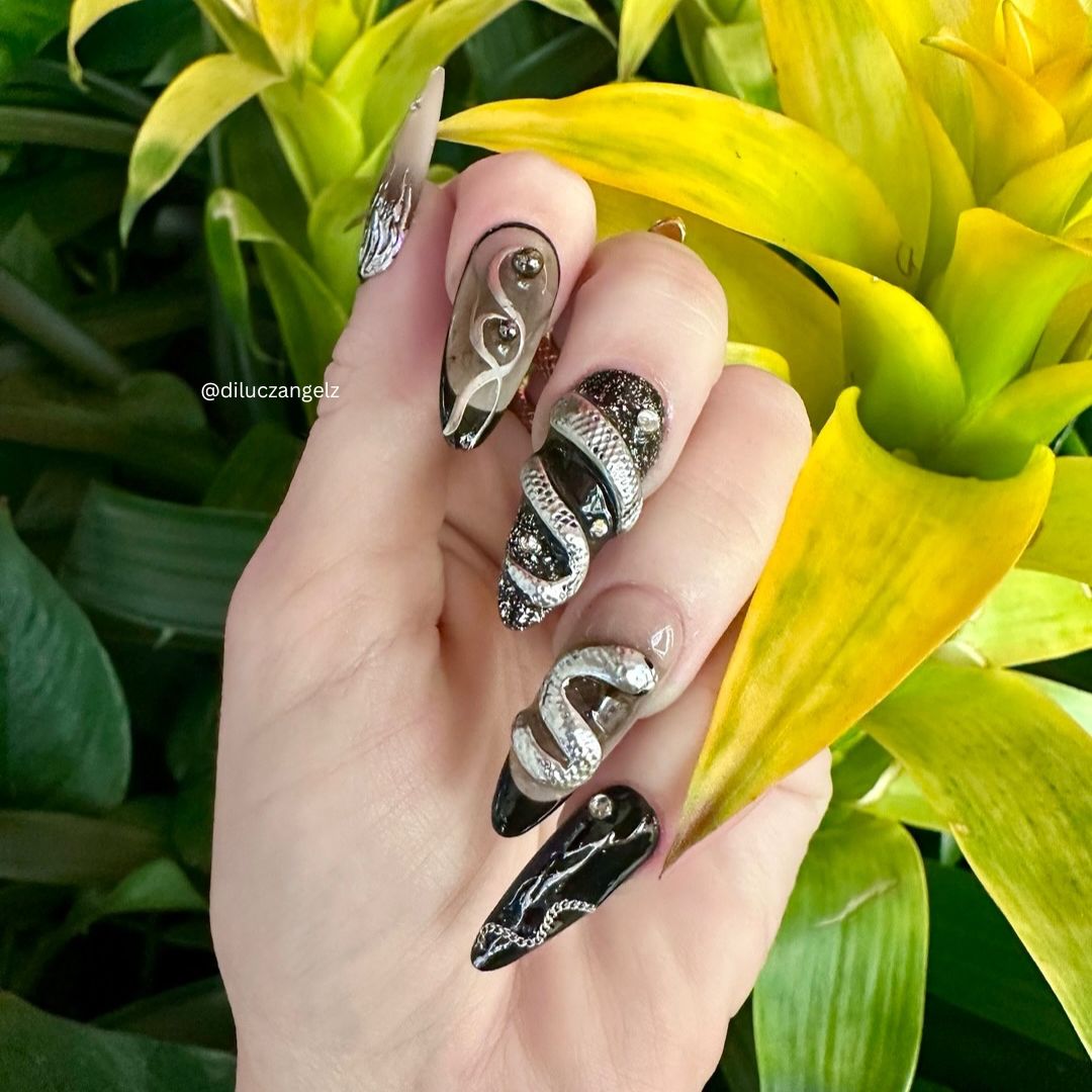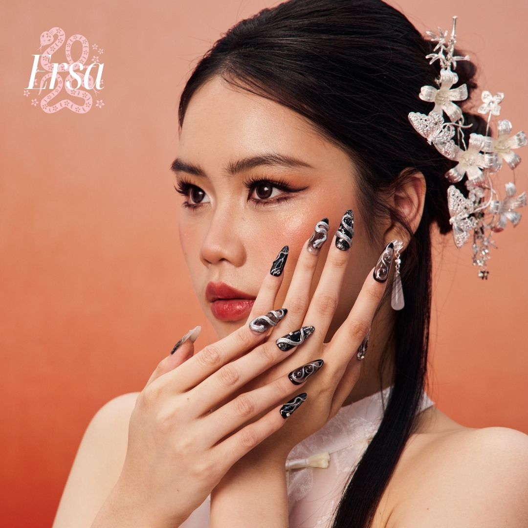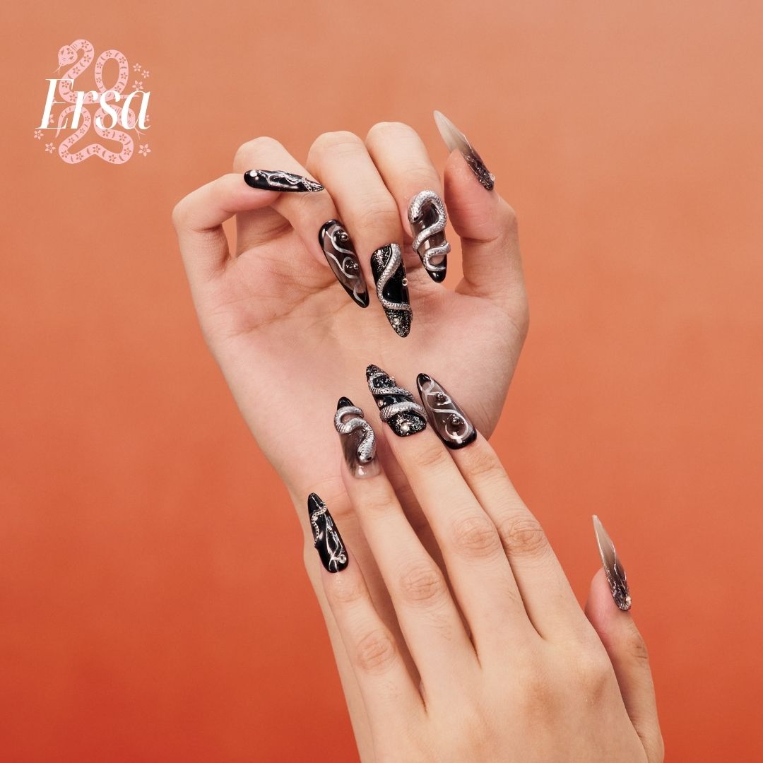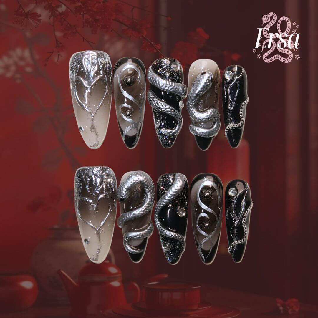 Make a bold statement with Cool Heart, a striking design from our Snake Year collection. Dominated by a sleek black base and accented with shimmering silver, this set captures the perfect balance of edgy and elegant. The irregular silver patterns add an artistic touch, while the 3D silver snake decorates your nails with a powerful symbol of transformation and resilience. A cute heart motif on the thumb adds a sweet contrast, and silver glitter enhances the luxurious feel. With its daring combination of black, silver, and shimmering details, Cool Heart embodies strength and style—ideal for those who want to make an unforgettable impression in the Snake Year.
