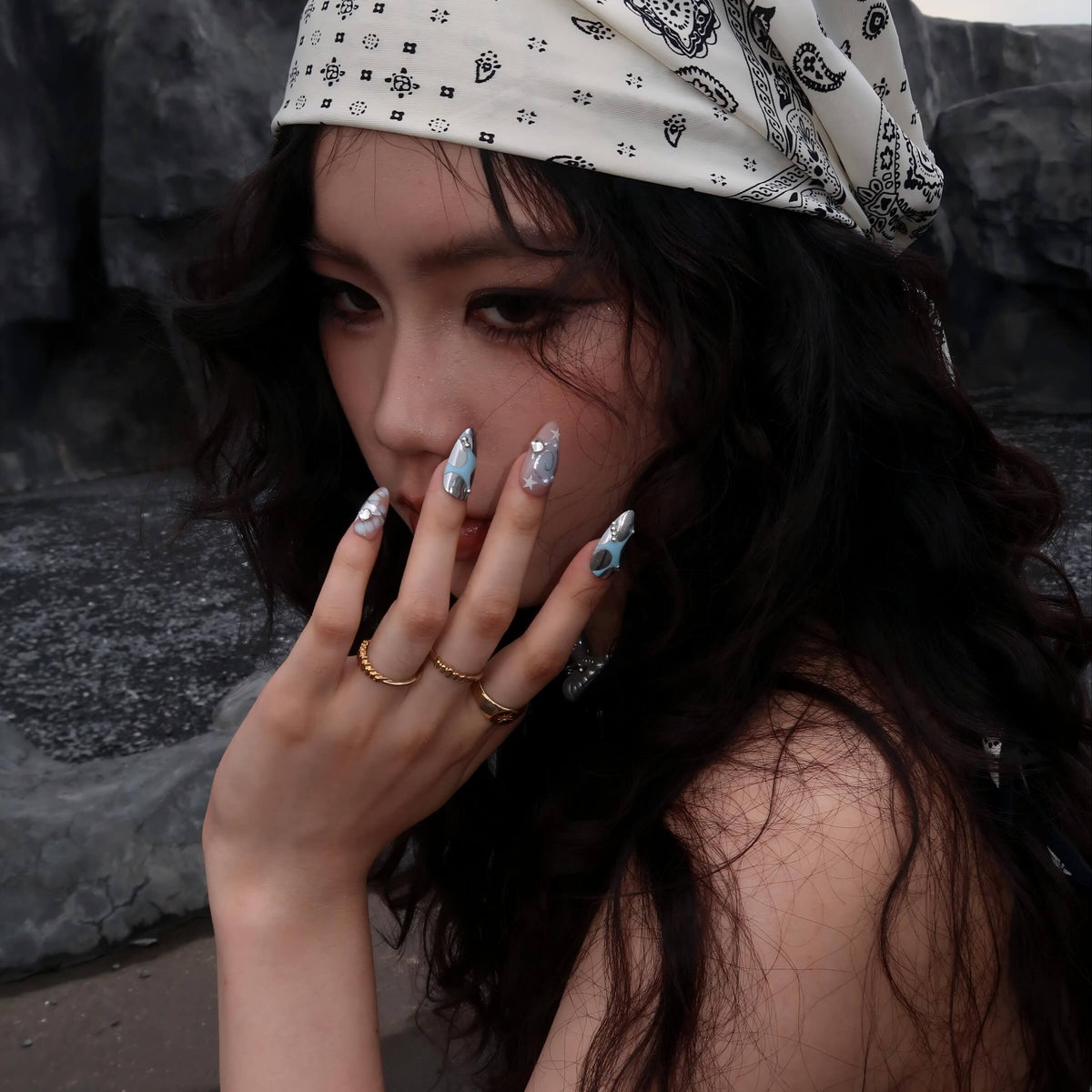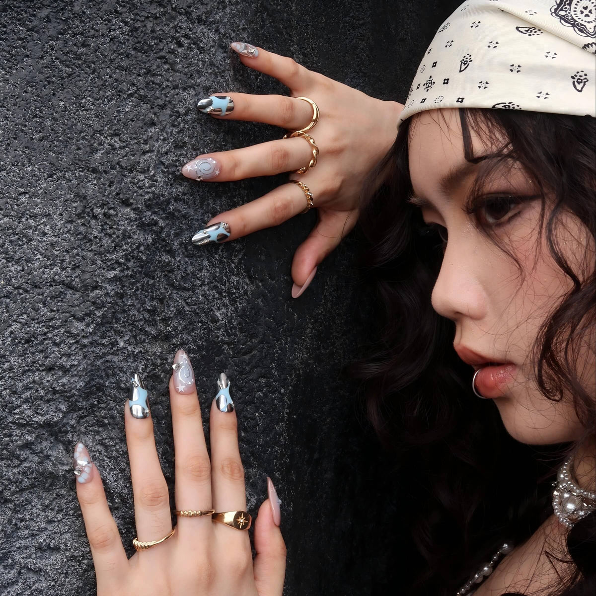 Shine brighter than ever with Dazzle from Swara Nails. These press-on nails feature a nude base accented with cool silver and blue tones. Star motifs, paired with delicate silver beads, pearls, and rhinestones, create a radiant, eye-catching look that’s perfect for any moment you want to sparkle.