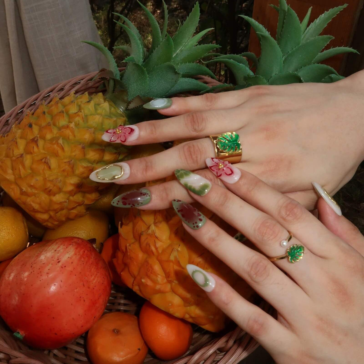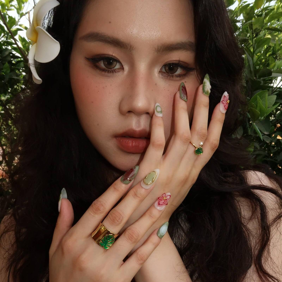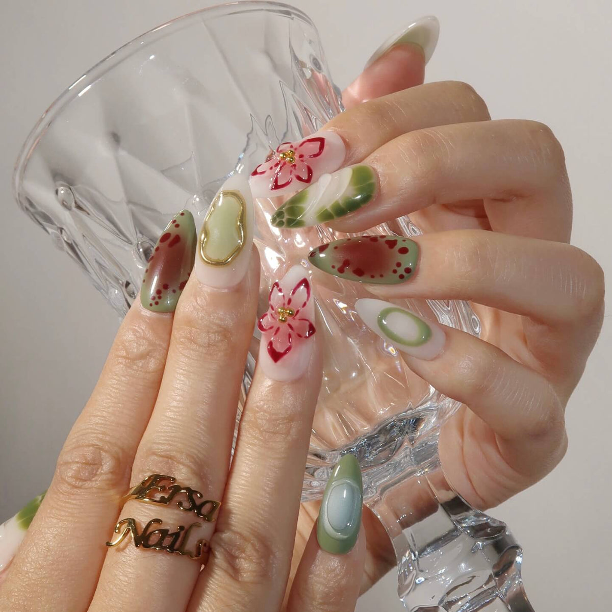 Embrace the earthy beauty of the Deep Woods press-on nails from swara Nails. Featuring a creamy white base with deep green and brown ombre designs, these nails evoke the tranquility of a forest. The 3D floral accents add a delicate touch, while golden elements bring a hint of elegance. Perfect for those who love nature-inspired styles, Deep Woods offers a chic, organic look that's as refreshing as a walk through the woods.