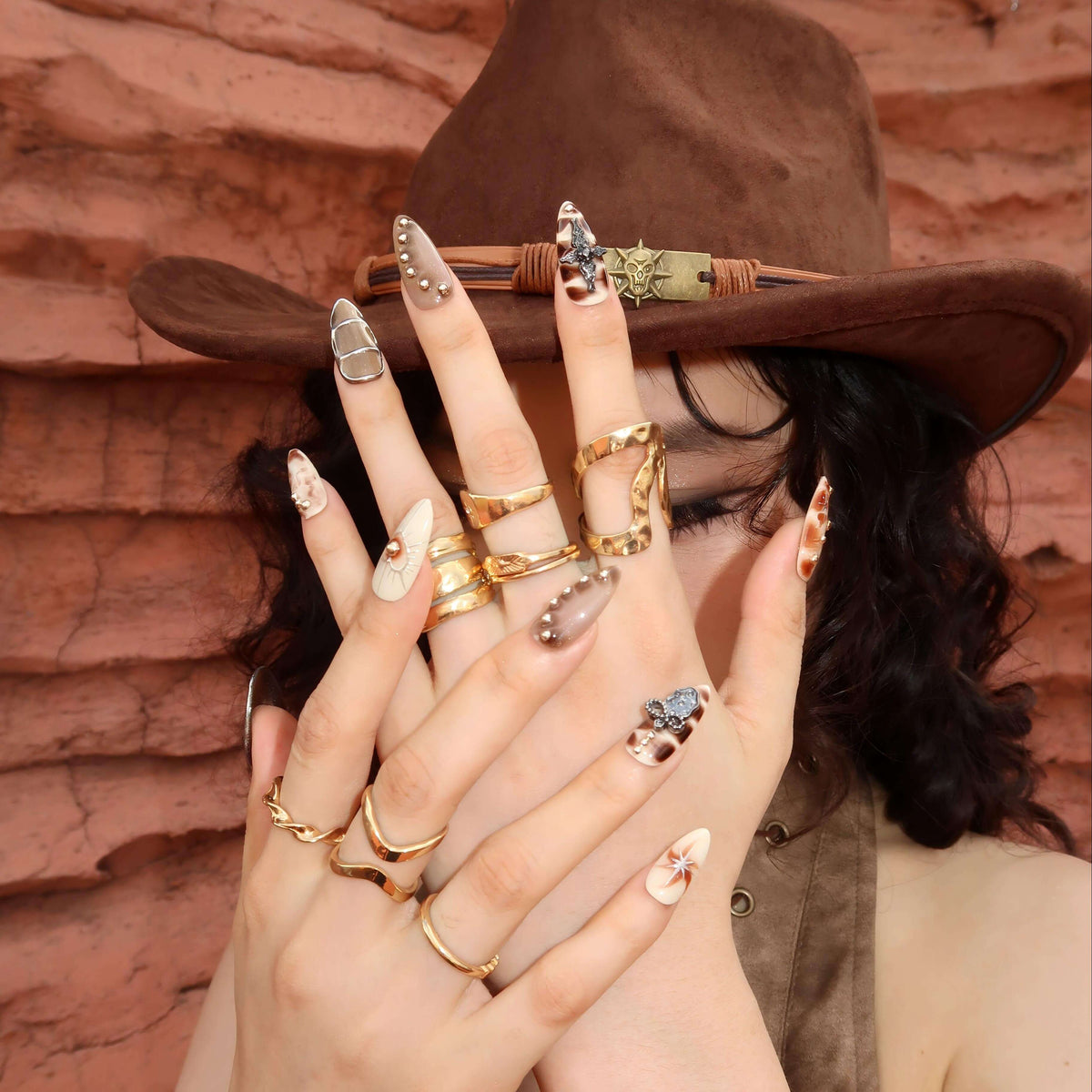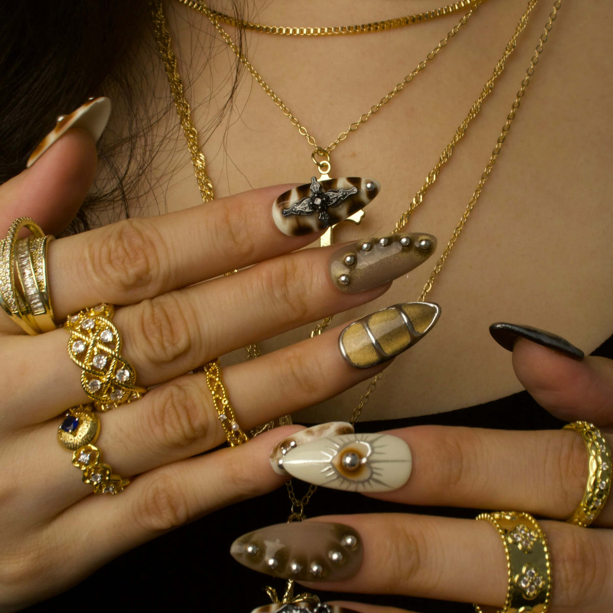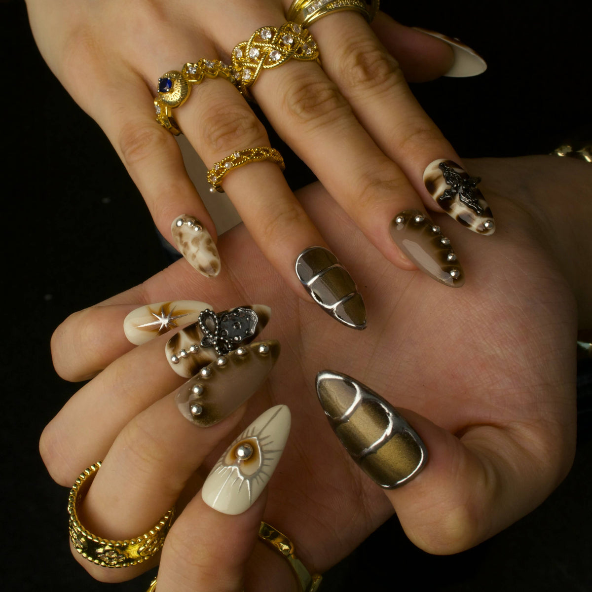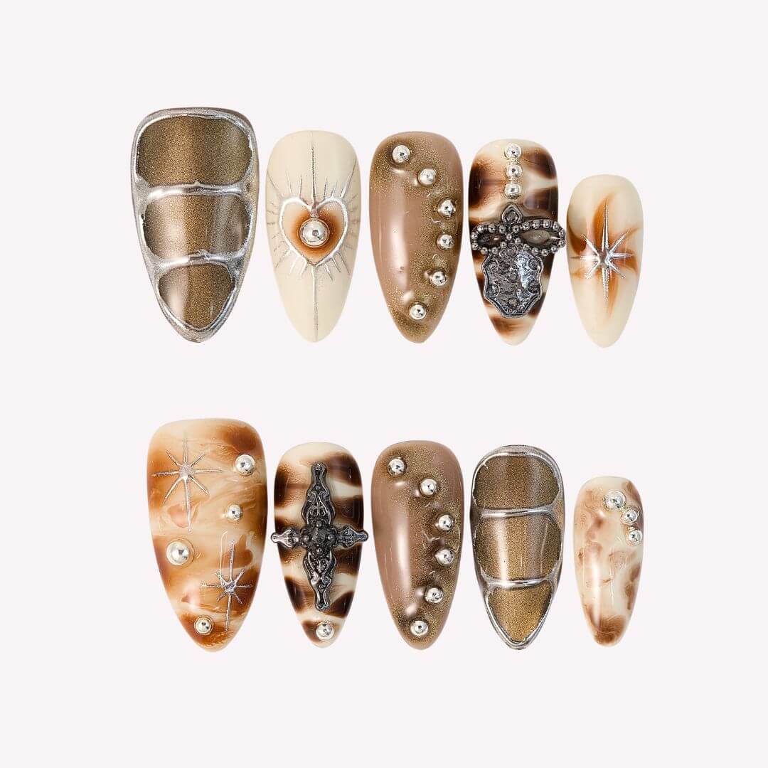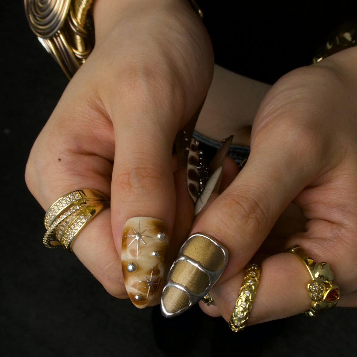 Bring the magic of desert starlight to your fingertips with Dune Glimmer by Swara Nails. These press-on nails feature rich brown cat-eye shimmer that glows like sunlit sand, paired with silver accents, tiny pearls, star motifs, and a soft gradient finish. A dreamy blend of earthy warmth and celestial sparkle.