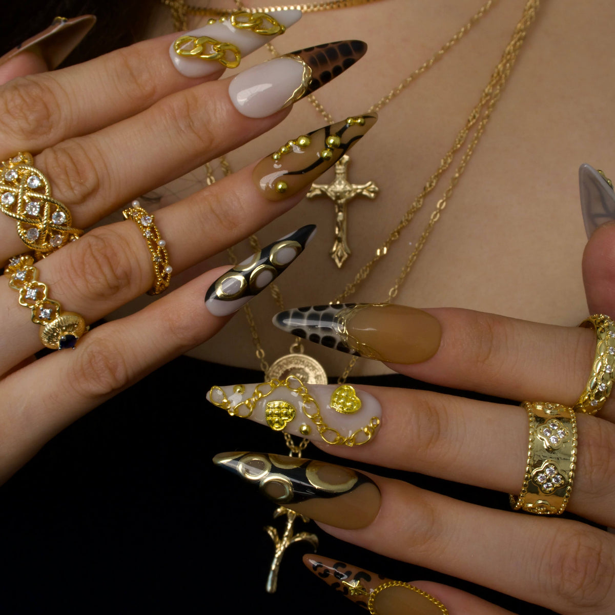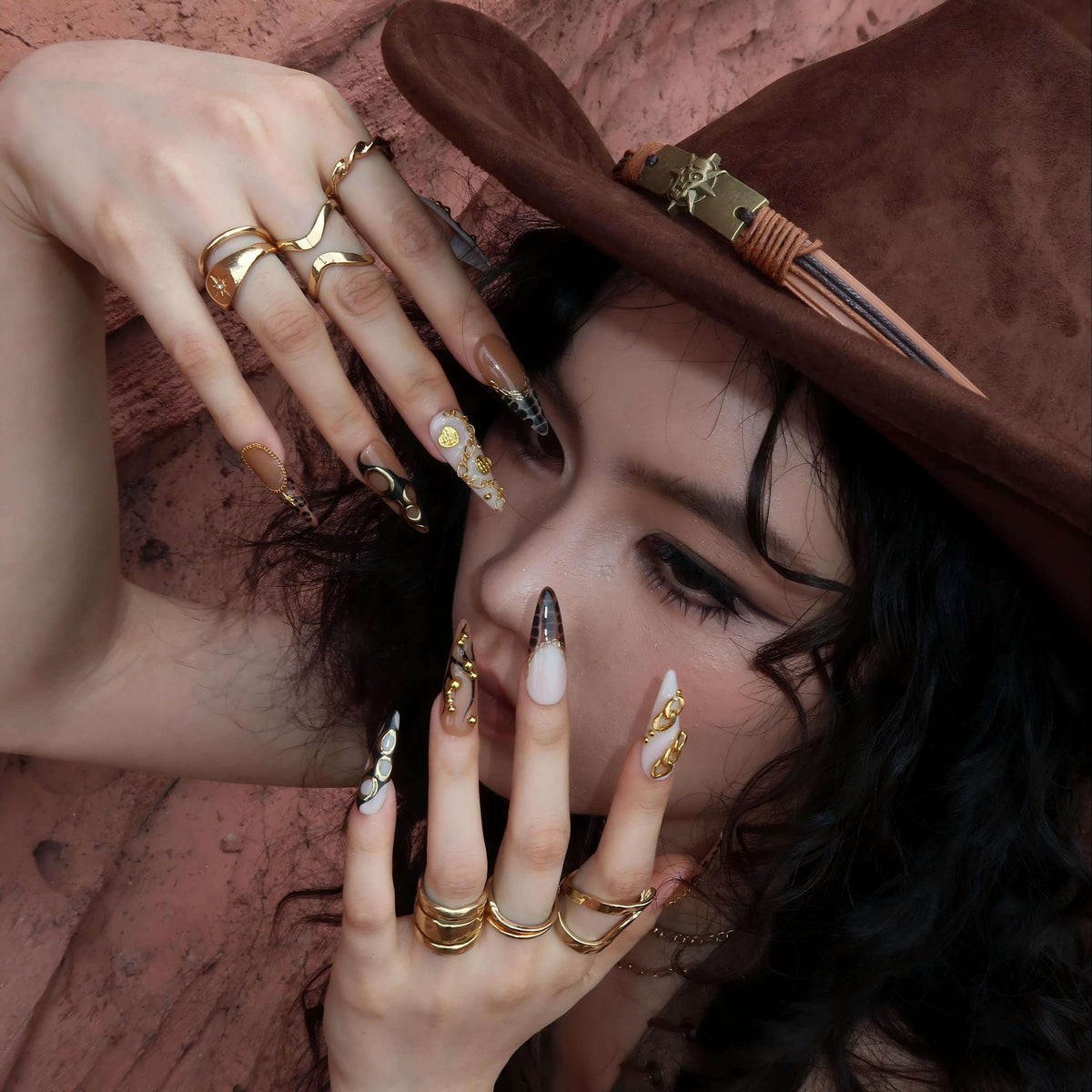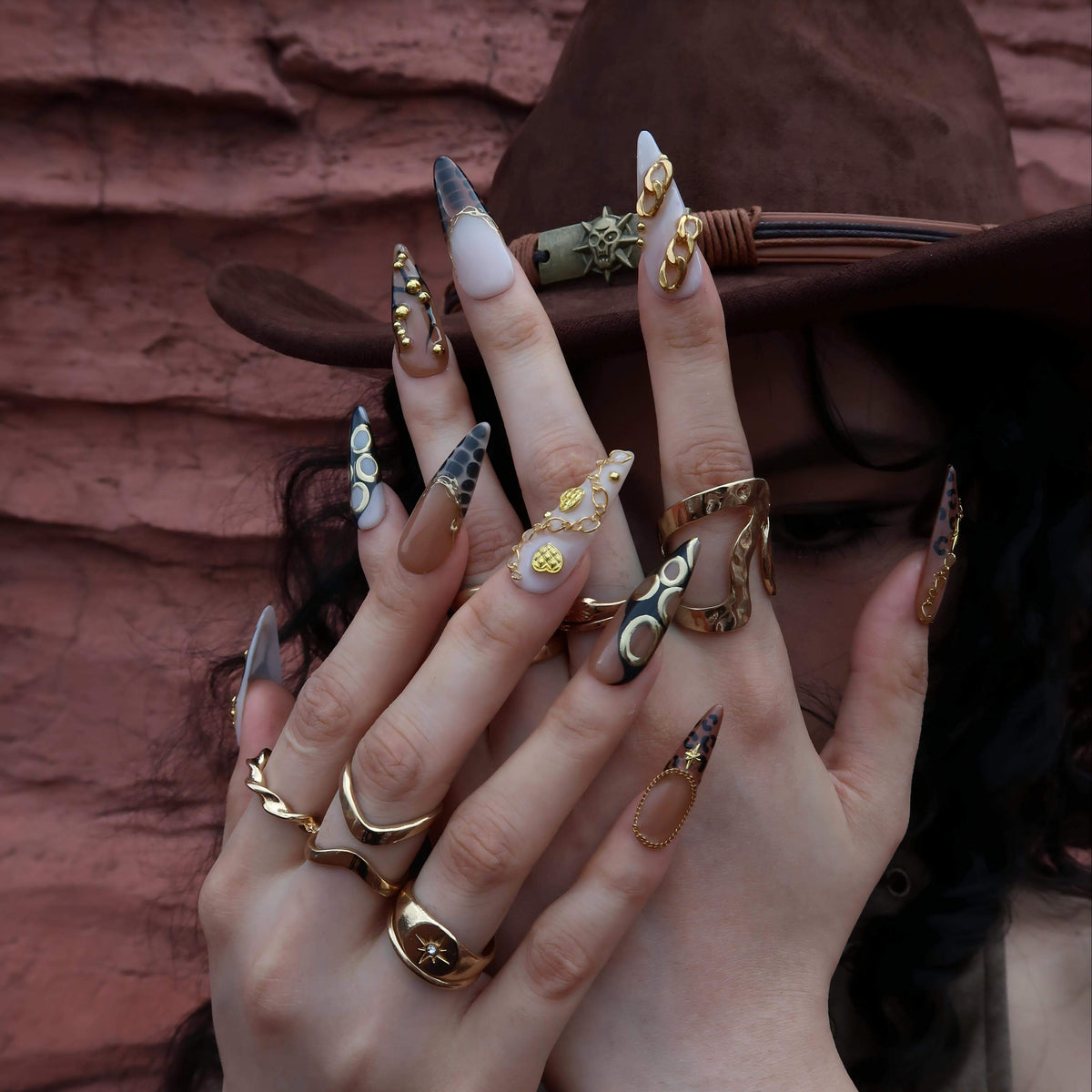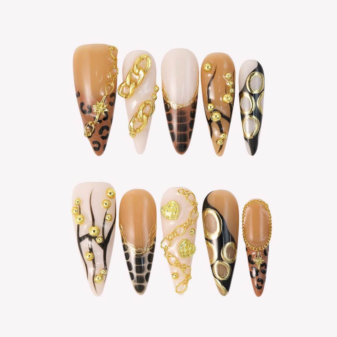 Unleash your wild side with Express Yourself from Swara Nails. These press-on nails feature a brownish nude base with a bold French tip and leopard print accents, finished with gold beads and metallic charms. A fierce, festival-ready look that’s all about confidence and attitude.