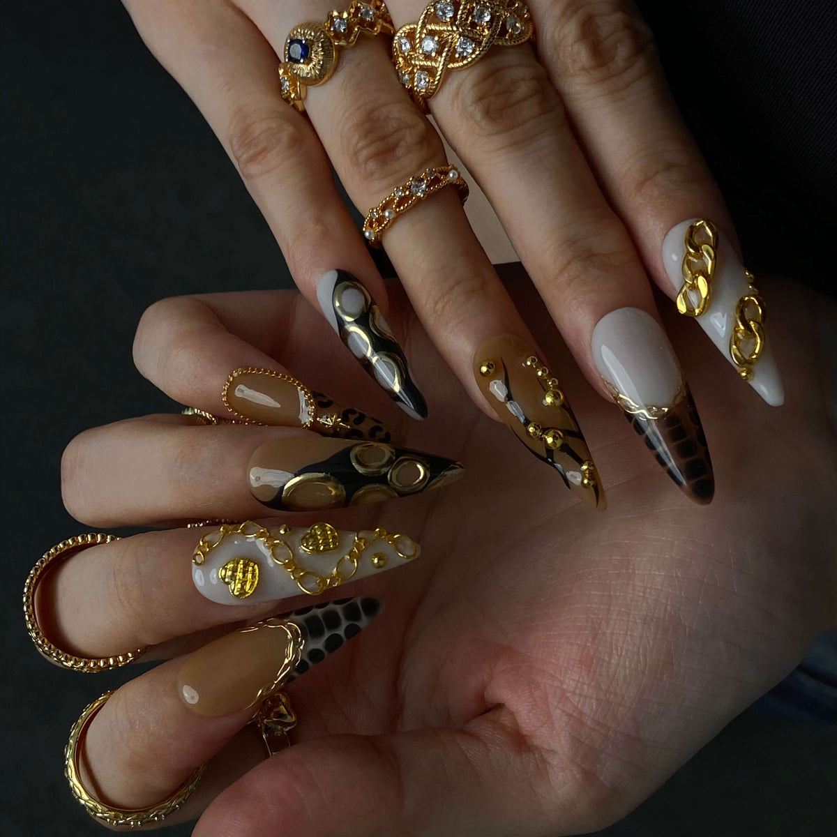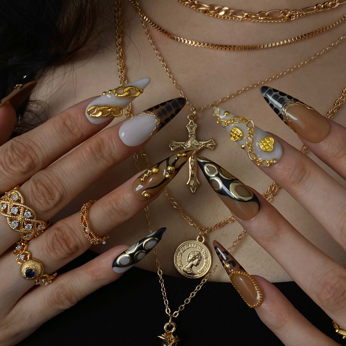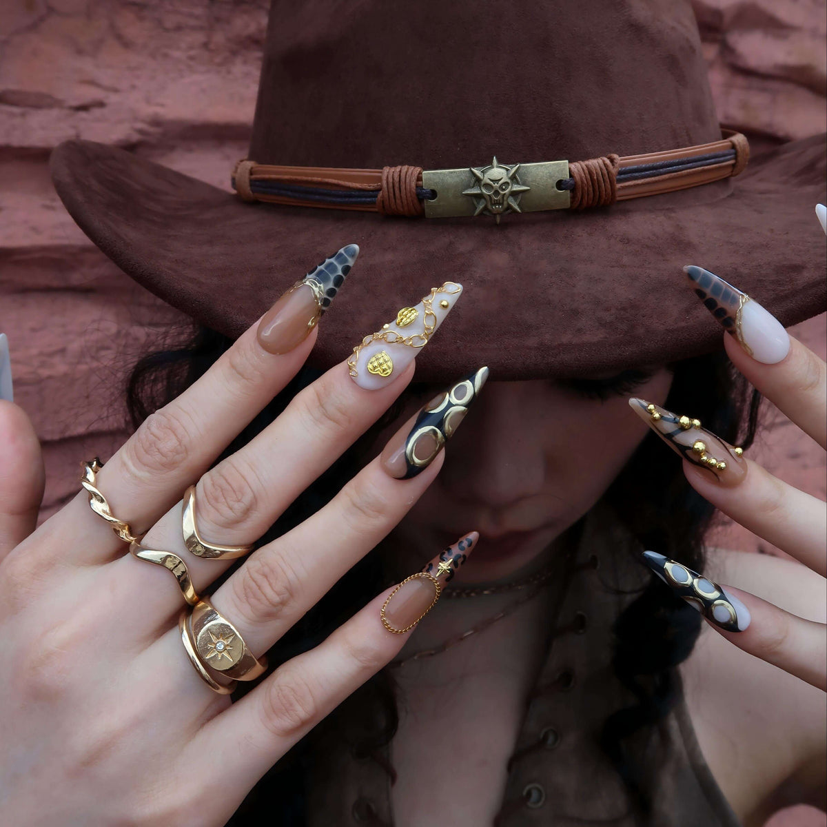Unleash your wild side with Express Yourself from Swara Nails. These press-on nails feature a brownish nude base with a bold French tip and leopard print accents, finished with gold beads and metallic charms. A fierce, festival-ready look that’s all about confidence and attitude.