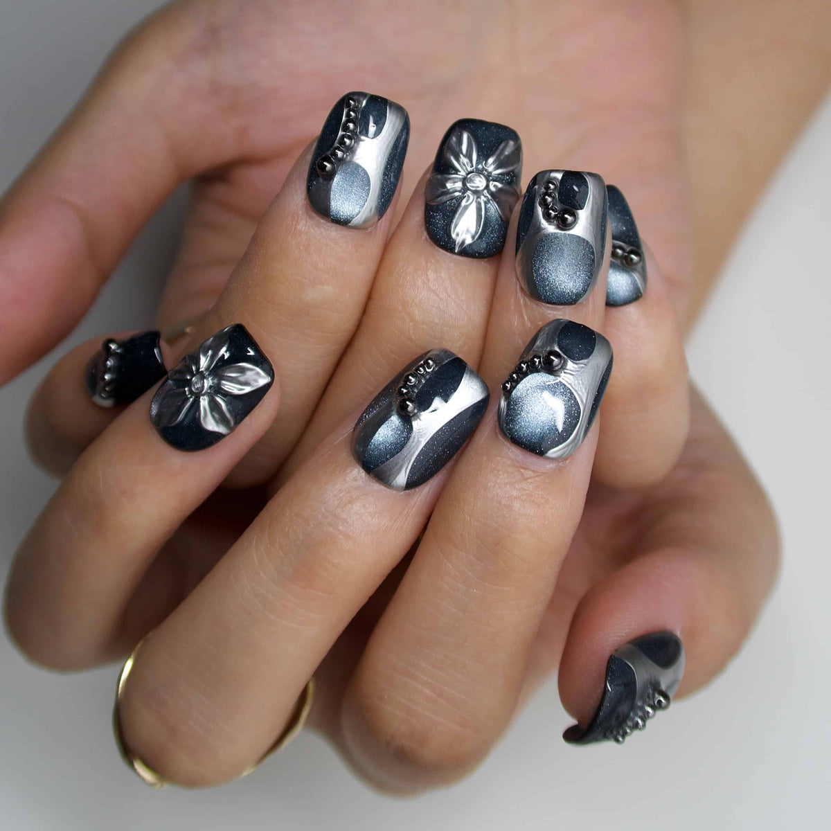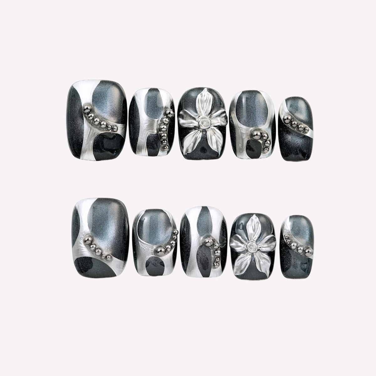 Elevate your style with Glow Up by Swara Nails. These press-on nails feature a black cat-eye base, accented with silver lines, 3D silver flowers, and delicate silver beads. Perfect for a chic, eye-catching look, crafted with salon-quality materials and reusable for multiple wears.