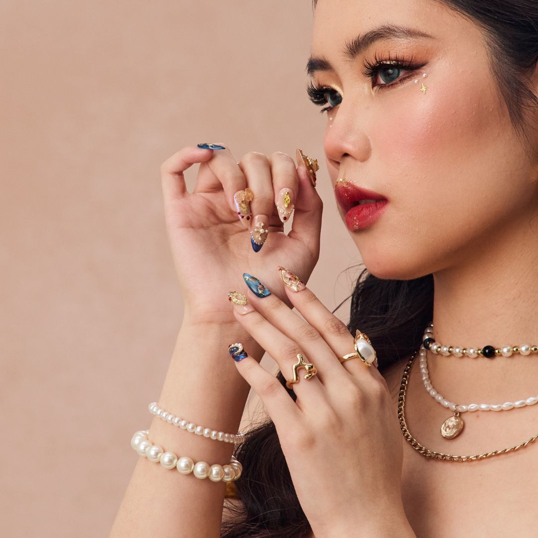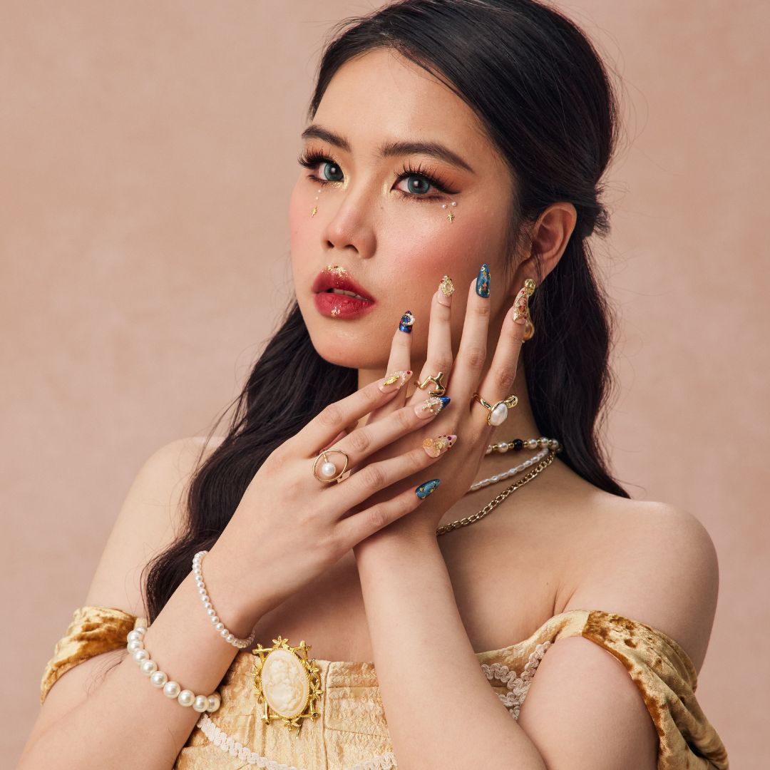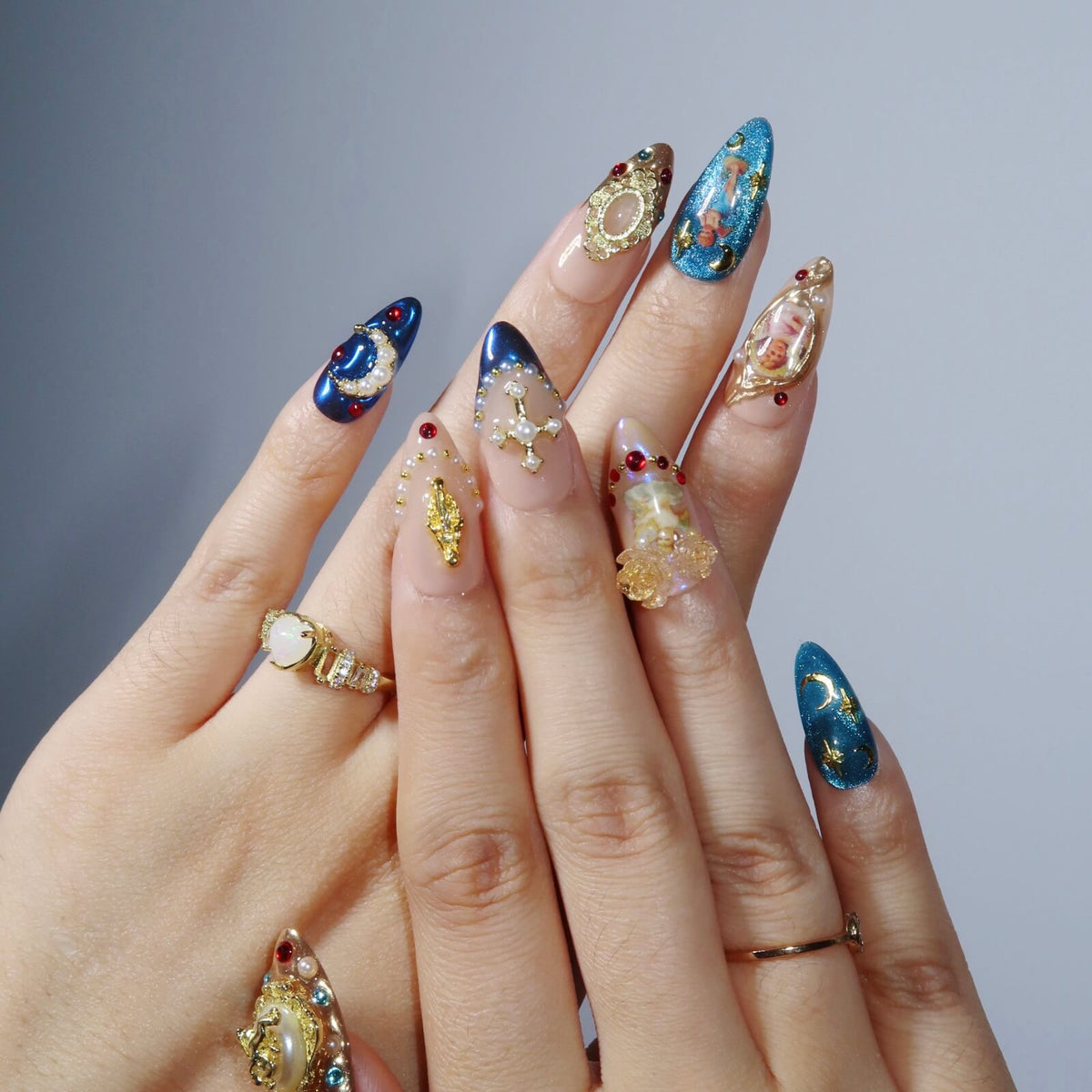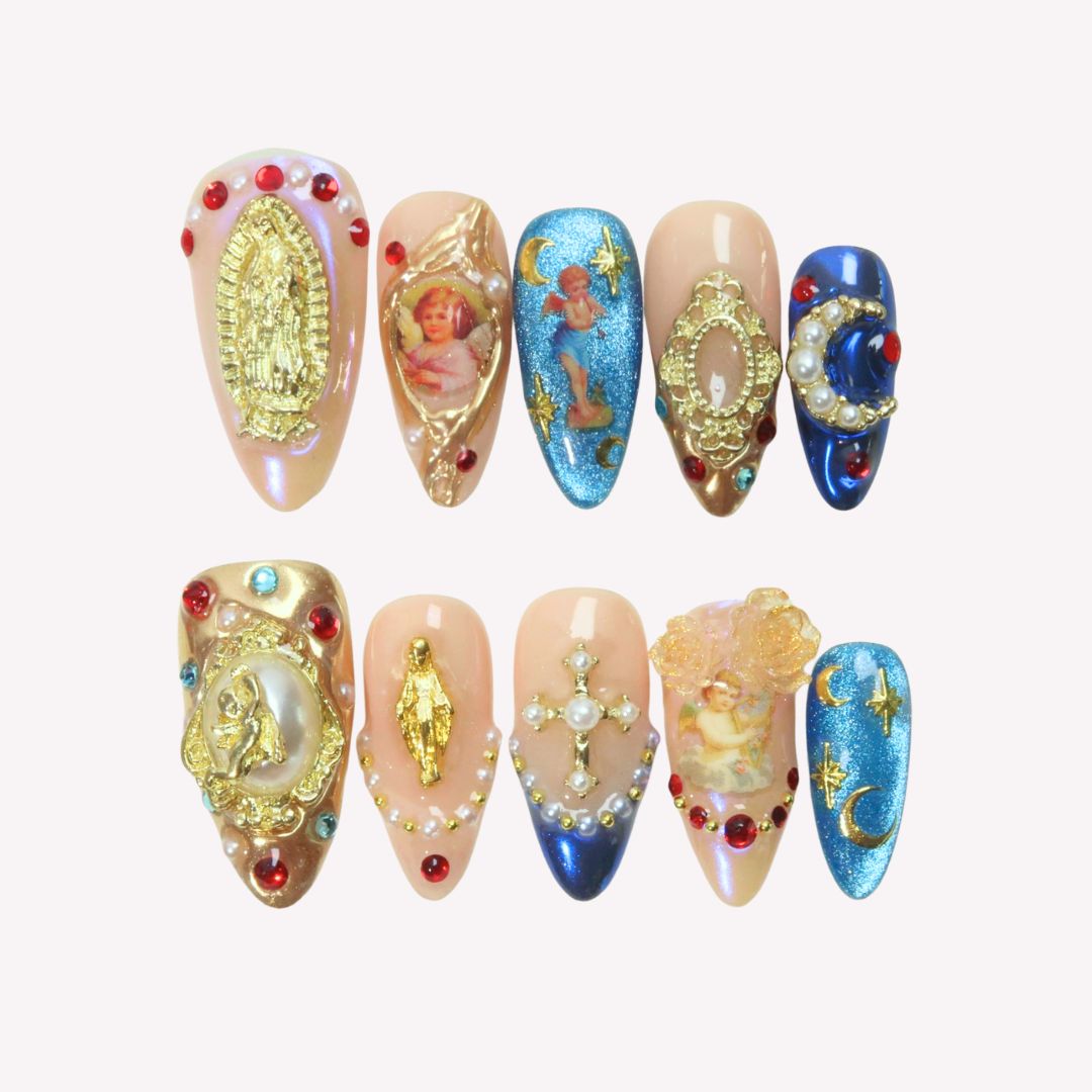 Embrace celestial elegance with Heavenly Embrace from Ersa Nails. Featuring a nude base, this set blends serene blue and radiant gold tones, creating a divine harmony. Beautiful angel motifs add a heavenly touch, while luxurious gold embellishments, along with star and moon patterns, elevate the design. Sparkling rhinestones complete the look, adding a touch of glamour. Heavenly Embrace is the perfect choice for those seeking a sophisticated, otherworldly manicure that radiates grace and beauty.