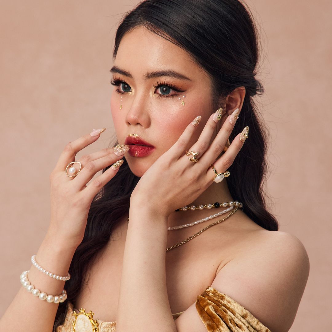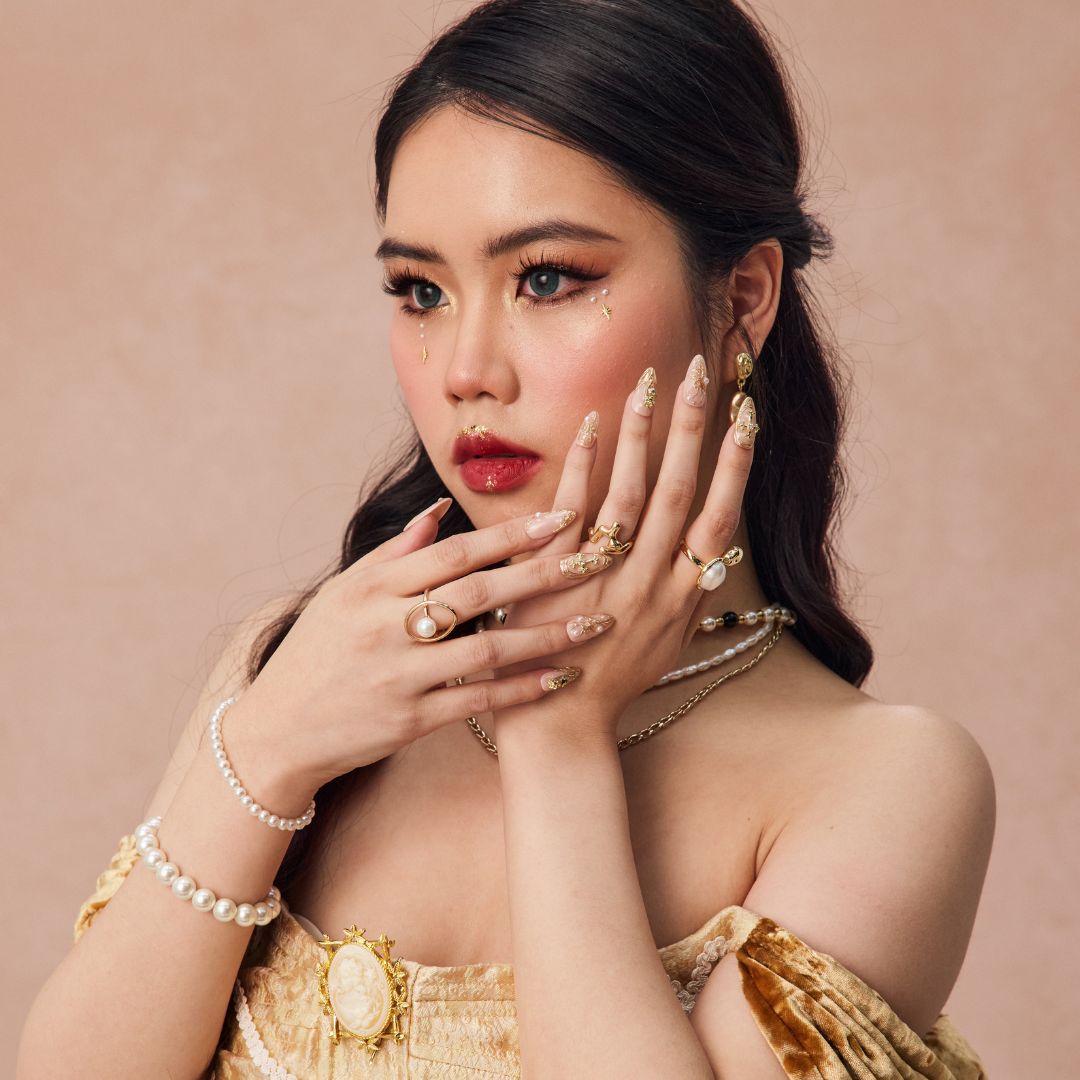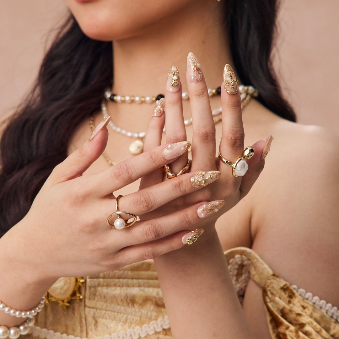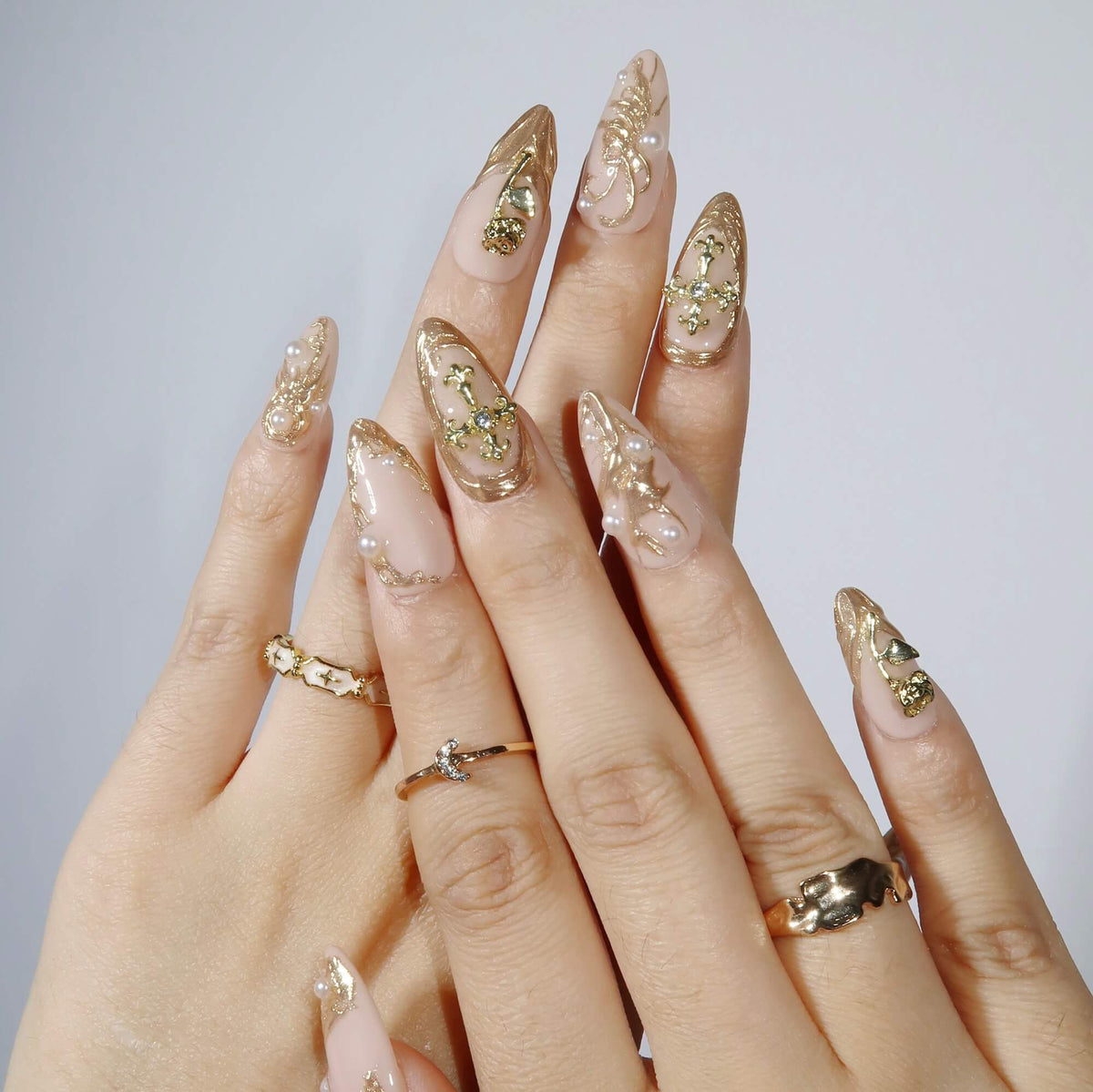 Discover the divine elegance of Holy Roses, a press-on nail set that combines grace and spirituality in a timeless design. The soft nude base is beautifully enhanced with irregular gold lines, adding a modern touch to its classic appeal. Golden crosses and intricate rose embellishments are scattered across the nails, symbolizing love, faith, and beauty. Delicate pearl accents further elevate the look, creating a luxurious, refined finish. Whether you're seeking a sophisticated, spiritual touch or simply want to add a bit of opulence to your look, Holy Roses is the perfect choice for any occasion.