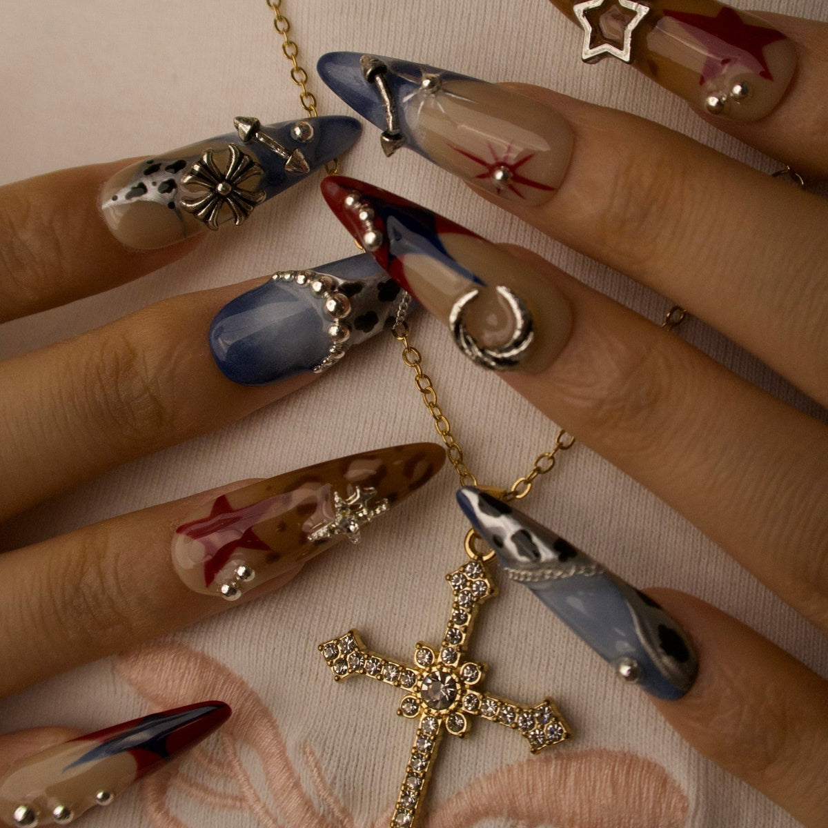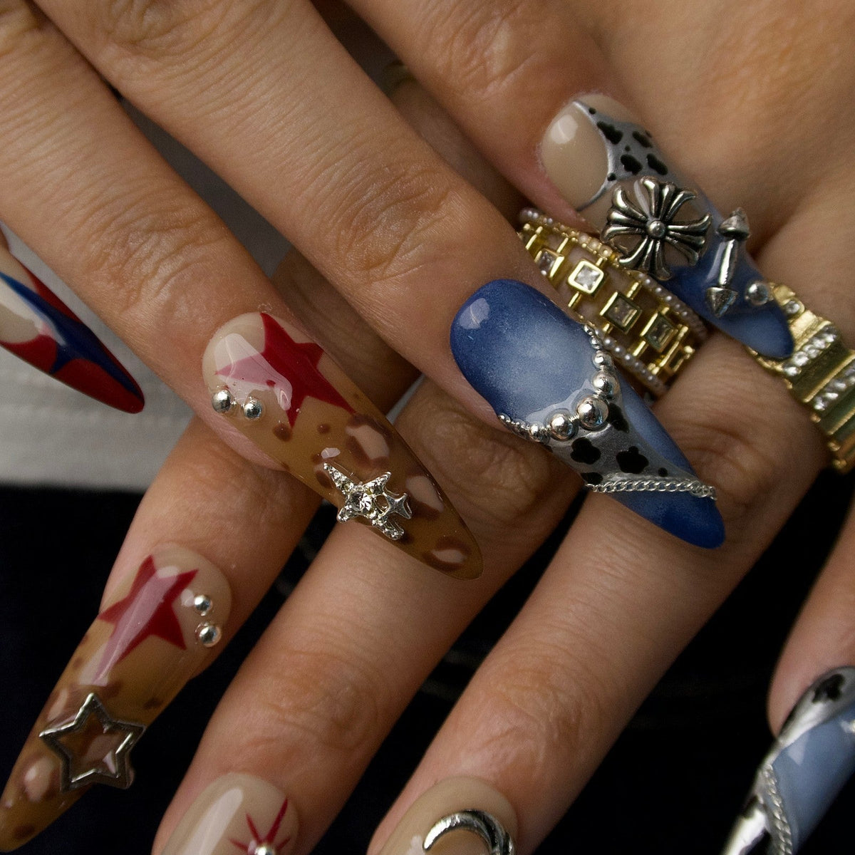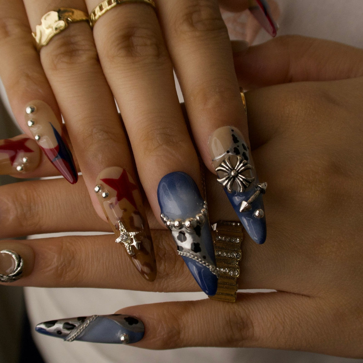 Shine bright with Like A Star from Swara Nails. These press-on nails feature a nude base with bold red and denim blue accents, giving off a playful, Americana-inspired charm. With silver embellishments, cow print details, and sparkling star motifs, this set is your perfect match for standing out in any crowd—fun, daring, and full of personality.