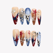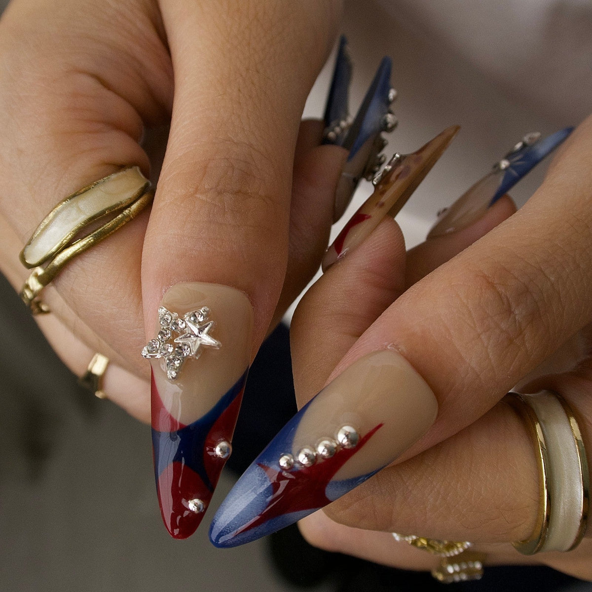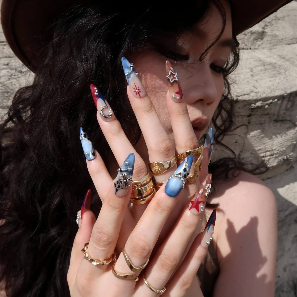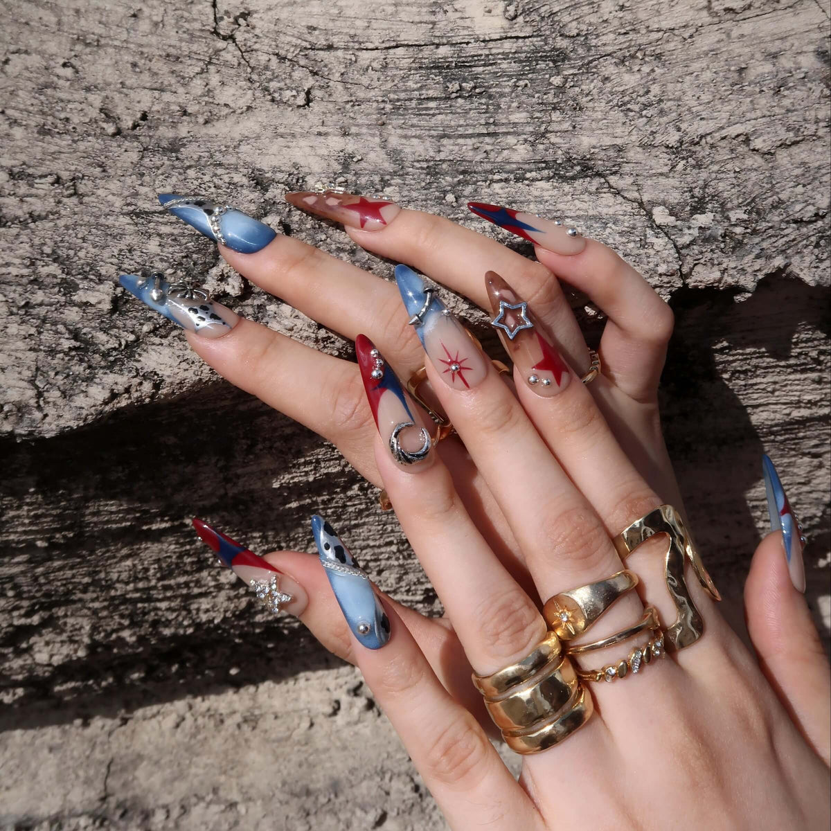Shine bright with Like A Star from Swara Nails. These press-on nails feature a nude base with bold red and denim blue accents, giving off a playful, Americana-inspired charm. With silver embellishments, cow print details, and sparkling star motifs, this set is your perfect match for standing out in any crowd—fun, daring, and full of personality.