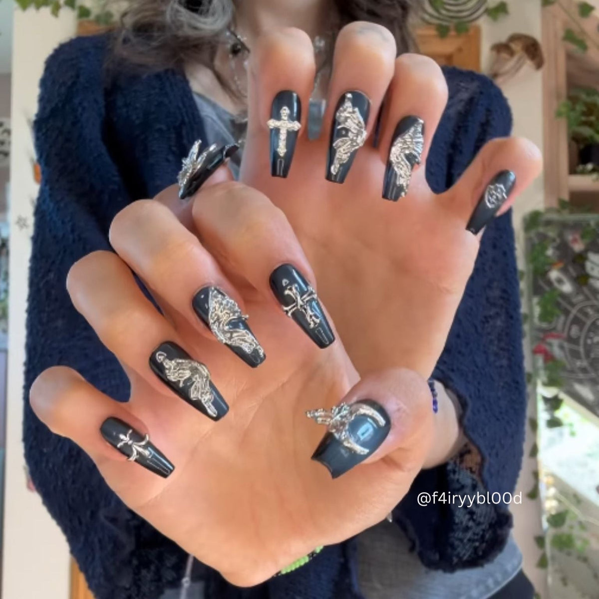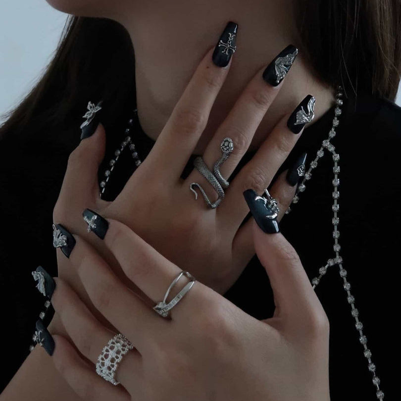 NAIL SHAPE: Medium Coffin APPROX. LENGTH: 22MM Unveiling Lunar Fantasies, a reflection of ethereal dreams and serene nights. Set against a deep midnight hue, each nail showcases an intricate emblem - from the crescent moon's tender curve,to the delicate wings of a butterfly. This nail set is a testament to life's profound symbols, each carrying its own tale and mystique. Crafted with meticulous attention to detail, the set mirrors Ersa's commitment to narrating stories through exquisite artistry. With Lunar Elegance, you don't just wear nails; you adorn yourself with tales as ancient as time.