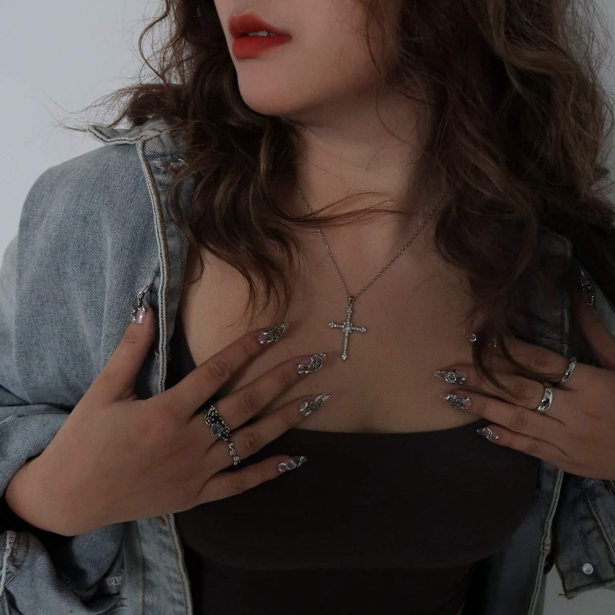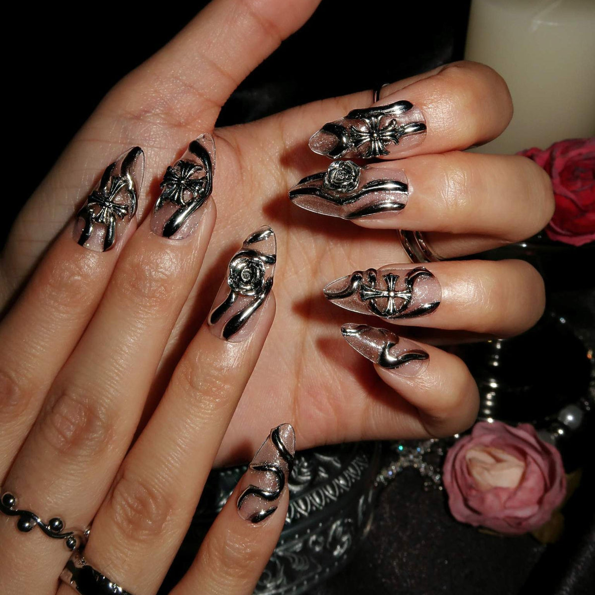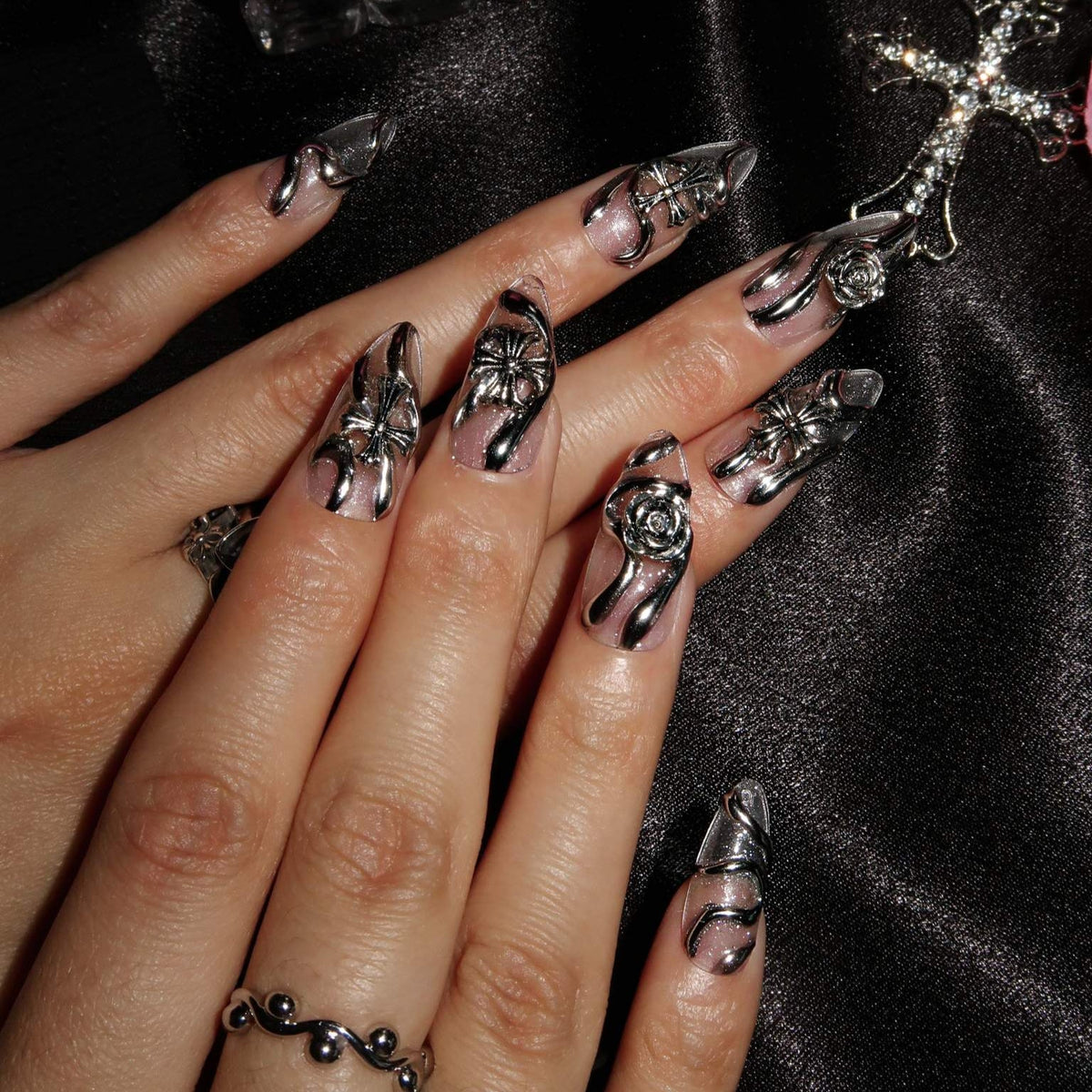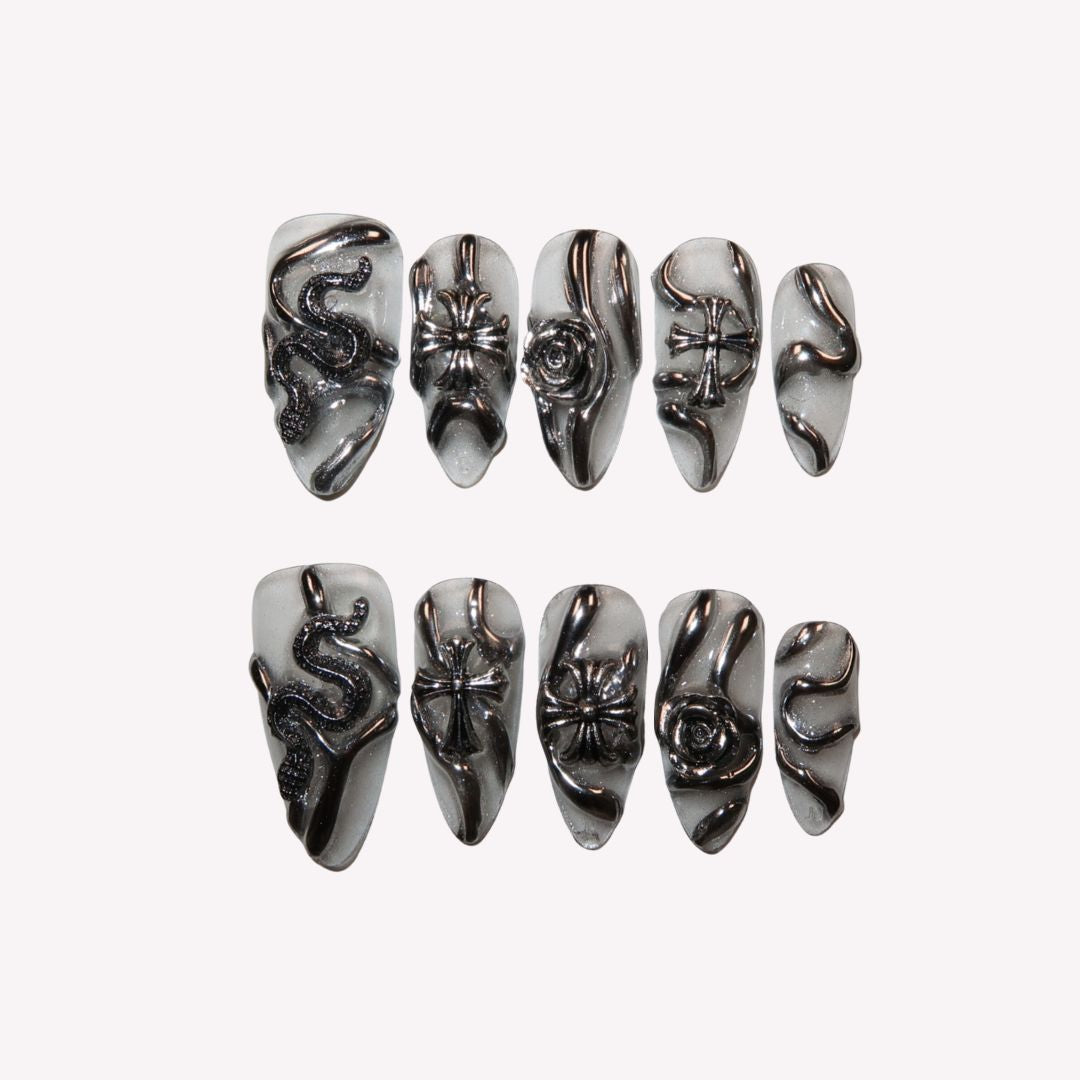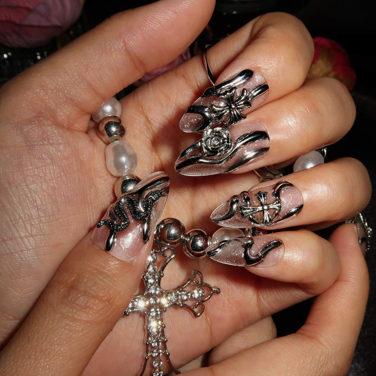 Swara Nails presents the Argentum Mystique set, a captivating ensemble of press-on nails that embody the sleek and enigmatic allure of silver. Each nail is a canvas showcasing an array of intricate designs, from serpentine twists to celestial patterns, all gleaming with a metallic sheen that mimics the mysterious moonlit night. The reflective surface is not just a style statement but a mirror to the soul, inviting onlookers to a world of wonder and elegance. Perfect for those who wish to make a bold statement, the Argentum Mystique set is a testament to the fusion of art and fashion on the tips of your fingers. Whether it's a gala or a night out with friends, these nails promise to infuse your look with an air of sophistication and a touch of mystic charm.