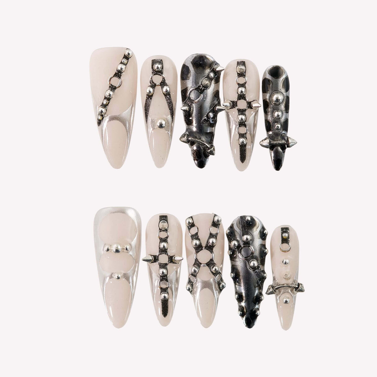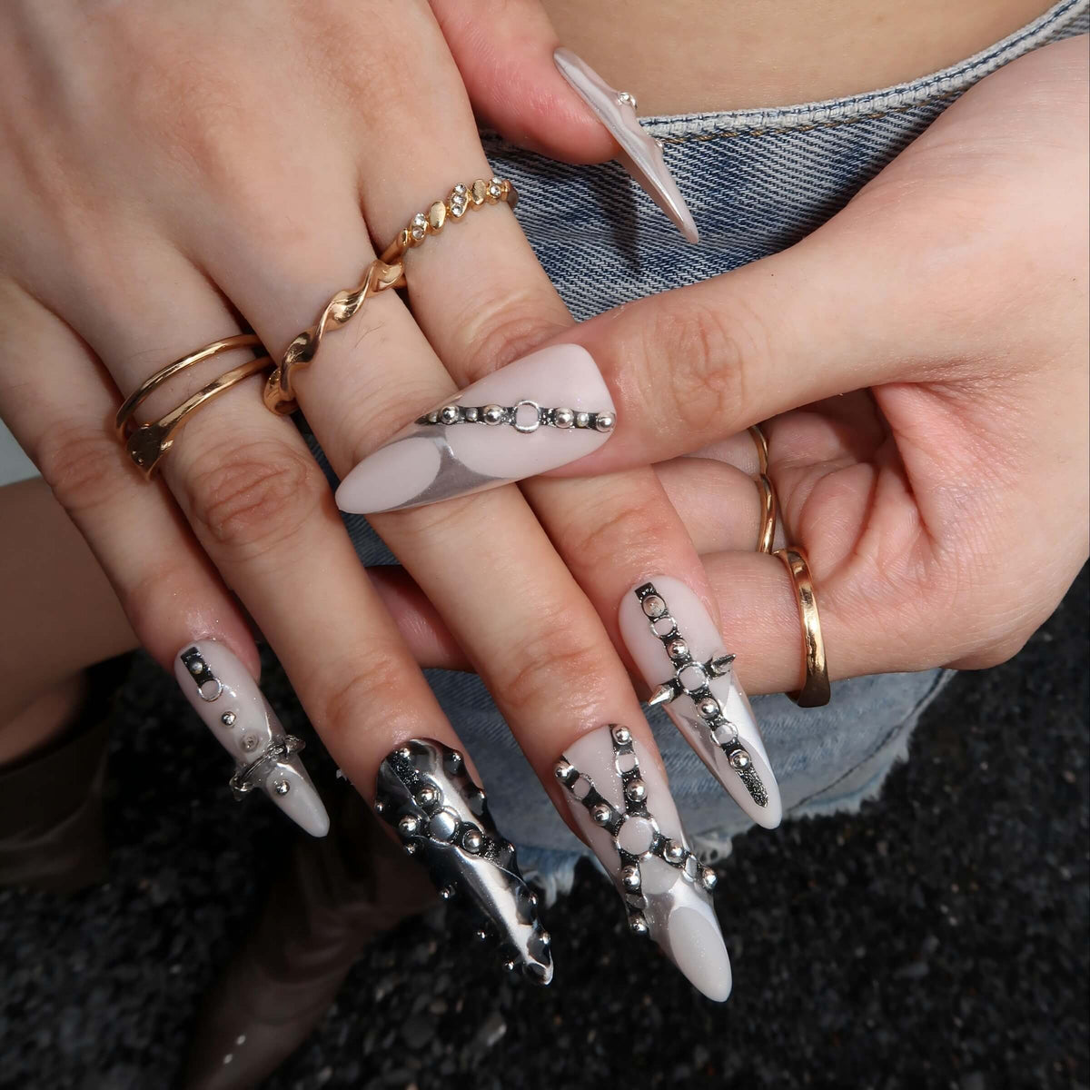 Metal Mesh by Swara Nails is a daring press-on nails design made for music festivals and bold self-expression. Featuring a high-shine silver chrome base, edgy chain details, and metallic studs, this set brings industrial glam to your fingertips—perfect for standing out under flashing lights and loud beats.