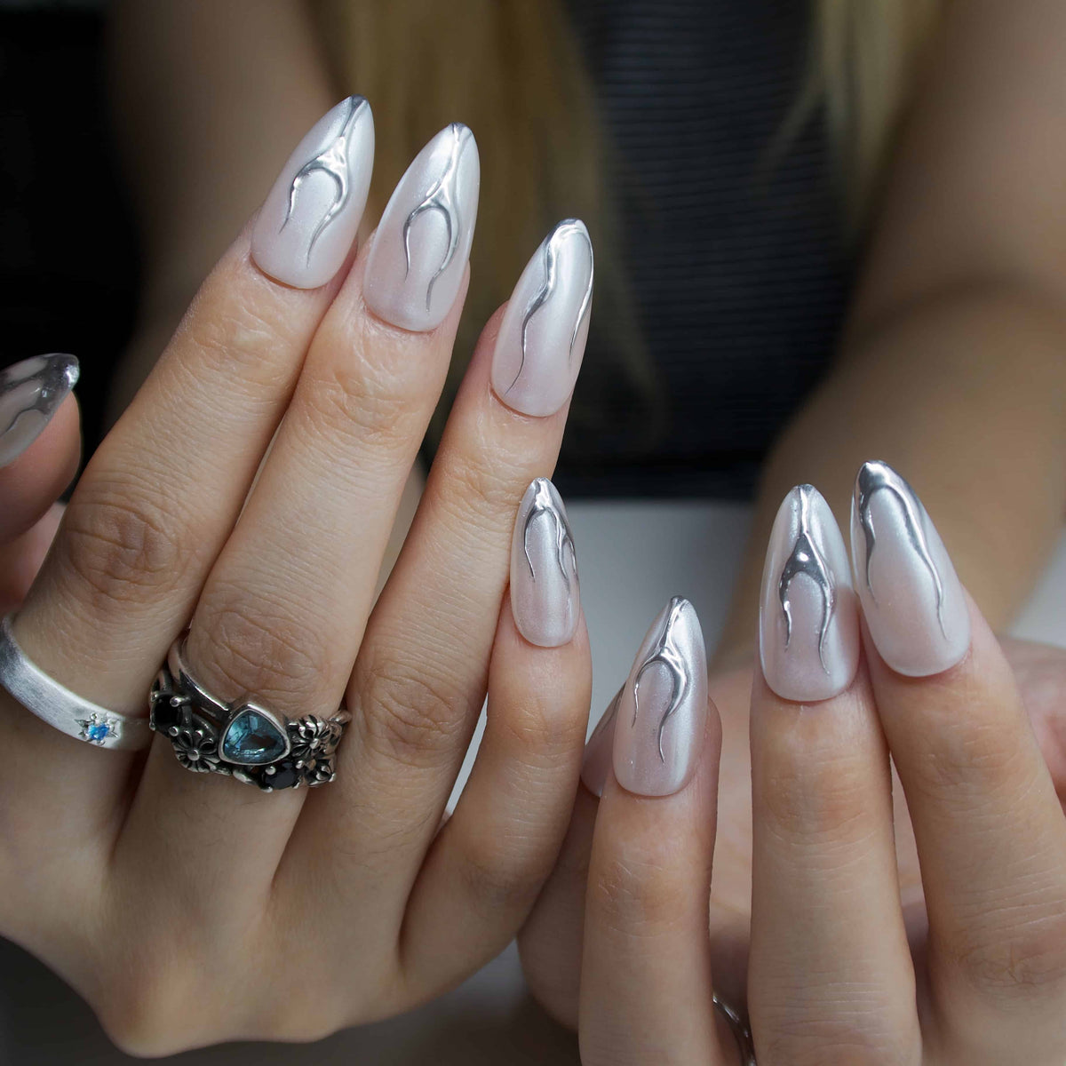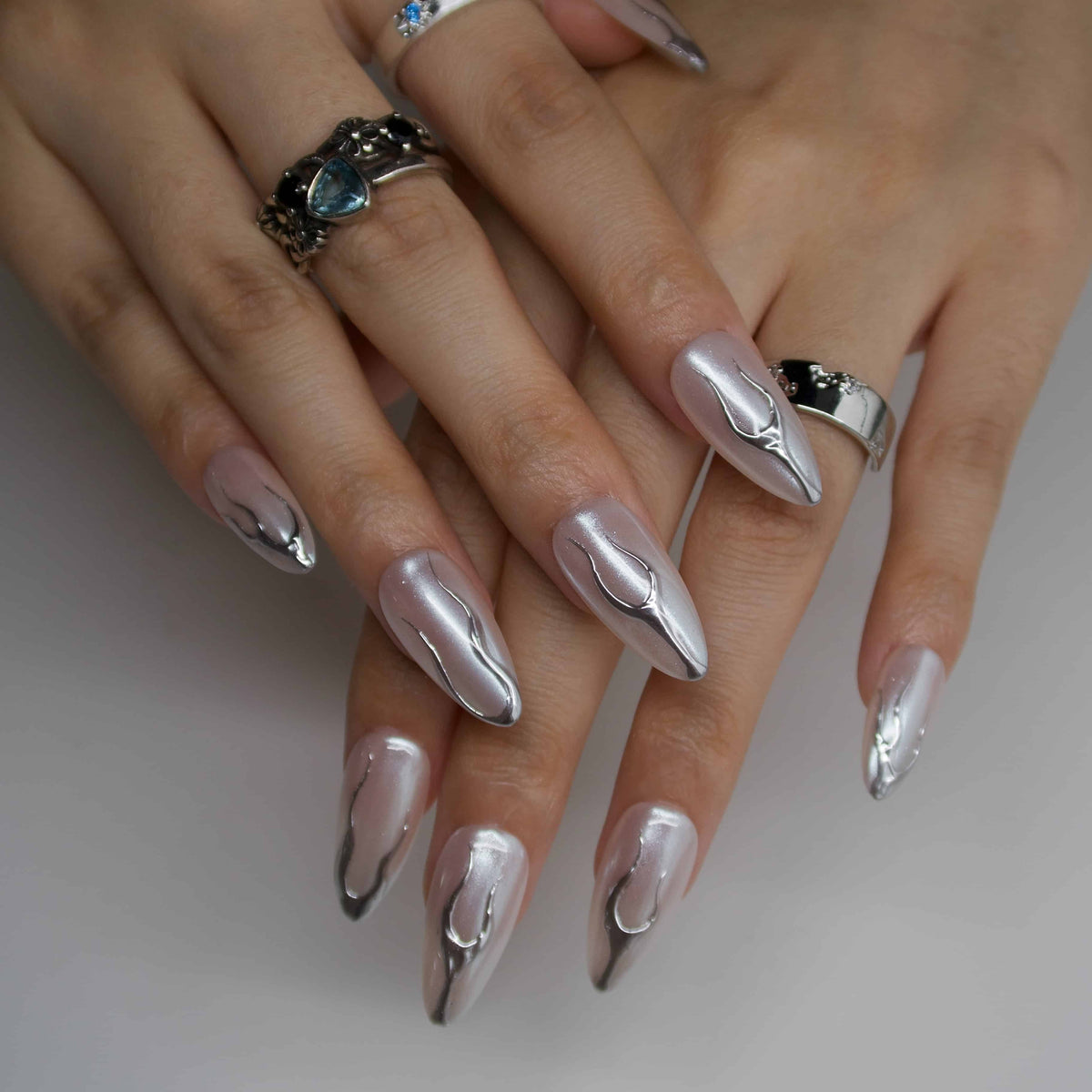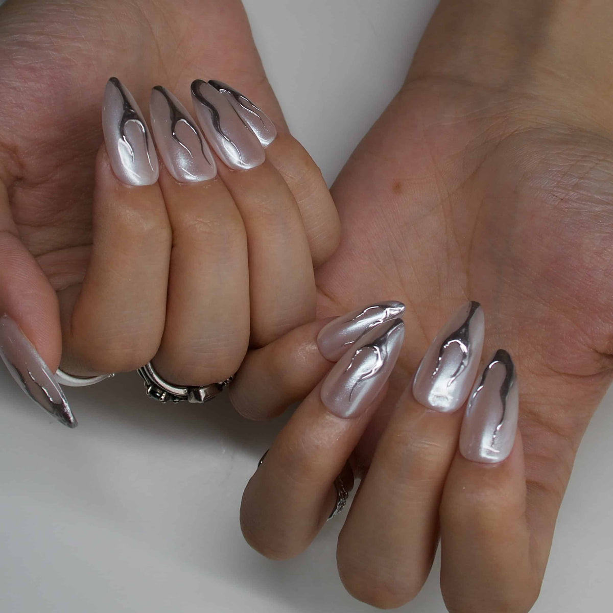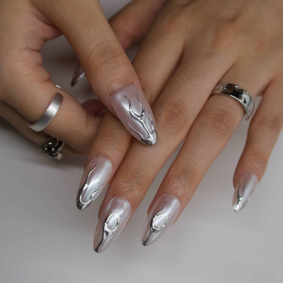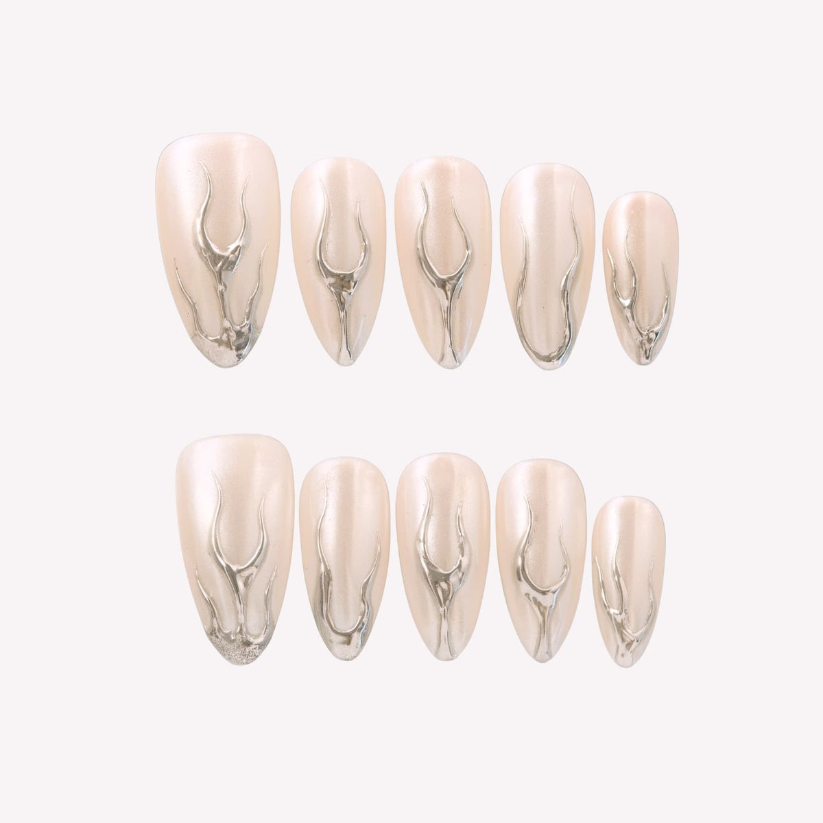 Elevate your manicure game with Next Level by Swara Nails. This luxurious set features a sleek nude-chrome base that exudes a high-gloss finish, complemented by bold, metallic flame-like silver lines at the tips.Designed for those who appreciate both elegance and edge, these press-on nails offer a salon-quality look without the salon visit.