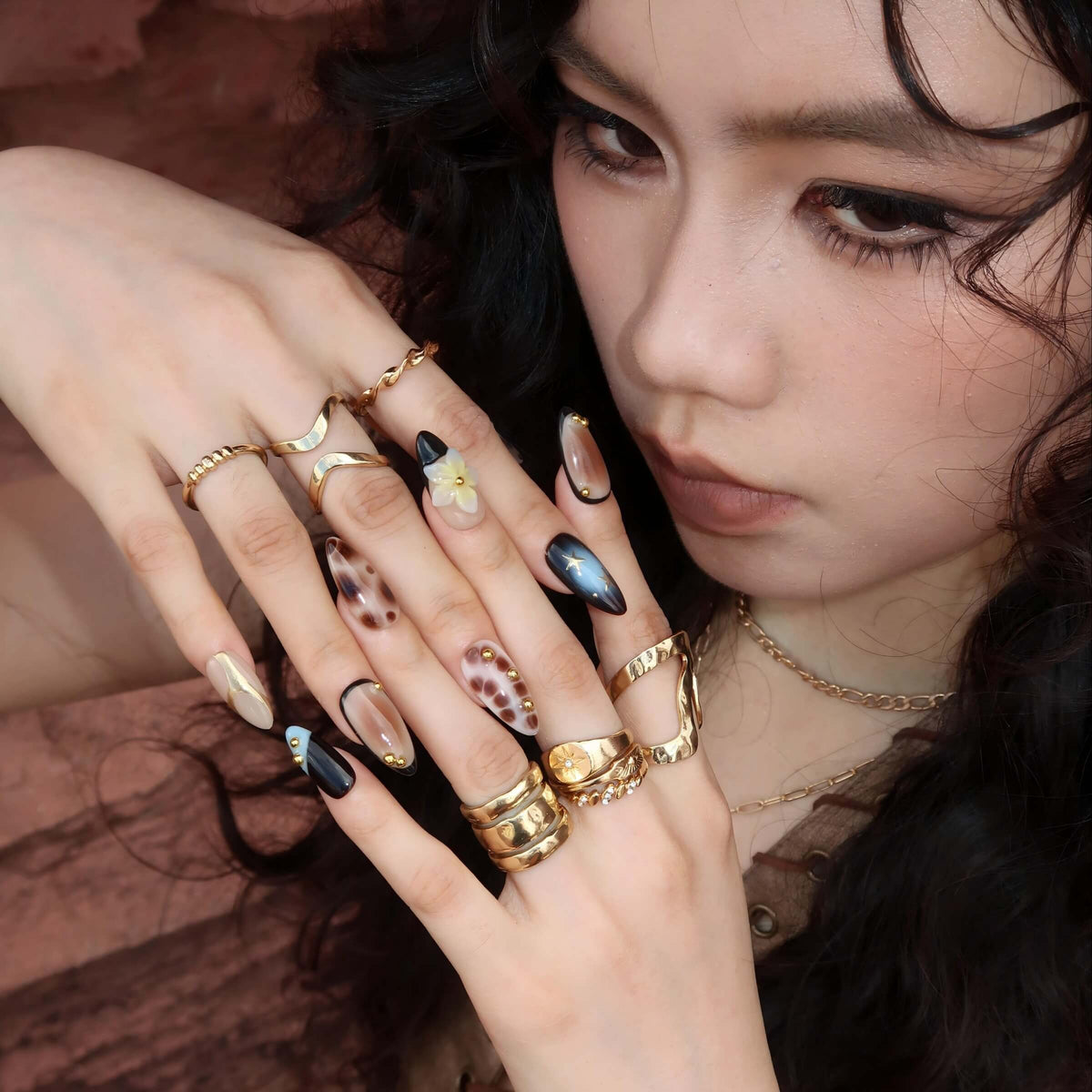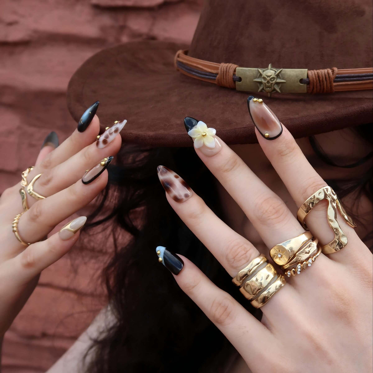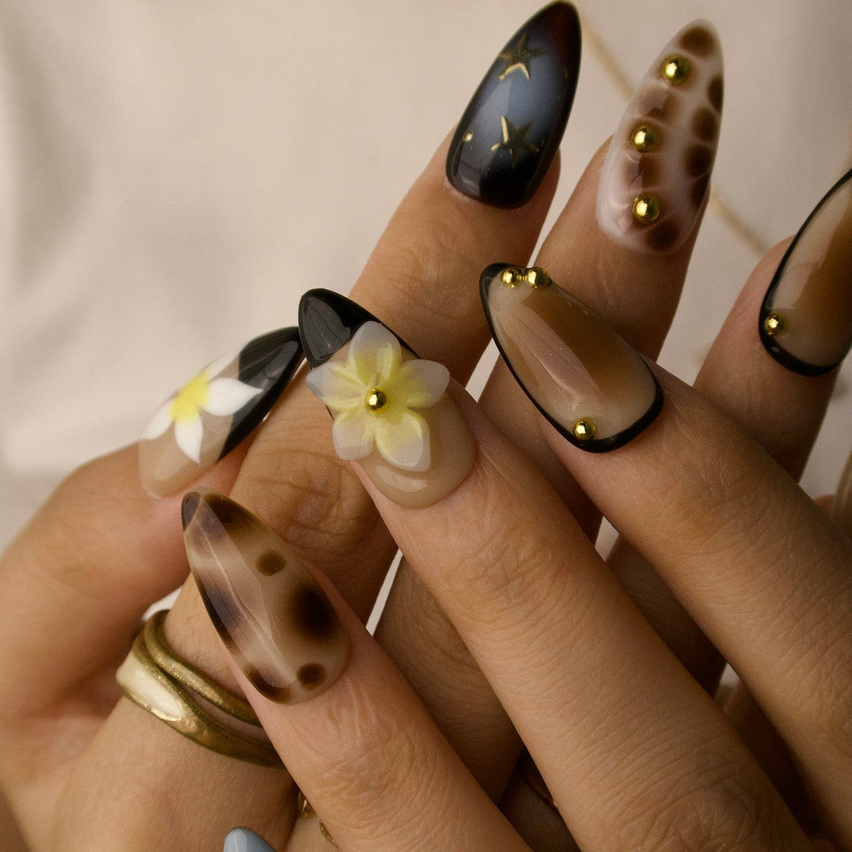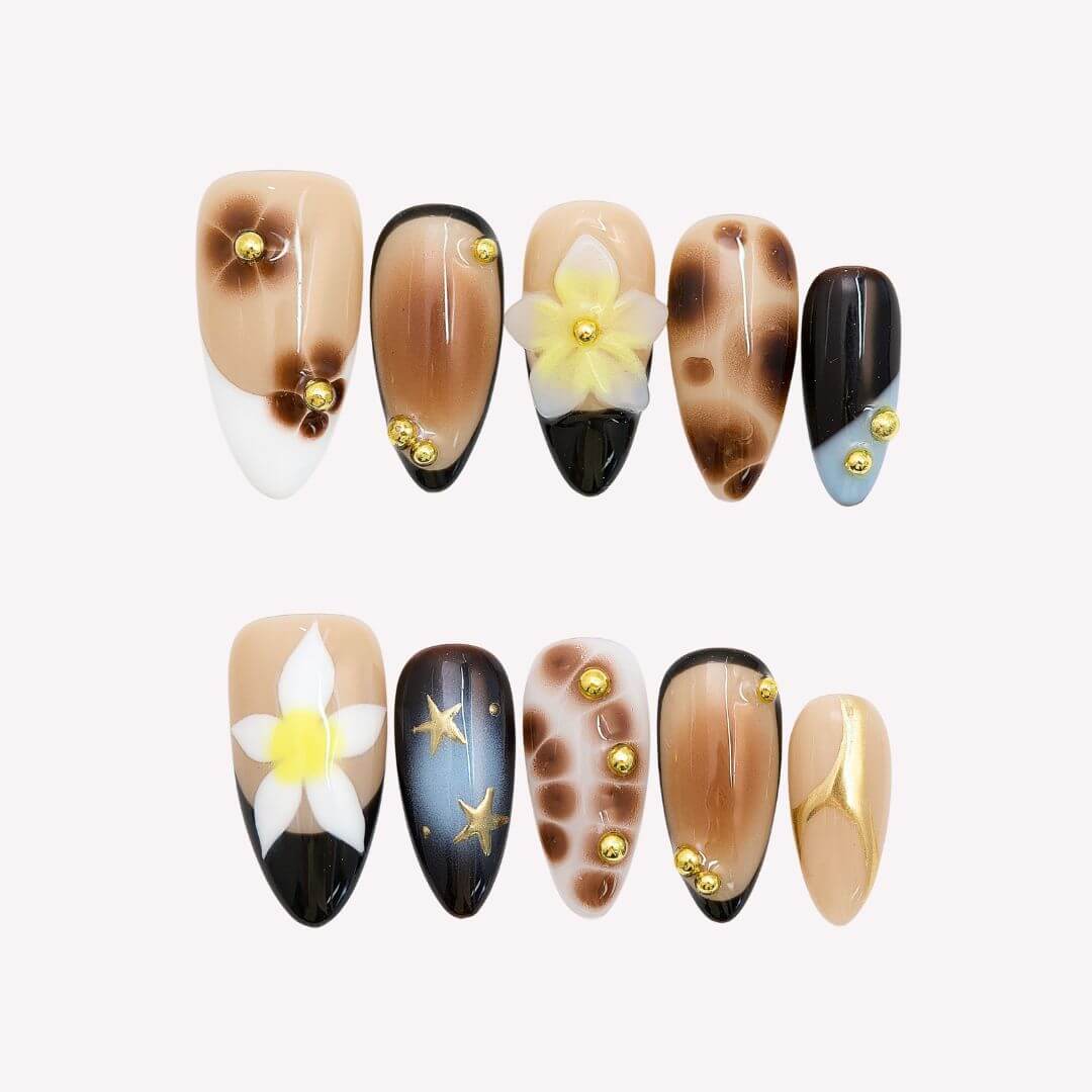 Step into festival season with Rebel Bloom from Swara Nails. These press-on nails feature a nude base with earthy brown and vibrant blue marble accents, bringing a bold yet dreamy vibe. Finished with floral prints, 3D blossoms, gold stars, and tiny beads, this design strikes the perfect balance between soft and striking—just right for music festival looks and free-spirited adventures.