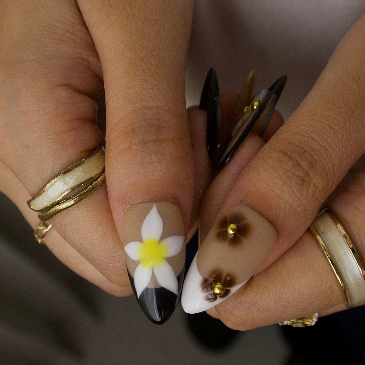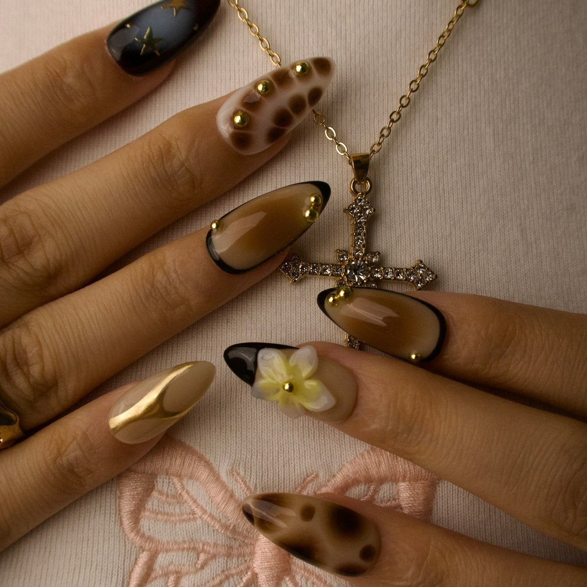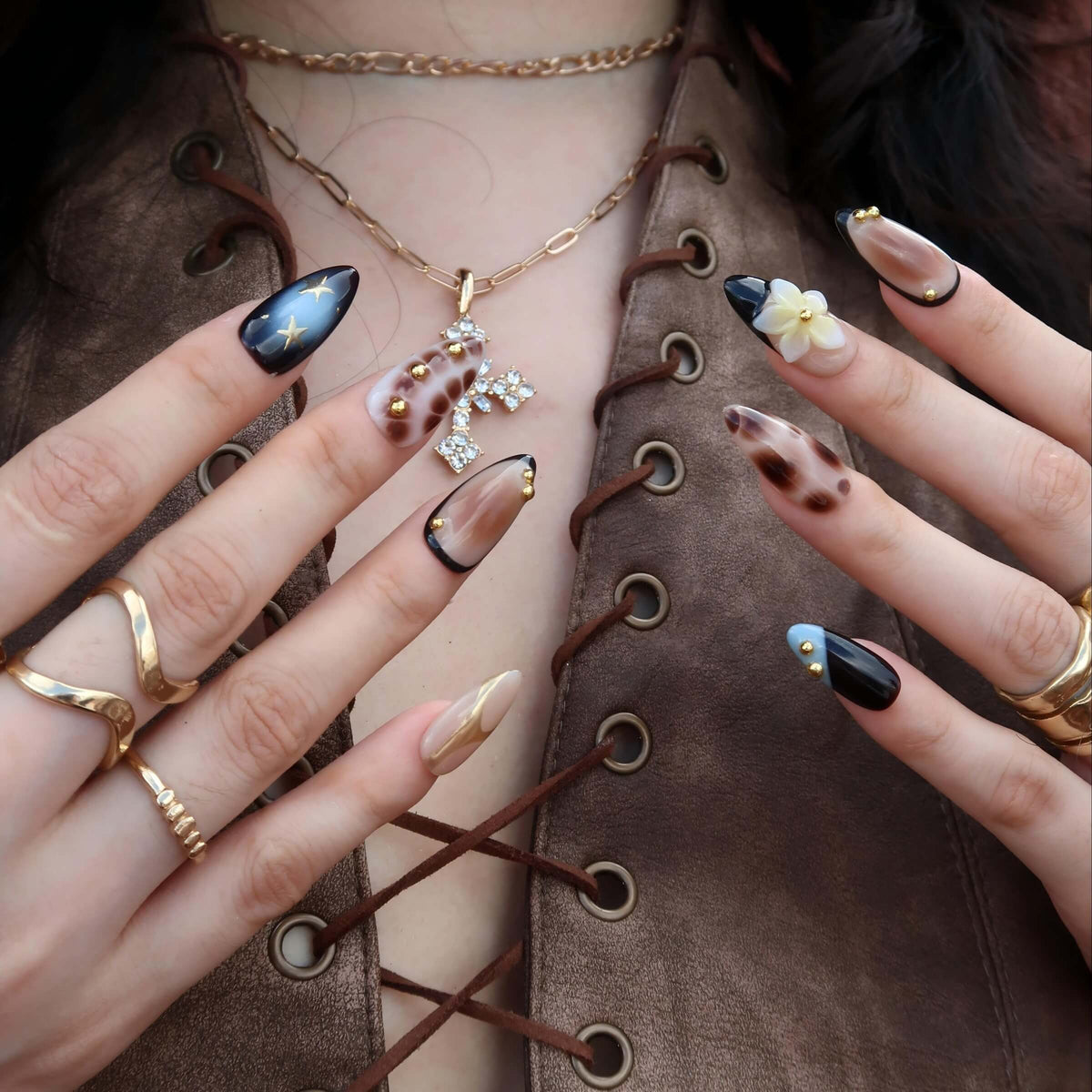 Step into festival season with Rebel Bloom from Swara Nails. These press-on nails feature a nude base with earthy brown and vibrant blue marble accents, bringing a bold yet dreamy vibe. Finished with floral prints, 3D blossoms, gold stars, and tiny beads, this design strikes the perfect balance between soft and striking—just right for music festival looks and free-spirited adventures.