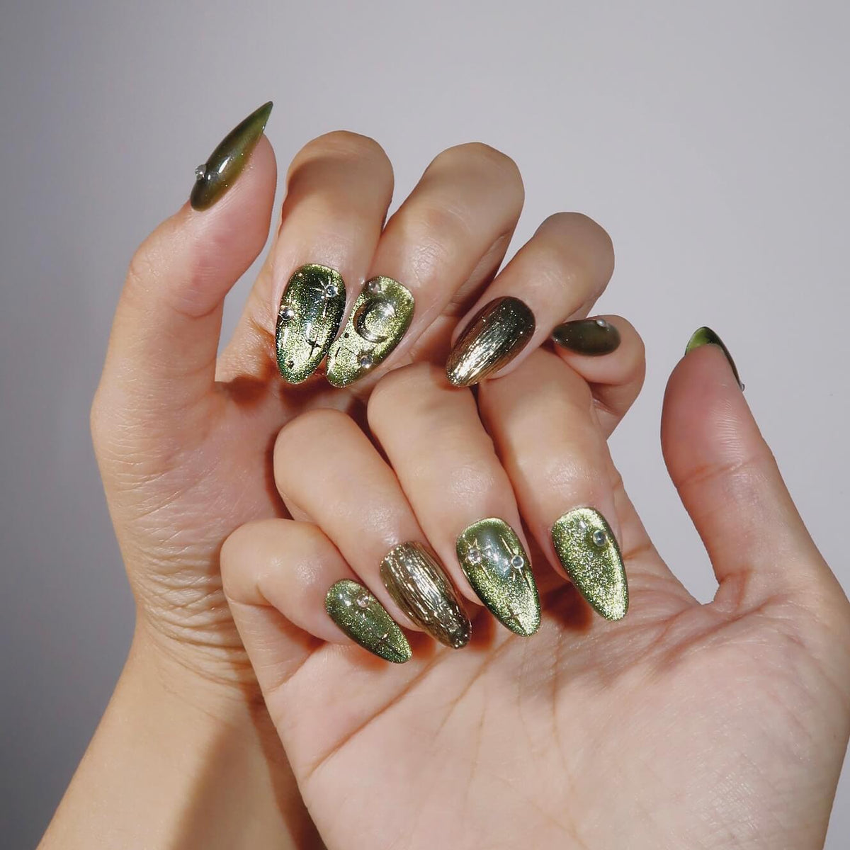 Elevate your nails with Swara Nails' Starry Olive, where the mystique of the night meets the sophistication of fashion. Our olive green base is a symbol of nature's tranquility, embellished with golden celestial bodies that bring a touch of the heavens to your hands. Pearls, the stars of our design, sit at the core of each star, resembling the sun's brilliance. This set is not just a nail accessory; it's a statement of celestial elegance, perfect for those who want to shine as brightly as the stars above.