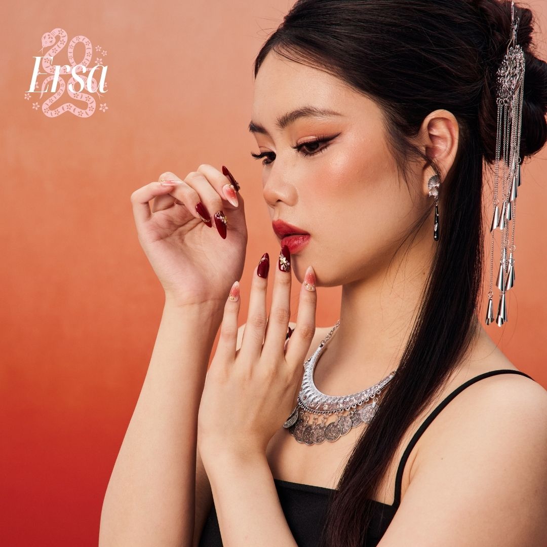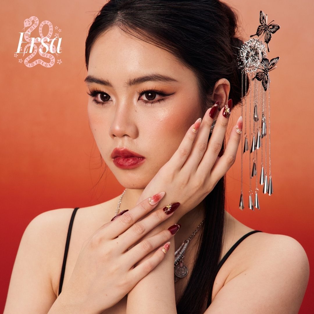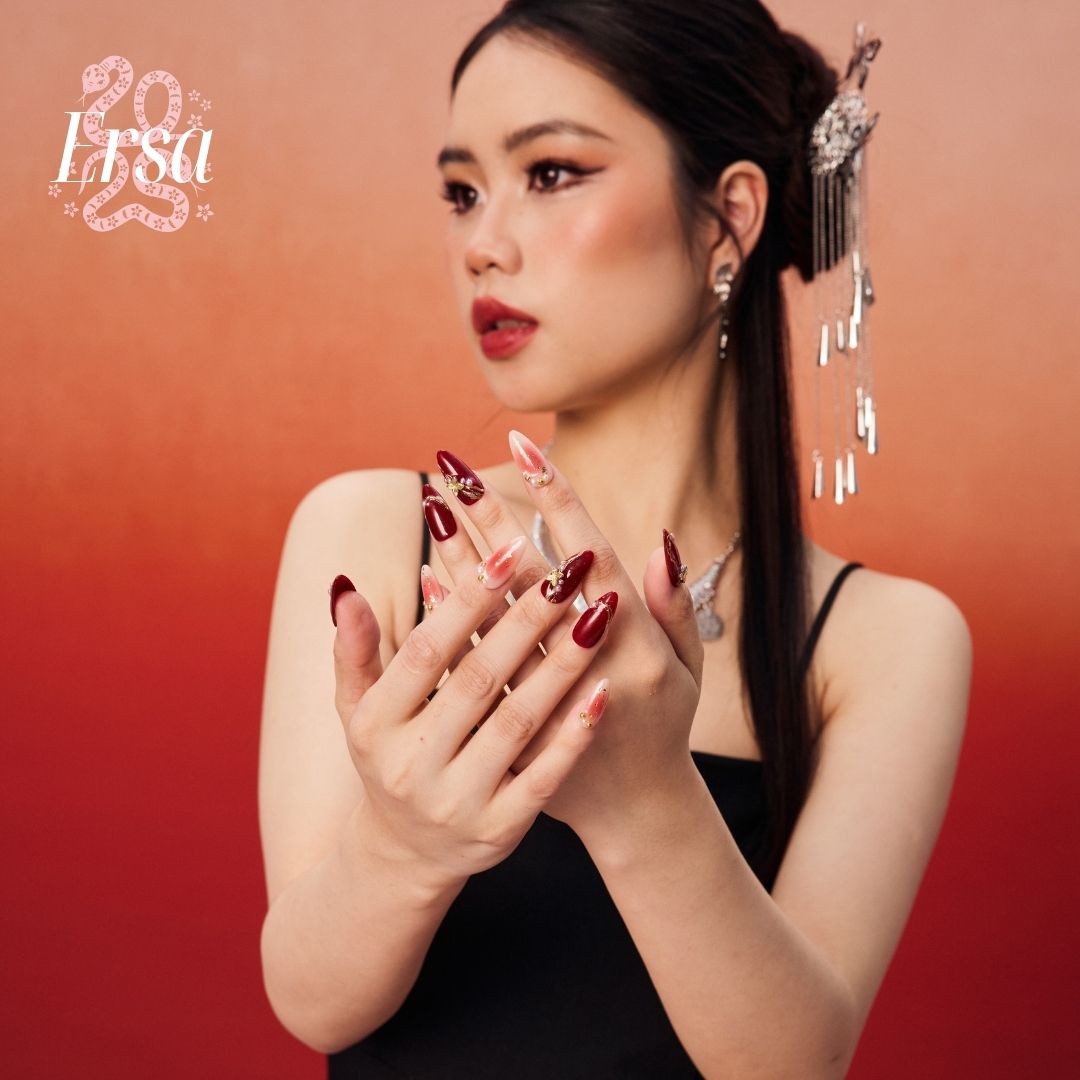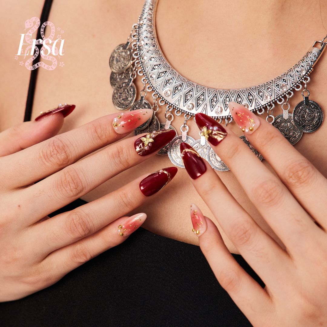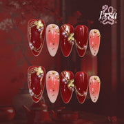 Embrace the vibrant energy of the Snake Year with The Good Days press-on nails. Featuring a rich red base, these nails are adorned with luxurious gold foil, delicate pearls, and tiny golden beads for an elegant touch. The design is further enhanced by irregular gold lines and charming gold flower accents, creating a bold yet refined look. Perfect for those seeking a standout, symbolic style.