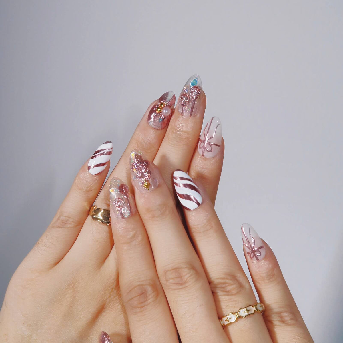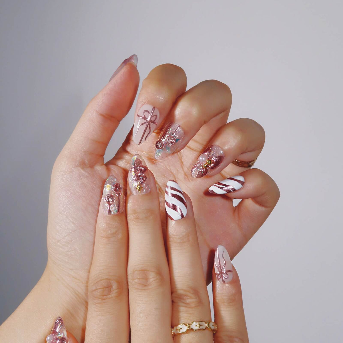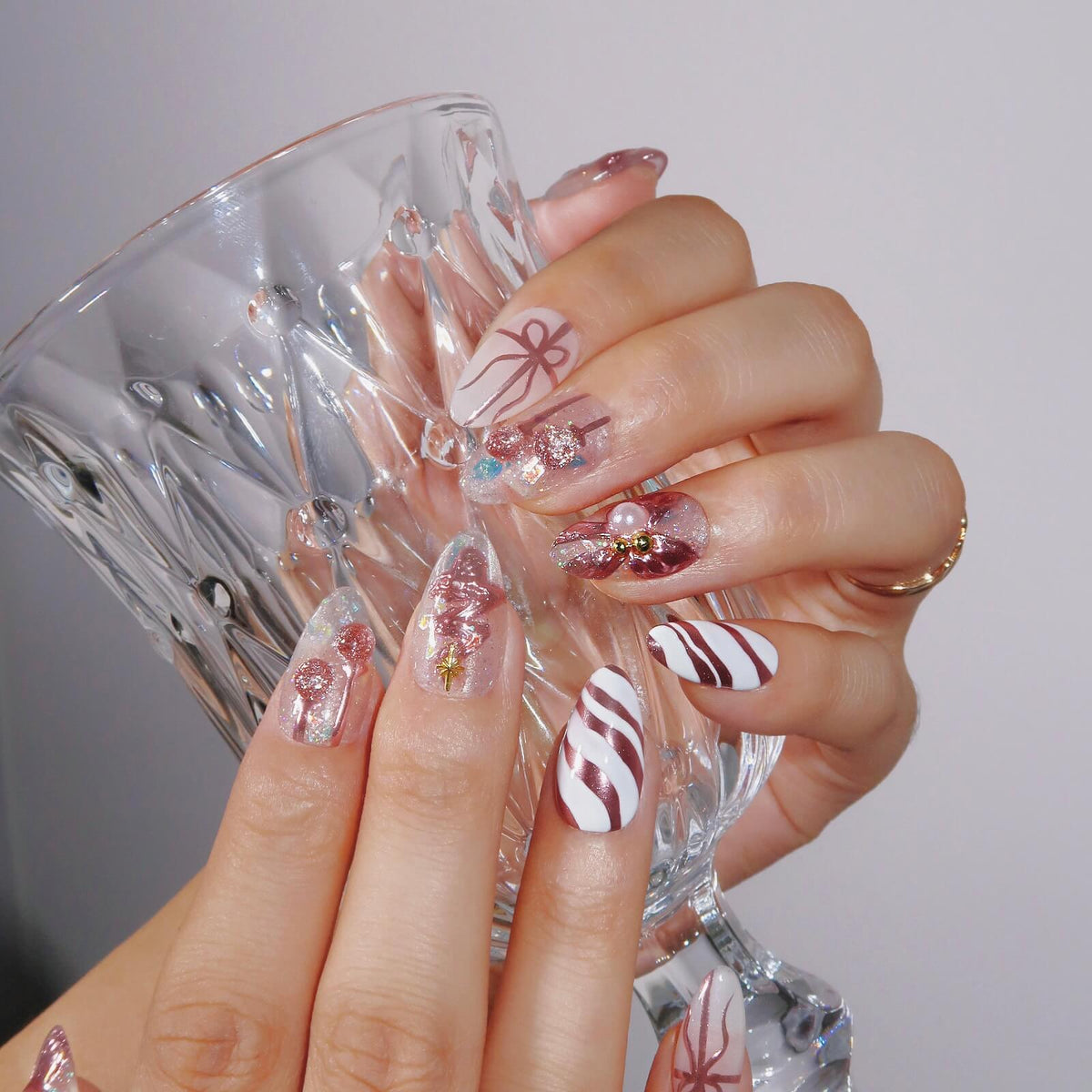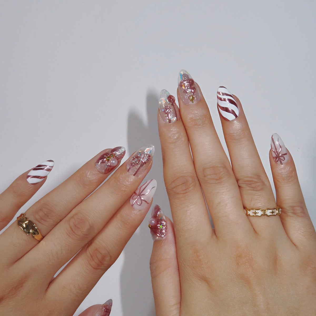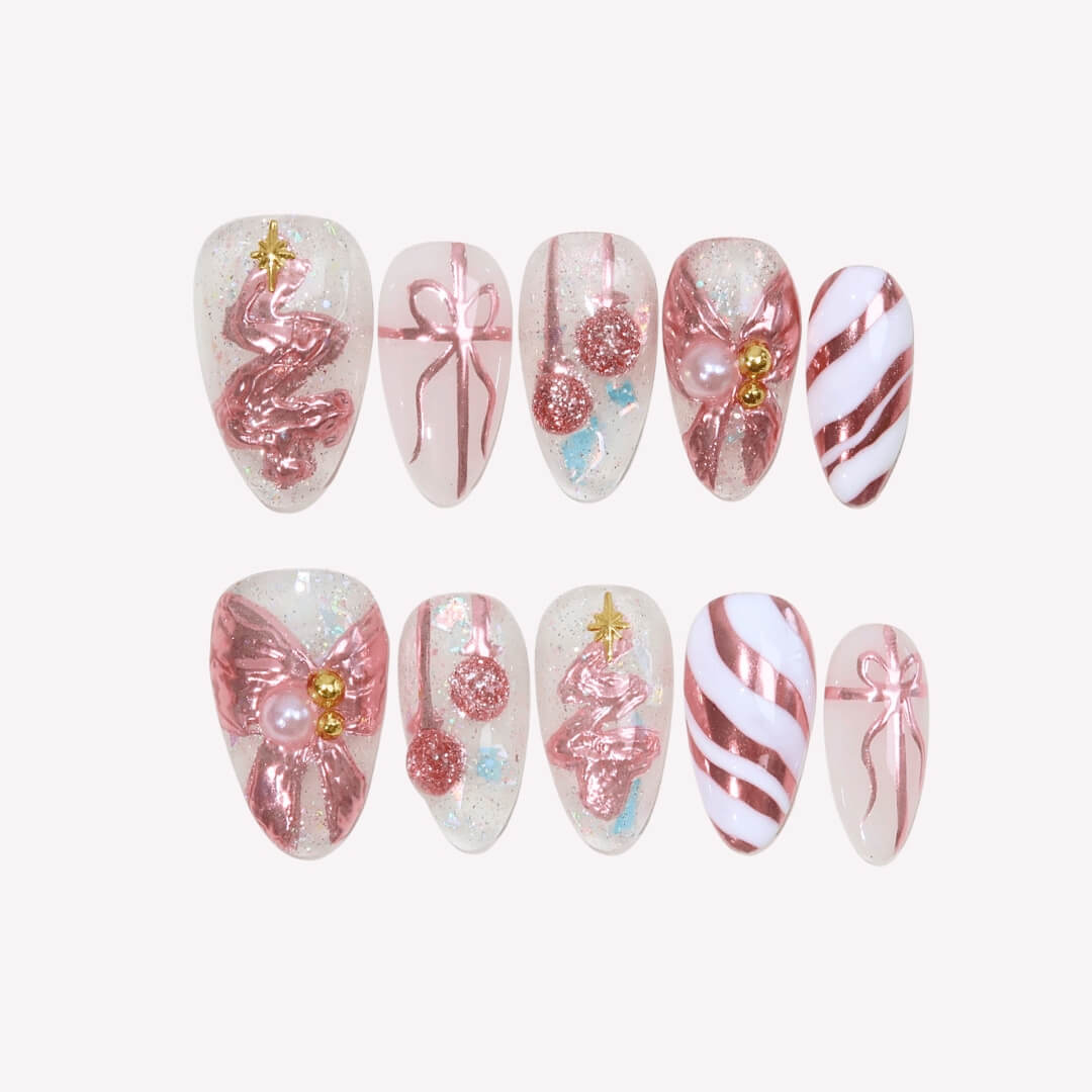 Under the Mistletoe by Ersa Nails brings holiday magic to your fingertips. With a delicate sheer white base and soft pink as the main color, this set is enhanced with dreamy glitter accents. Christmas tree, bow, and other festive motifs are thoughtfully placed throughout, while gold embellishments add a luxurious finish. This charming design perfectly captures the warmth and joy of the season, making it an ideal choice for celebrating the holidays in style.
