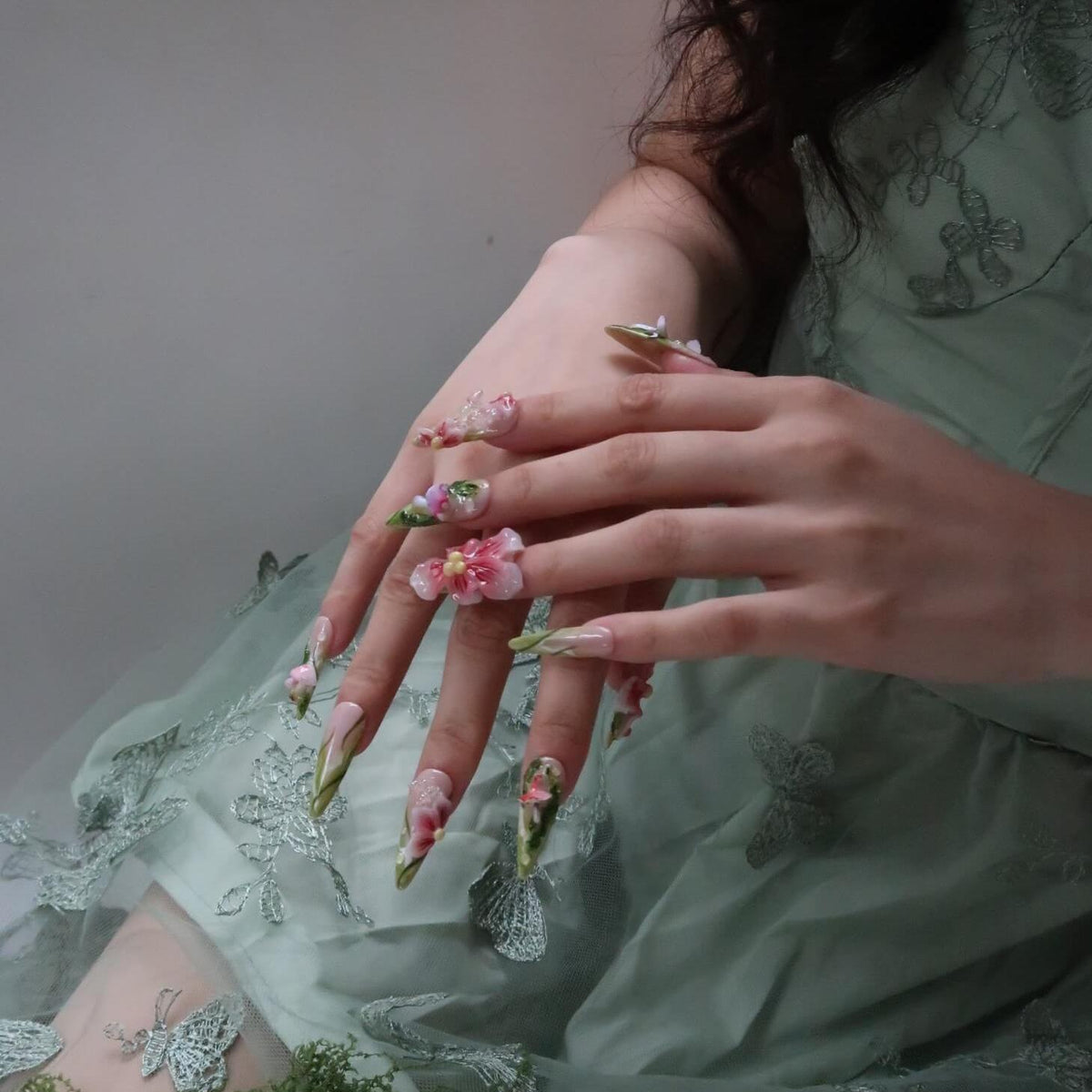 Embrace the magic of nature with swara Nails’ Wild Blossom press-on nails, where a soft nude base blends with lush green moss-like accents and playful pink details. Adorned with 3D flowers, whimsical mushrooms, and delicate butterflies, this design is brought to life with 3D water droplets for a fresh, enchanting touch. Lightweight, durable, and effortlessly unique, these press-on nails let you channel the beauty of a wild forest—perfect for nature lovers and trendsetters alike. With Ersa Nails, let your fingertips bloom with untamed elegance.