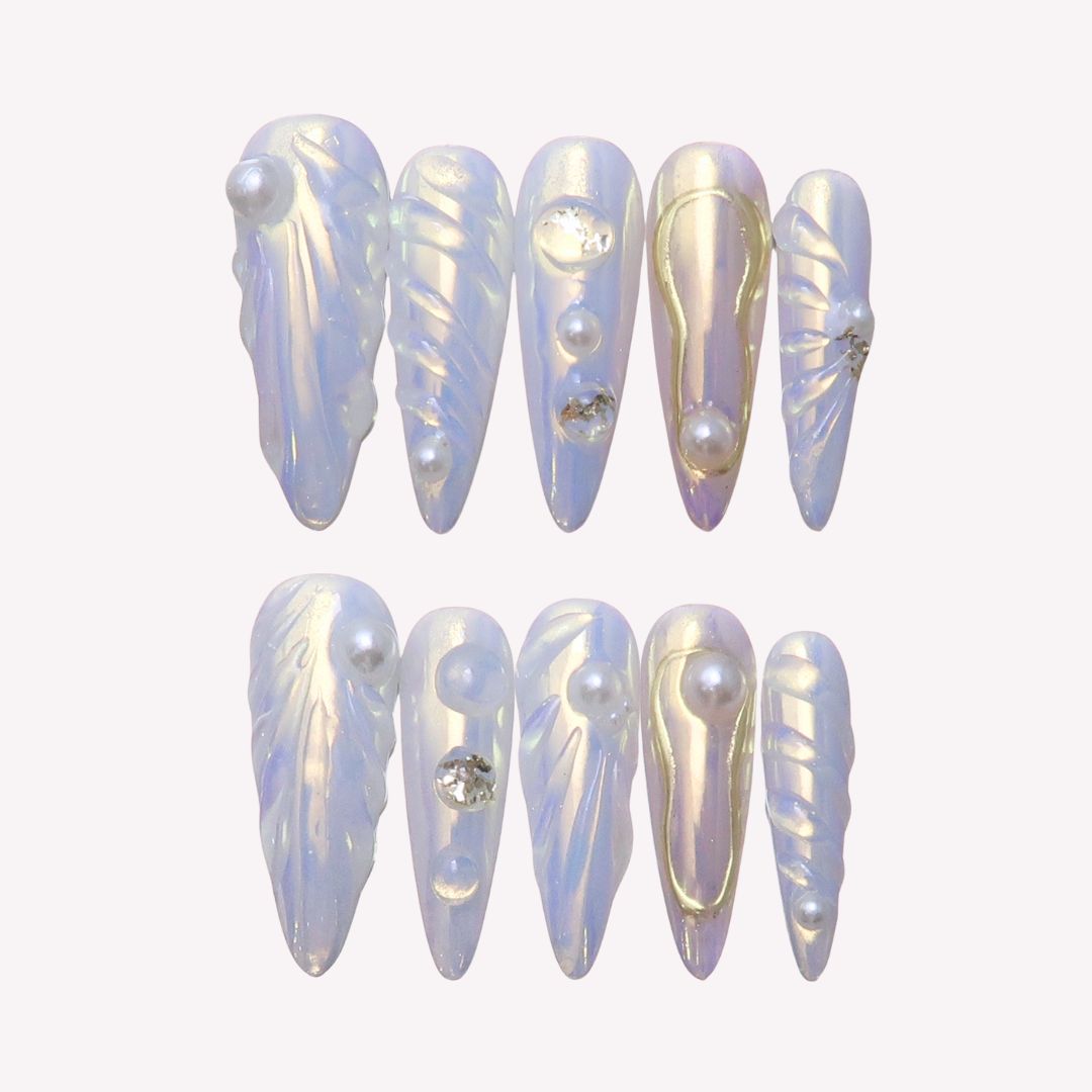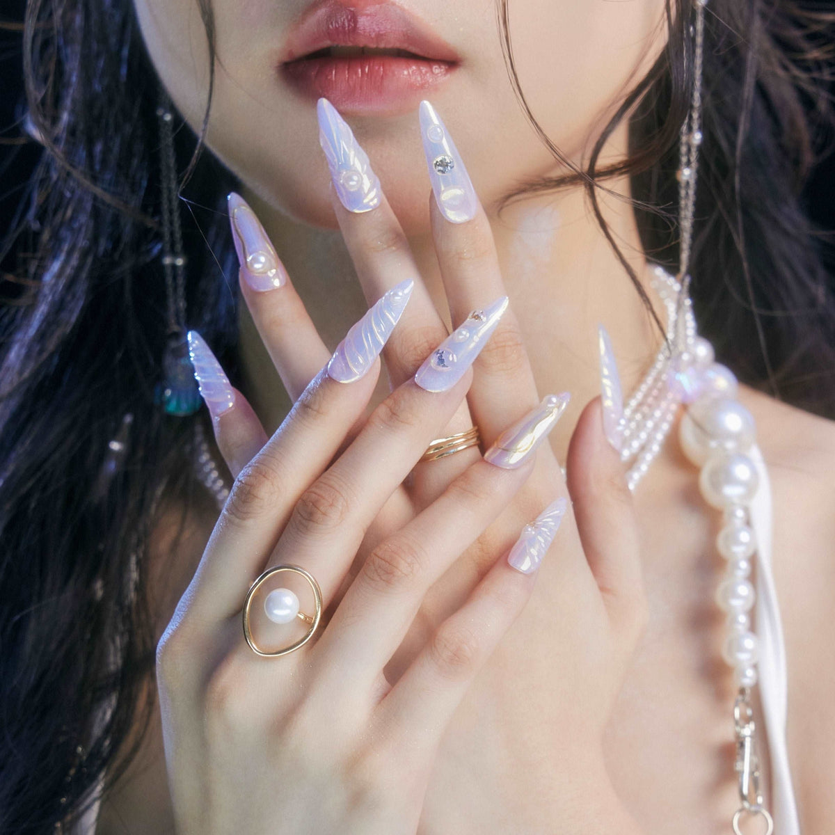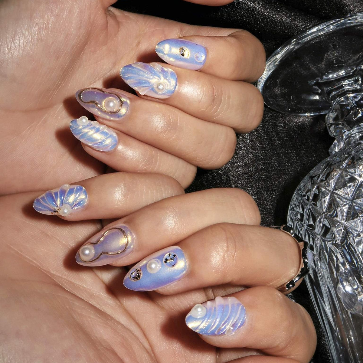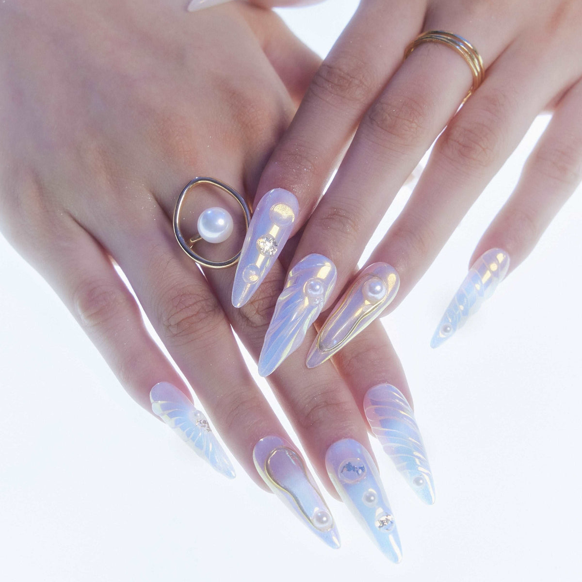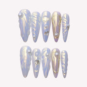 Azure Haze from Ersa Nails captures the essence of a serene sky where gentle white clouds drift across the tranquil blue expanse. Each nail is a canvas, graced with a delicate blend of white and a hint of azure, creating a dreamlike effect. The gentle placement of gems adds a touch of morning dew sparkle, reminiscent of the first light of dawn reflecting off a calm sea. This set is perfect for those who carry the peace of the sky with them, offering a breath of fresh air to any ensemble.