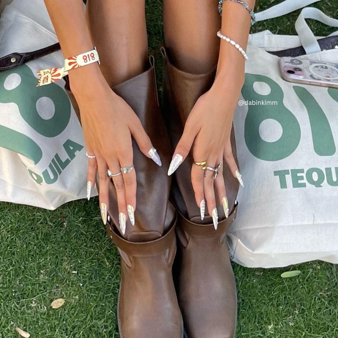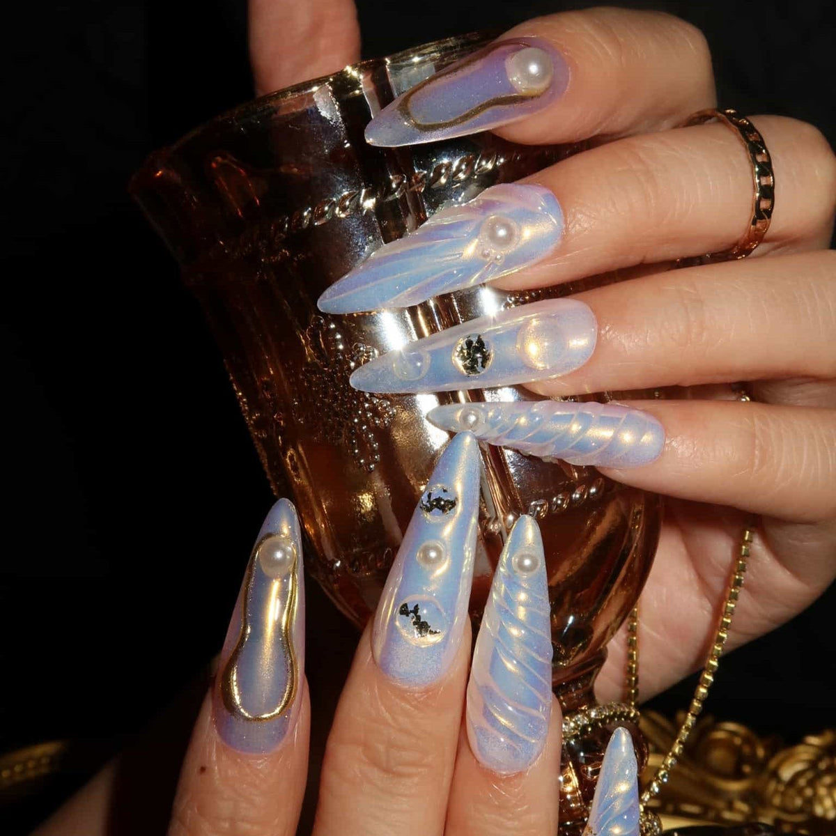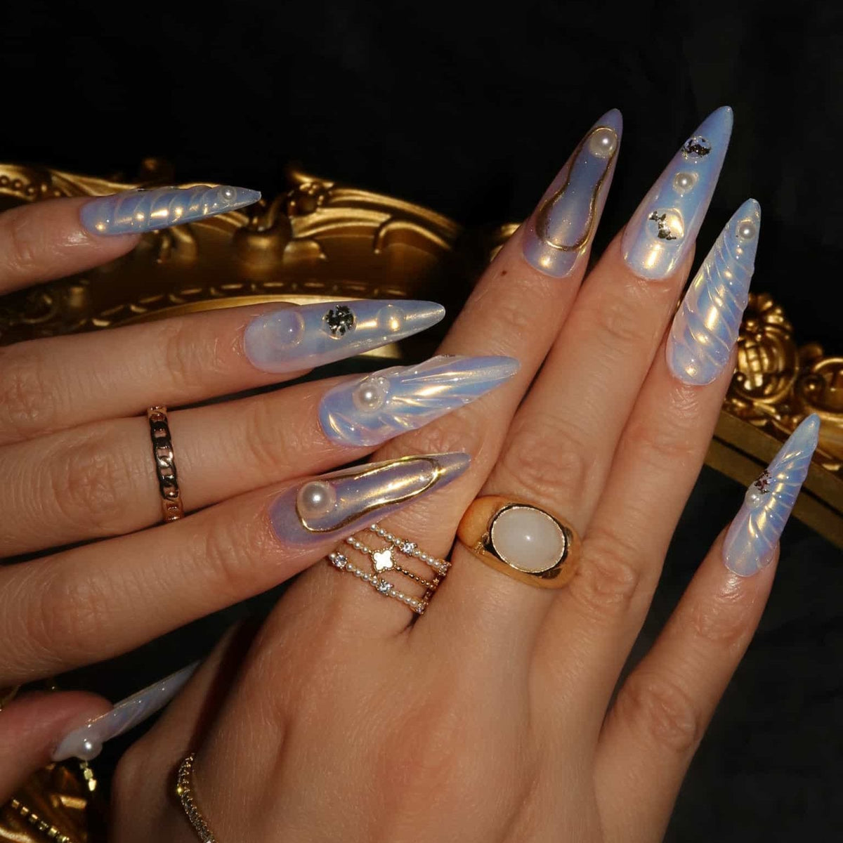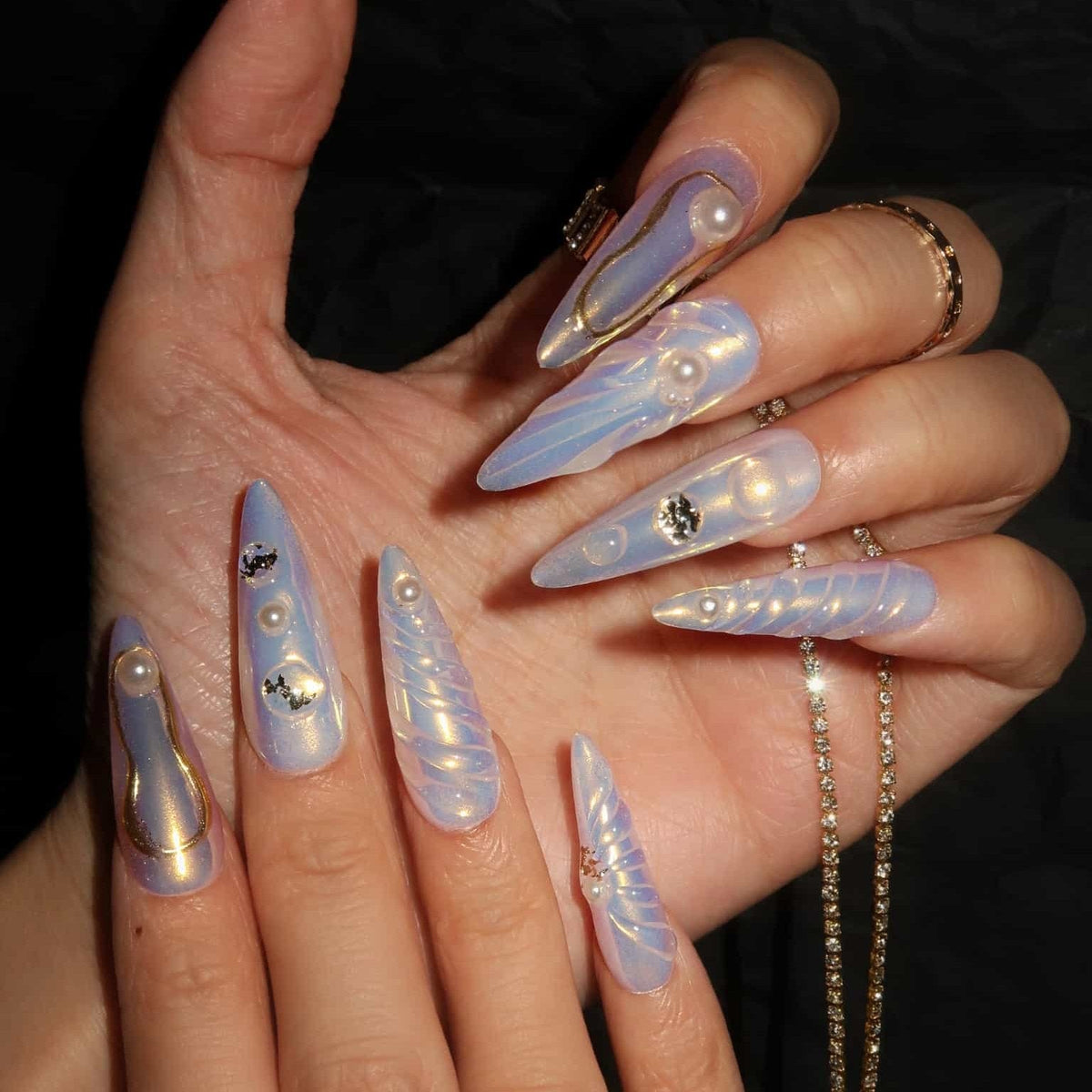 Azure Haze from Ersa Nails captures the essence of a serene sky where gentle white clouds drift across the tranquil blue expanse. Each nail is a canvas, graced with a delicate blend of white and a hint of azure, creating a dreamlike effect. The gentle placement of gems adds a touch of morning dew sparkle, reminiscent of the first light of dawn reflecting off a calm sea. This set is perfect for those who carry the peace of the sky with them, offering a breath of fresh air to any ensemble.