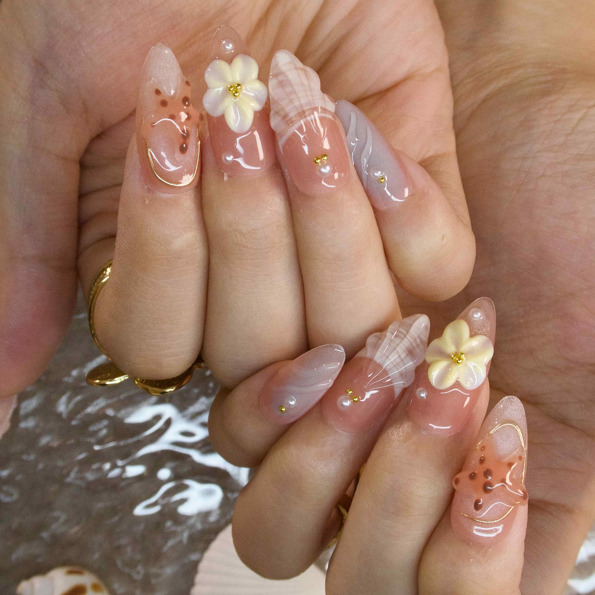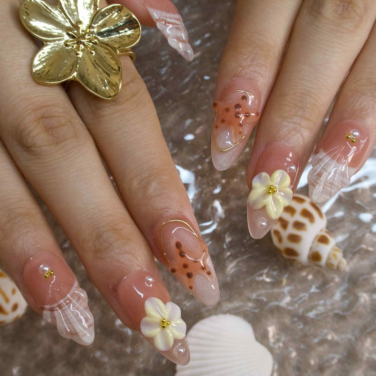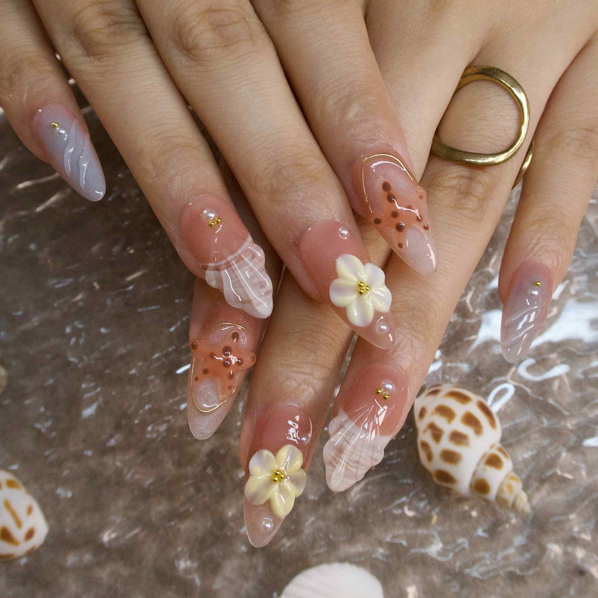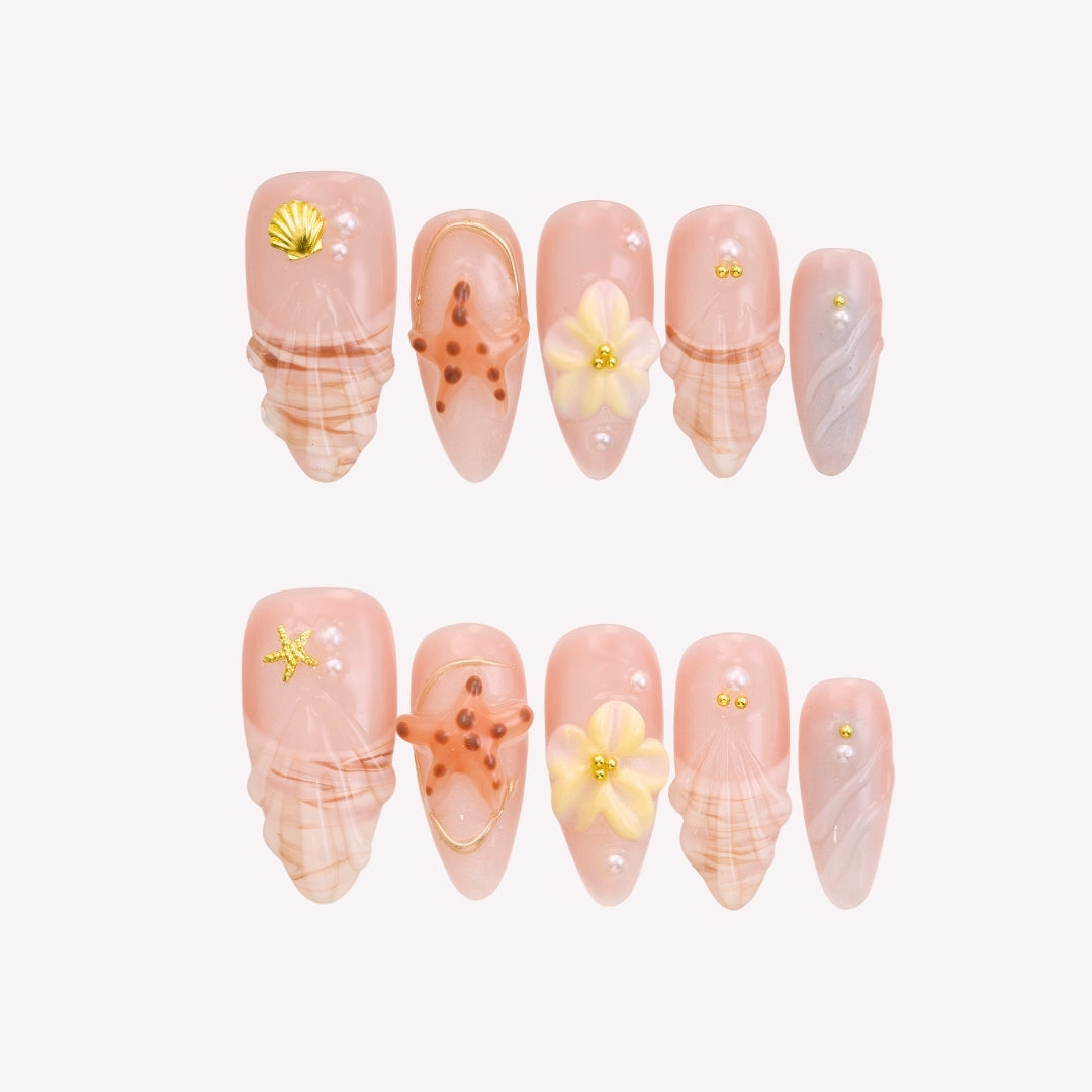 Bay Breeze by tonail Nails spins a serene, seaside - loving tale. On a soft, sandy - toned base, pops of peach and shell - inspired hues blend. Adorned with delicate starfish, dainty seashells, and tiny floral motifs, the design evokes the laid - back charm of a beach at sunset, where gentle breezes carry the scent of salt and summer. The fresh, coastal - inspired elements radiate a carefree, vacation - ready elegance, perfect for infusing daily looks with a touch of seaside - bohemian allure. Pair it with a flowy cotton dress, a wide - brimmed straw hat, or turquoise - toned jewelry to complete the effortlessly chic, beach - bound vibe.