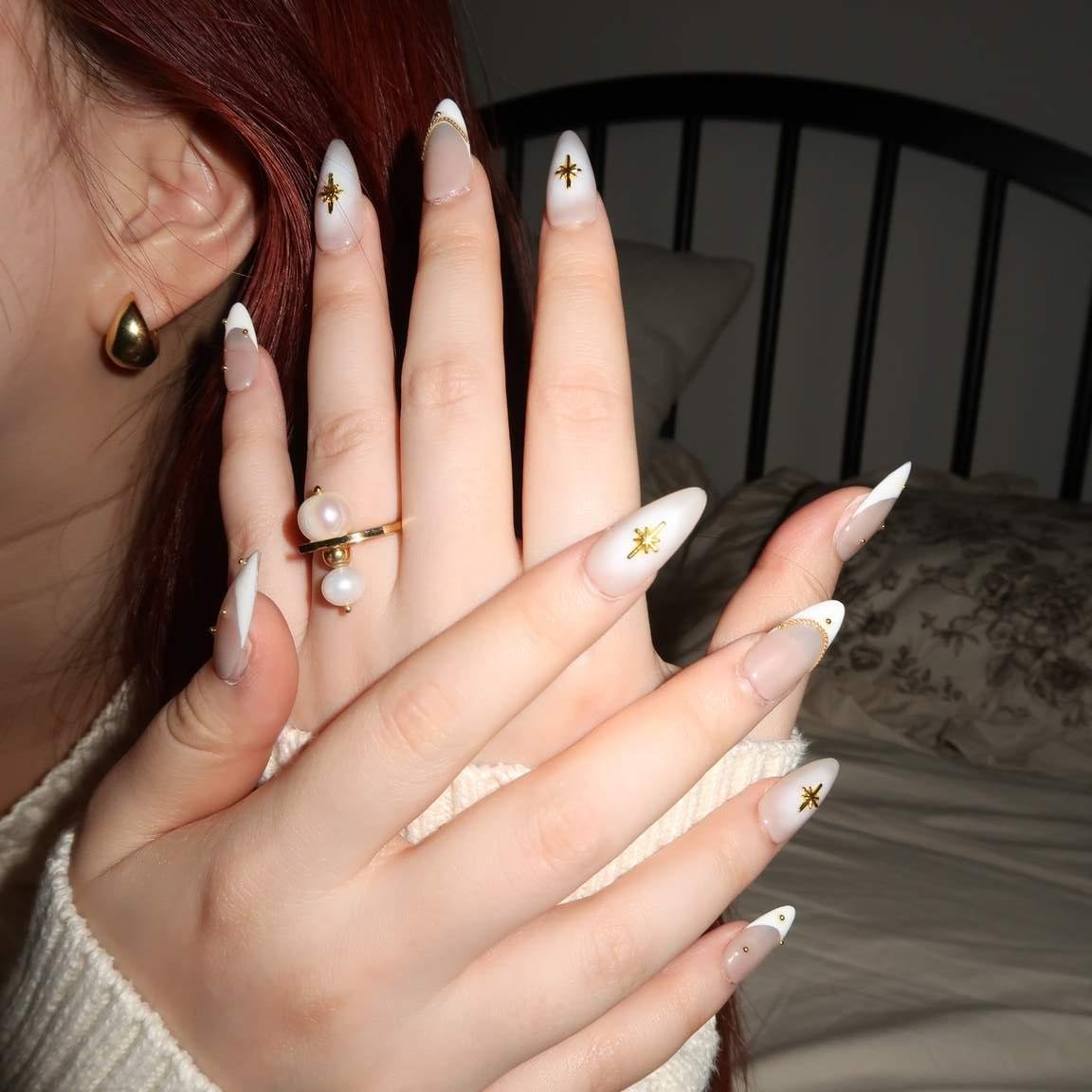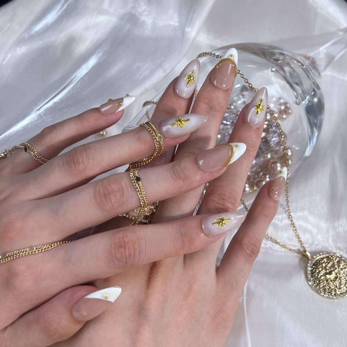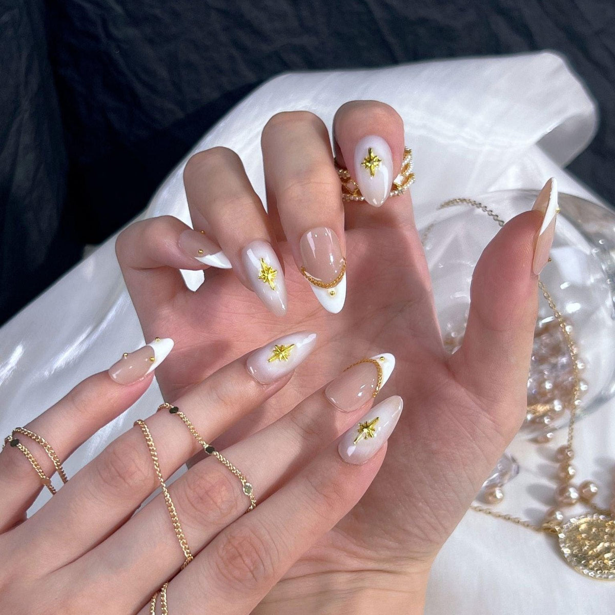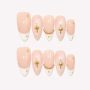 Presenting Celestial Star from swara - an embodiment of heavenly elegance and luxury. Each nail boasts a creamy, translucent base adorned with shimmering gold cross stars. Delicate golden chains and studs accentuate their divine charm, making each piece a work of art. Capturing Ersa's legacy of unparalleled beauty and craftsmanship, these nails aren't merely accessories - they're a statement. Dive into the cosmic allure with Ersa and elevate your fashion game to stellar heights.