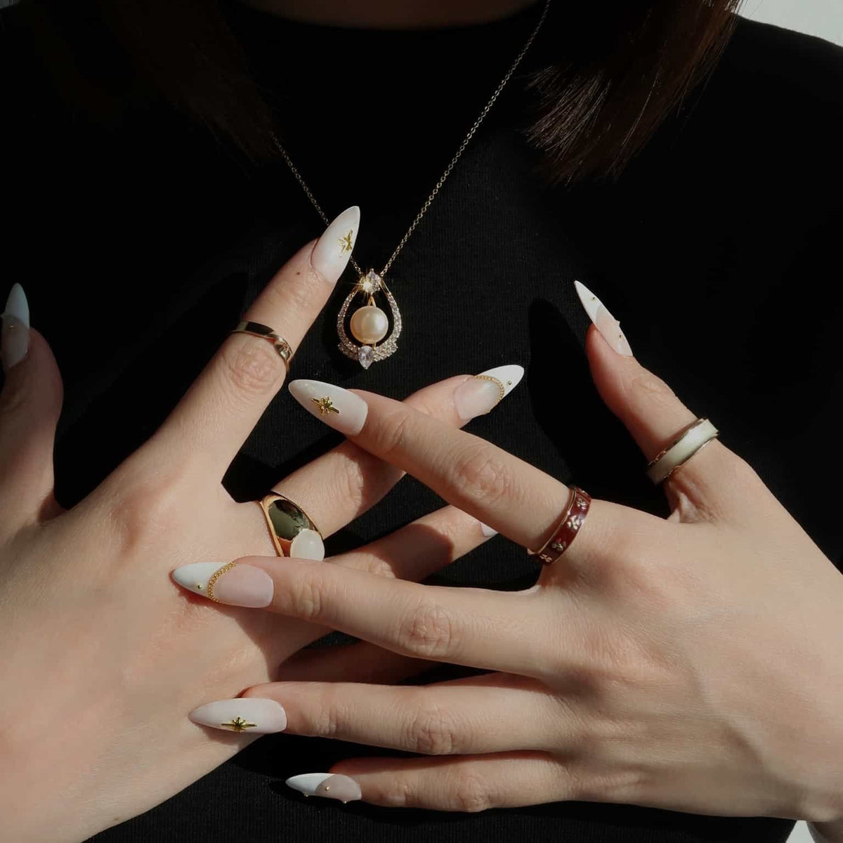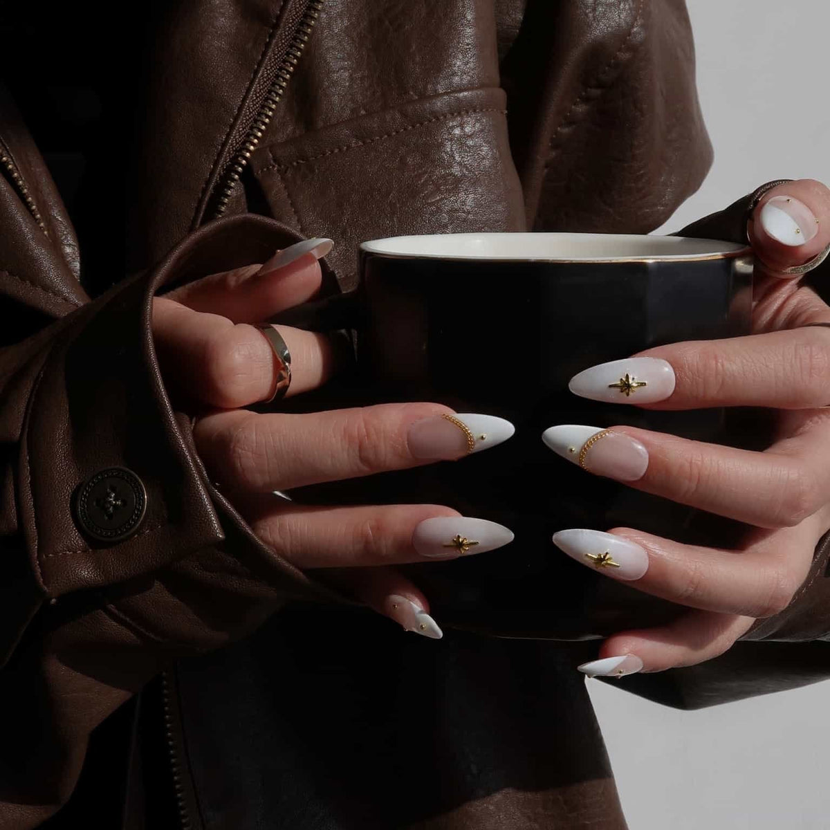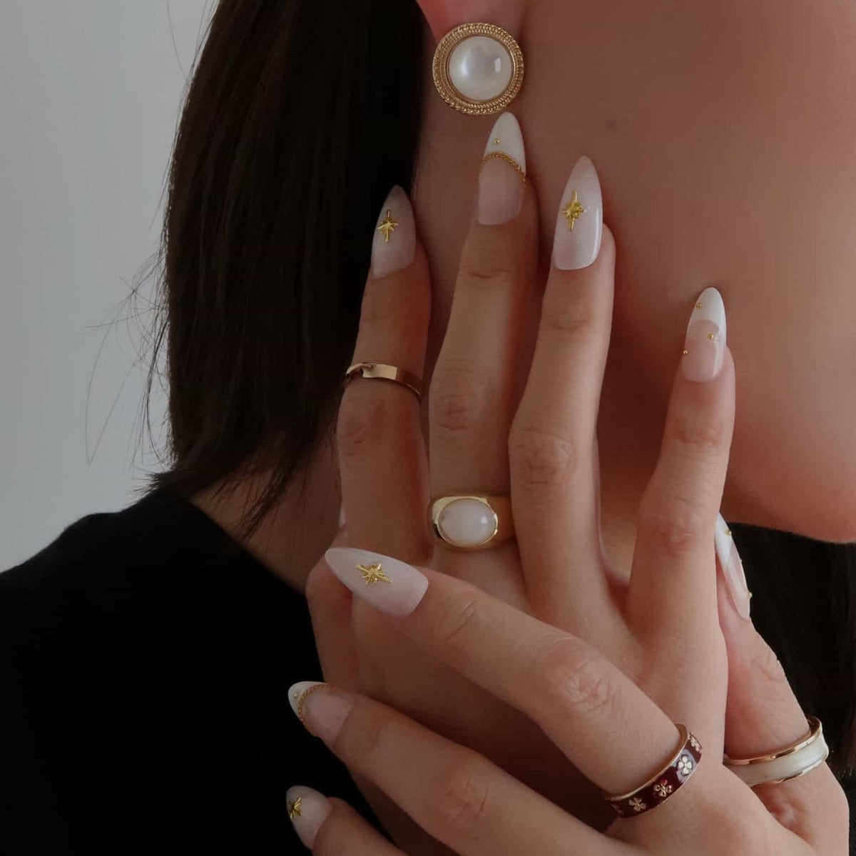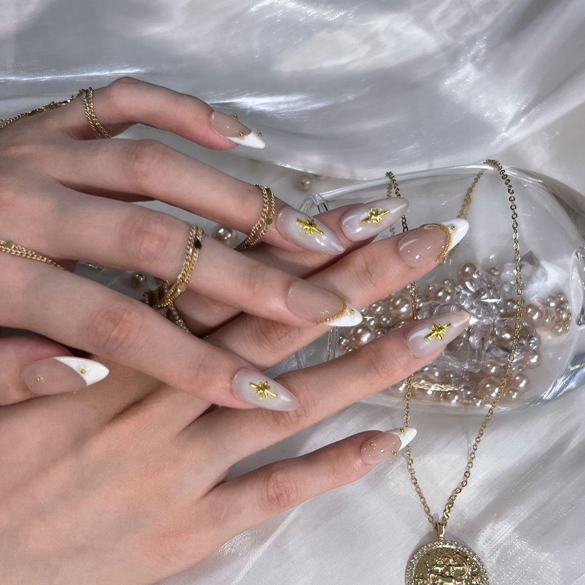 Presenting Celestial Star from swara - an embodiment of heavenly elegance and luxury. Each nail boasts a creamy, translucent base adorned with shimmering gold cross stars. Delicate golden chains and studs accentuate their divine charm, making each piece a work of art. Capturing Ersa's legacy of unparalleled beauty and craftsmanship, these nails aren't merely accessories - they're a statement. Dive into the cosmic allure with Ersa and elevate your fashion game to stellar heights.